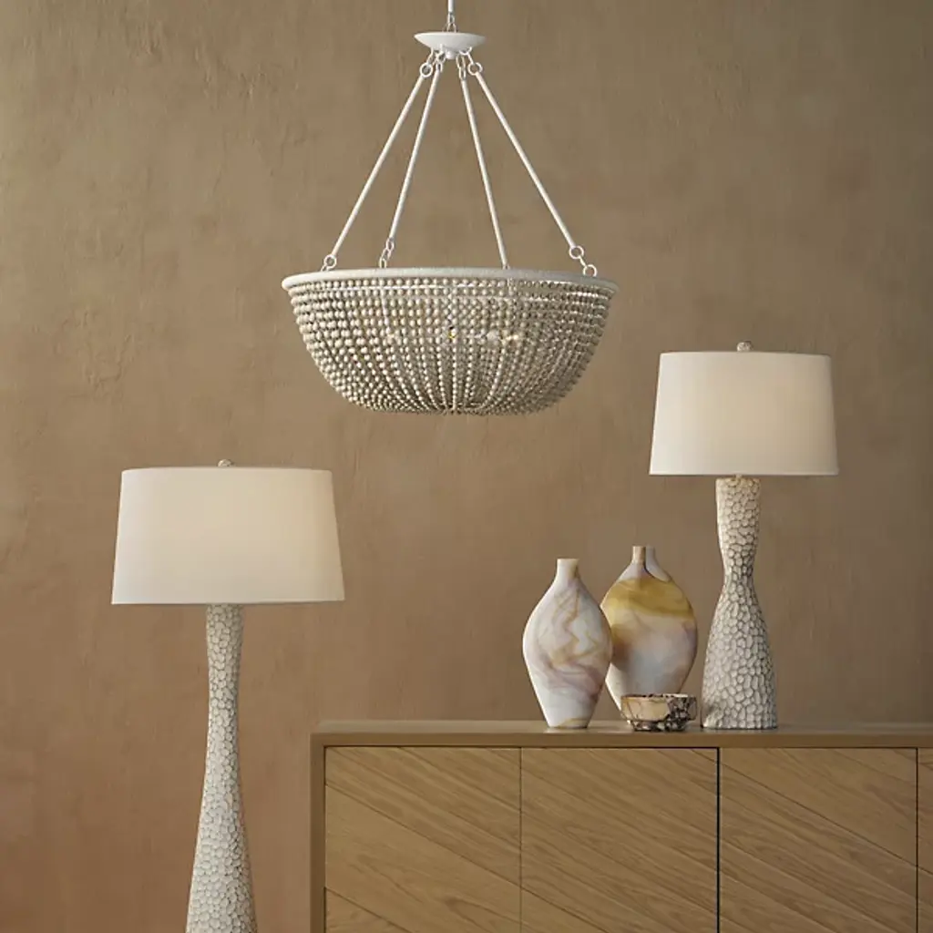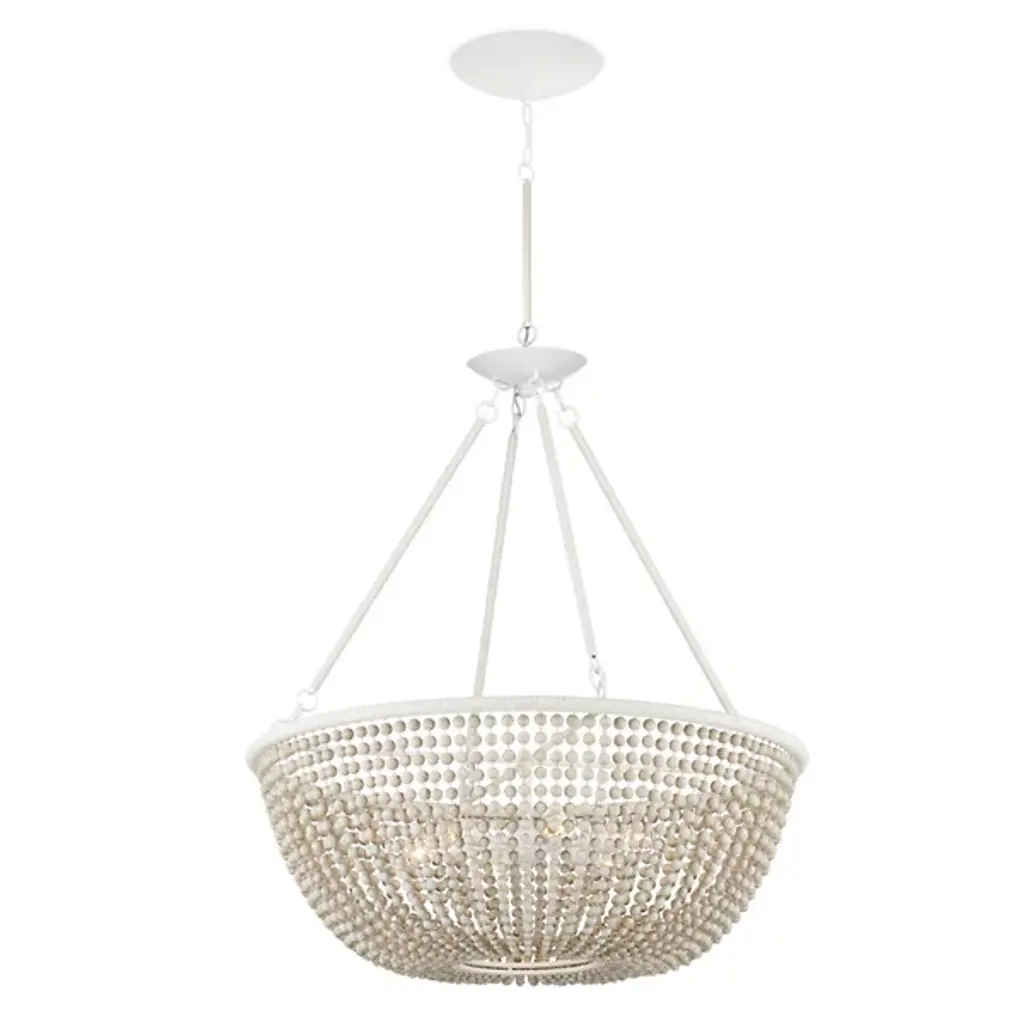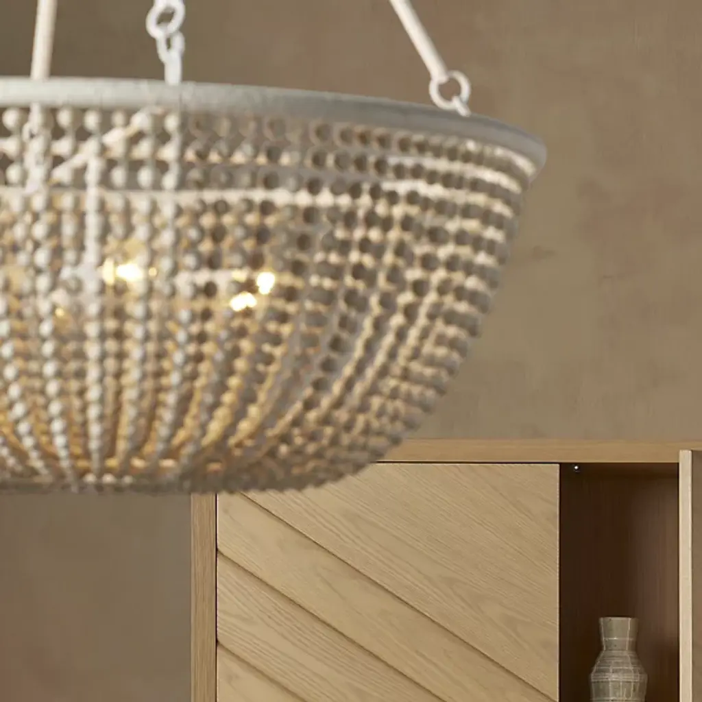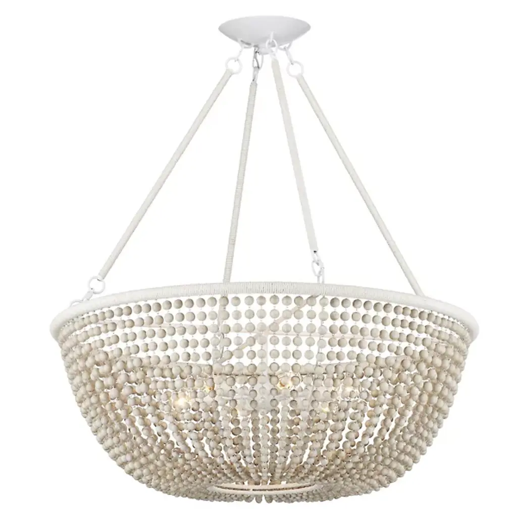 The Wychwood Chandelier from Currey & Company pairs handpainted wooden beads with kraft paper twine to create an artisanal masterpiece. The carefully crafted swags drape between rings while multiple materials work in harmony - from wrought iron to natural wood beads. This versatile fixture can be installed as either a chandelier or semi-flush mount using the included hardware. The design celebrates handcraftsmanship through its intricate details and thoughtful material combinations. Its adjustable hanging options ensure perfect placement in any setting.