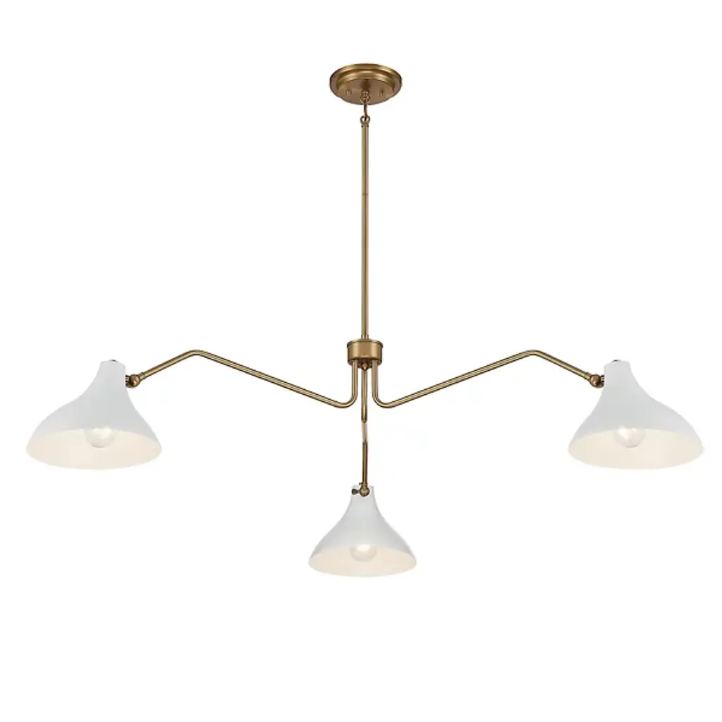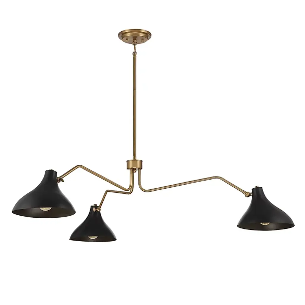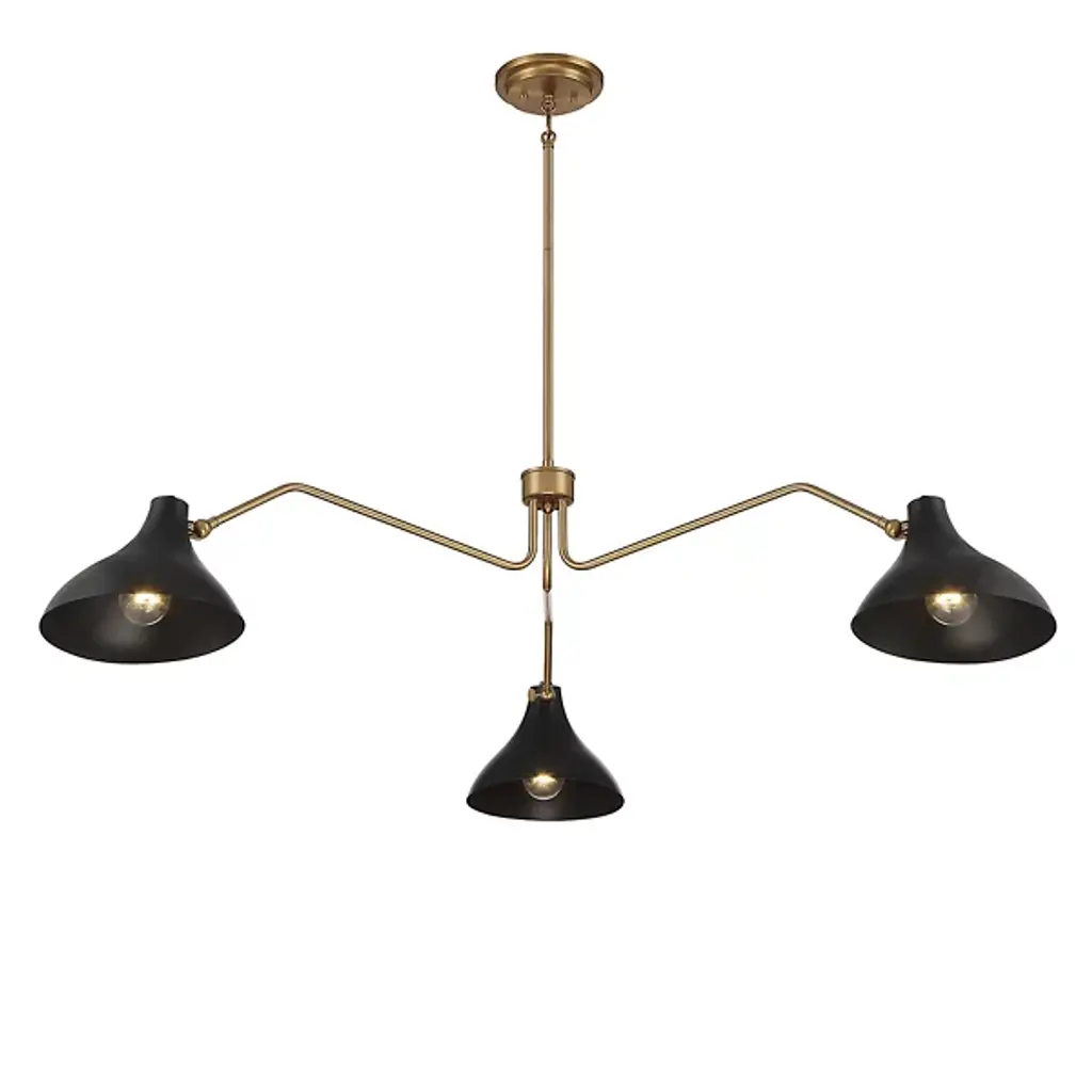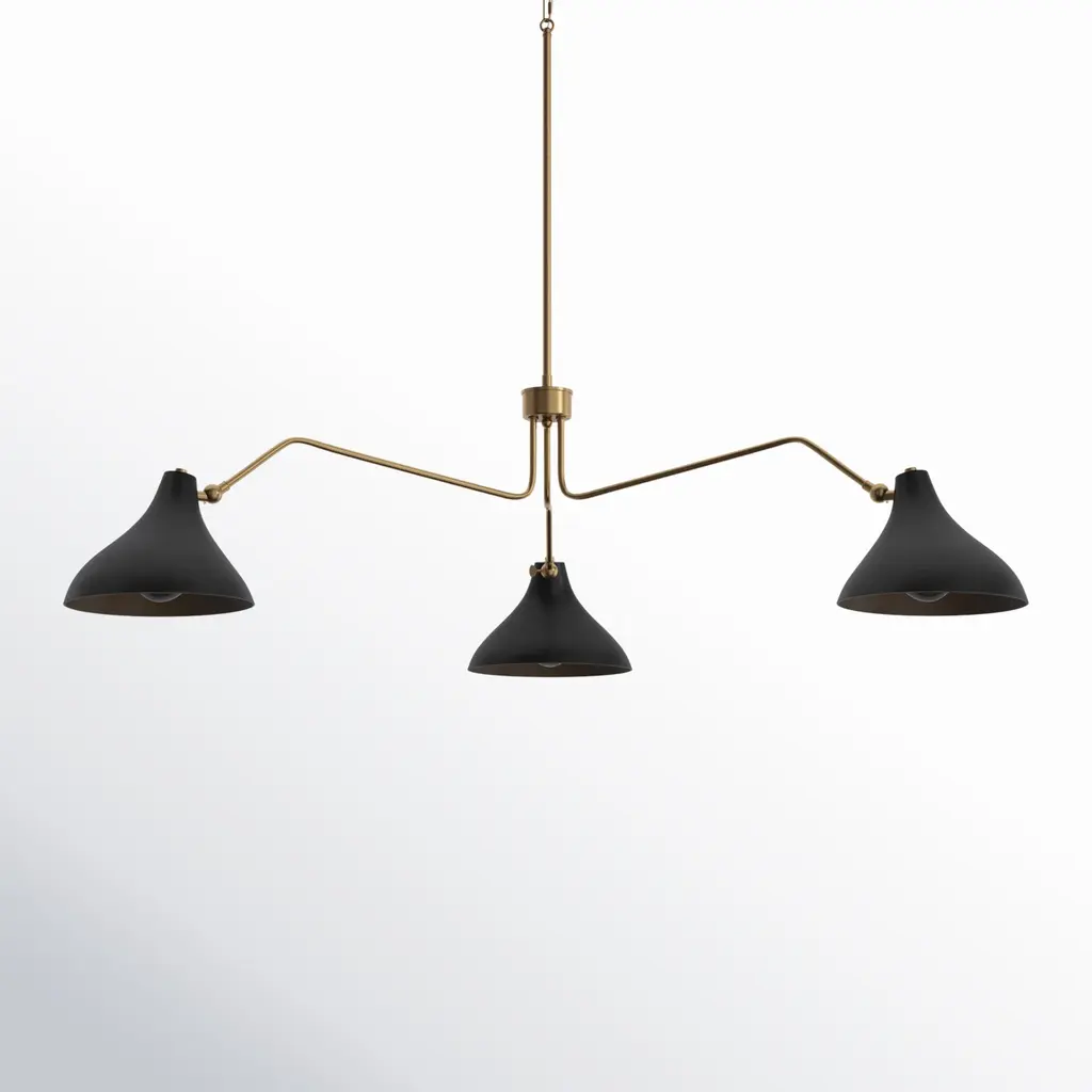 The Yale Chandelier from Alder & Ore embodies an intricate transitional style with its stepped canopy and short chain supporting a single downrod. Three arms extend from the lower hub, adorned with retro, scoop-style shades that encase the lamping. The robust metal chandelier blends Mid-Century Modern and contemporary styles, making it a memorable addition to any modern interior space. Its detailed design and flaring silhouette add a touch of sophistication to any room.