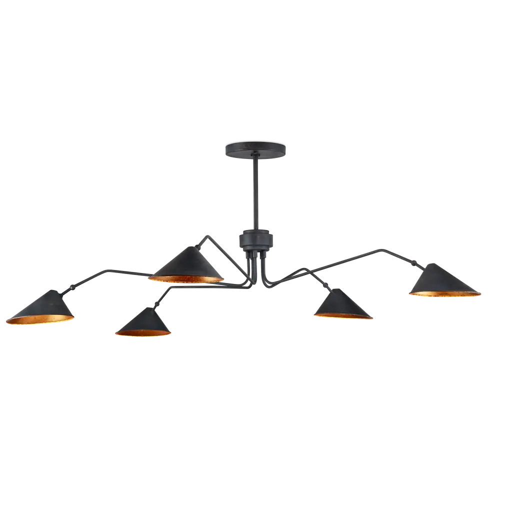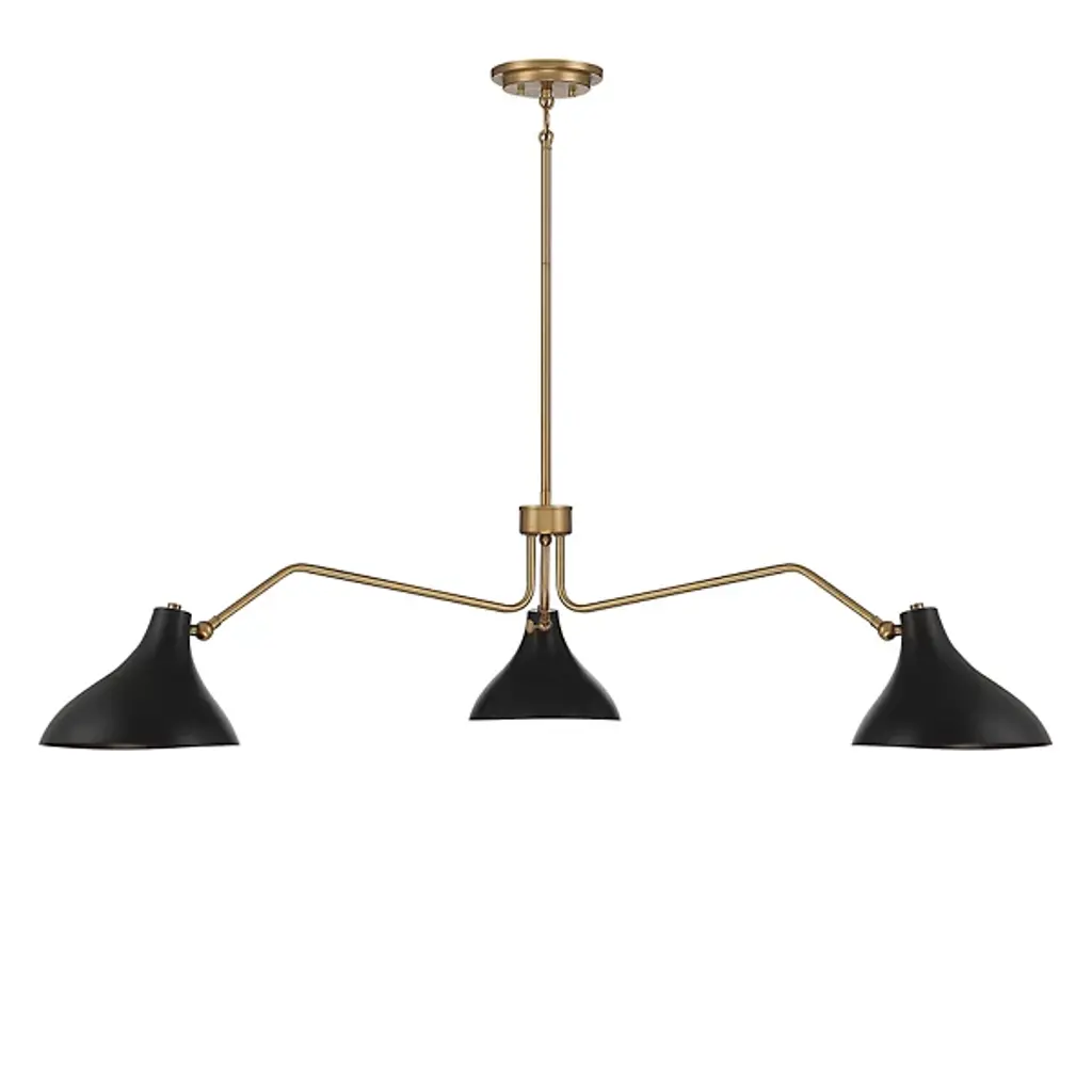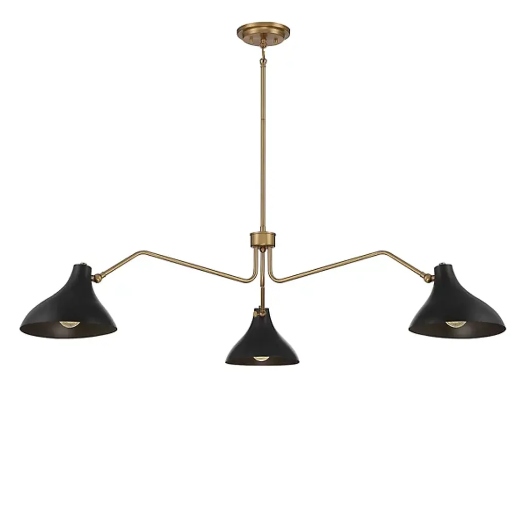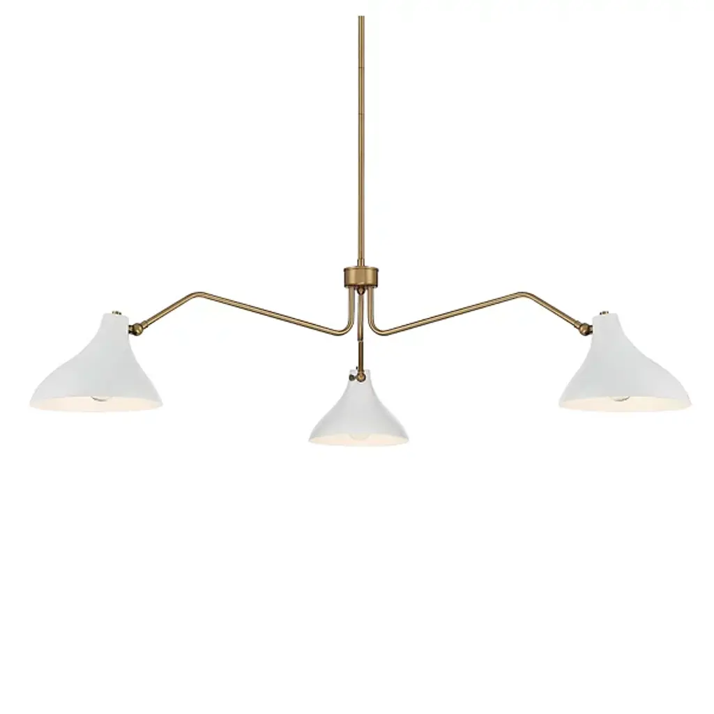 The Yale Chandelier from Alder & Ore embodies an intricate transitional style with its stepped canopy and short chain supporting a single downrod. Three arms extend from the lower hub, adorned with retro, scoop-style shades that encase the lamping. The robust metal chandelier blends Mid-Century Modern and contemporary styles, making it a memorable addition to any modern interior space. Its detailed design and flaring silhouette add a touch of sophistication to any room.