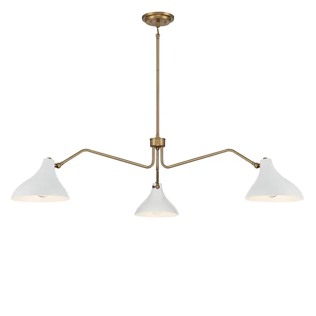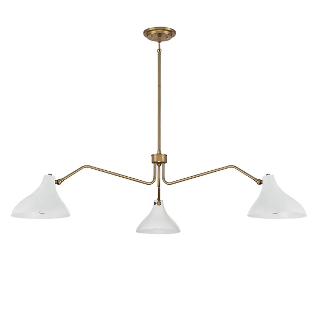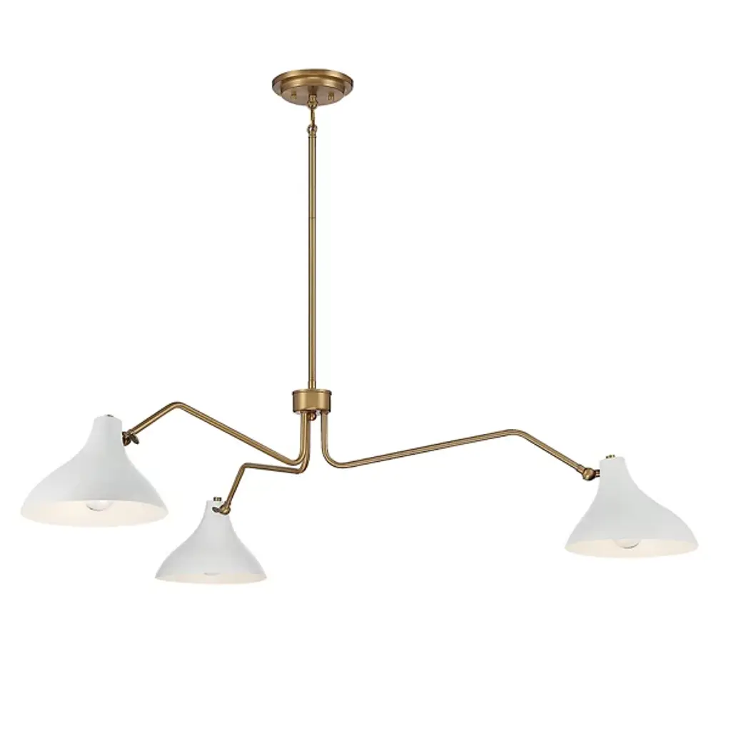 The Yale Chandelier from Alder & Ore embodies an intricate transitional style with its stepped canopy and short chain supporting a single downrod. Three arms extend from the lower hub, adorned with retro, scoop-style shades that encase the lamping. The robust metal chandelier blends Mid-Century Modern and contemporary styles, making it a memorable addition to any modern interior space. Its detailed design and flaring silhouette add a touch of sophistication to any room.