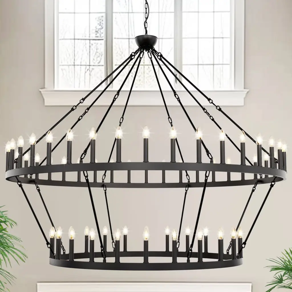 This KD style wagon wheel chandelier features 24 heads arranged in a single tier, combining rustic charm with elegant black and gold finish. Designed for use with E12 base bulbs (not included), it offers ample lighting and a striking centerpiece for dining rooms, living spaces, or entryways. Perfect for those seeking a vintage-inspired yet sophisticated lighting solution.