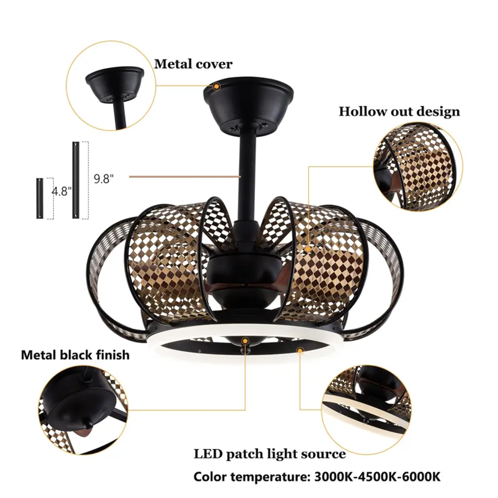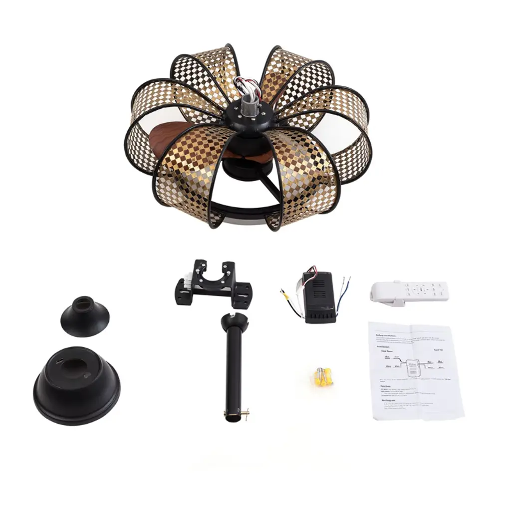 The exquisite ceiling fan lamp not only adds elegant and luxurious style to the room but also creates a comfortable and warm home environment for you. The three-color adjustable LED ring light band allows you to easily adjust the light color according to your needs. At the same time, the ceiling fan lamp with the function of timing gives you a better experience. Specification Material: Iron Style: Retro Color: Black, Gold Process: High-temperature Baking Paint Voltage: 85-265V Power: 40W(Fan), 24W(Light) Efficiency: E Motor: Pure Copper Motor Light Source: LED(Included) Applicable Area: 10-15m2/107.63-161.45ft2 Timing: 1, 2, 4 h Fan Gears: 6 Light Colors: White, Yellow, Neutral Number of Lampshades: 6 Number of Fan Blades: 3 Mounting Type: Ceiling Mount Shape: Flower Lampshade Size: 49*49*20cm/19*19*7.87in LED Light Diameter: 30cm/11.81in Base Diameter: 15cm/5.9in Product Height: 45cm/20in, 37cm/15in Support Rod Height: 12cm/4.8in, 25cm/9.8in Package Included 1*Ceiling Fan Light 1*Remote Control 1*English User Manual All Accessories Needed For Installation