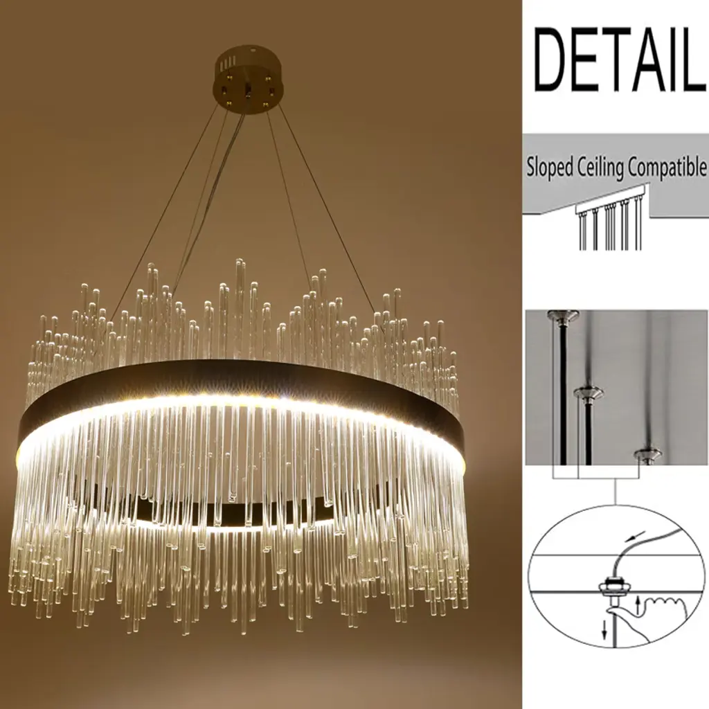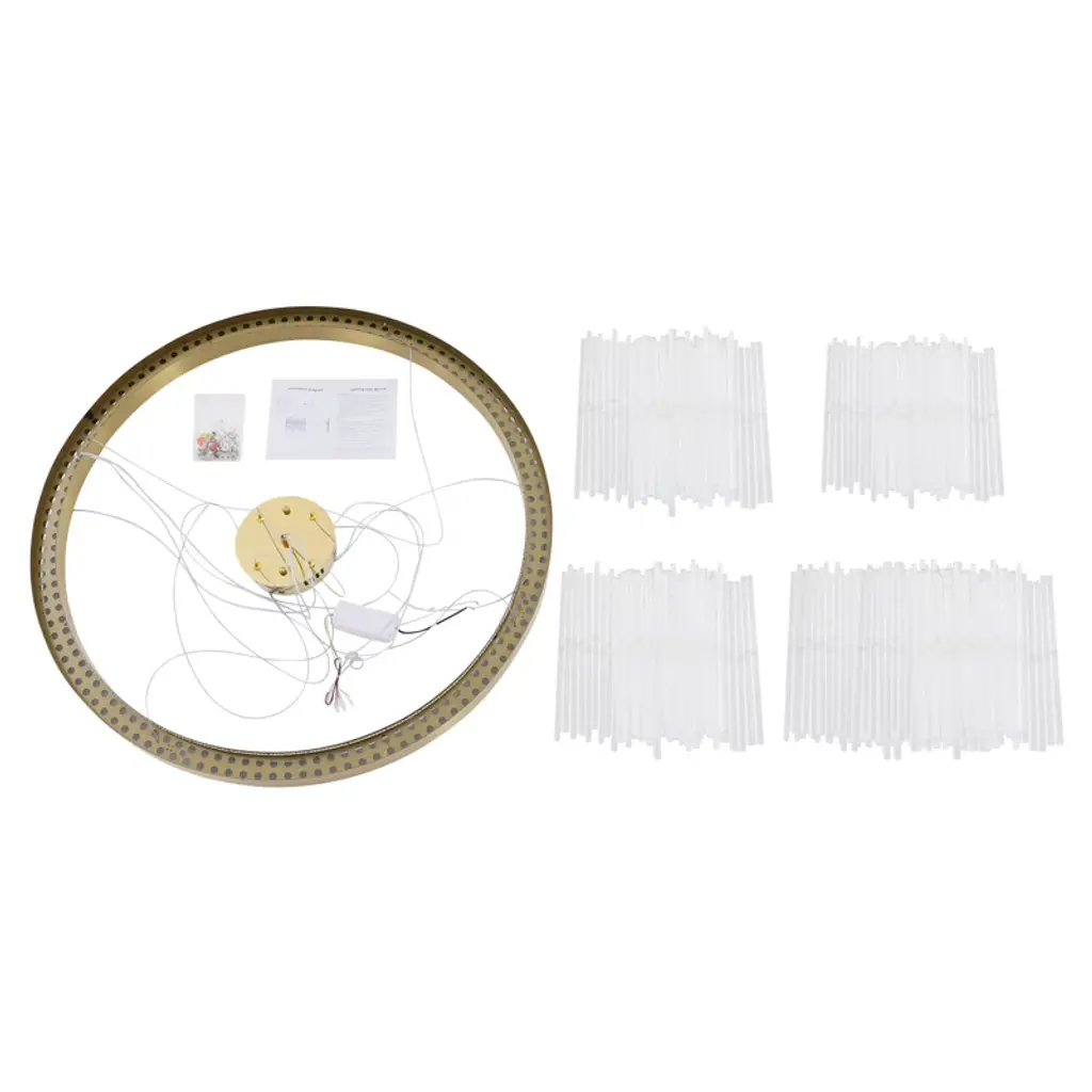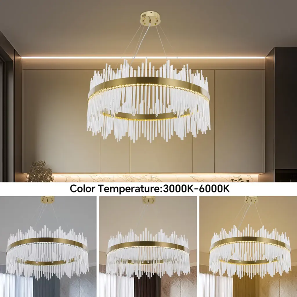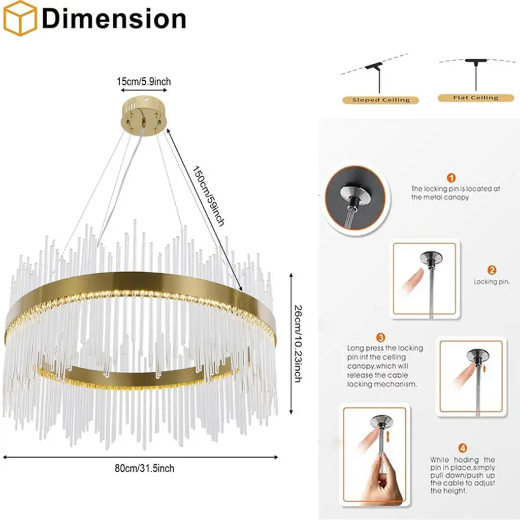 This stunning gold crystal chandelier is a true statement piece, blending luxury with brilliant illumination. Each meticulously crafted crystal catches the light, creating a dazzling, star-like effect that adds a touch of glamour and romance to any room. Constructed from premium electroplated metal and glass, it is built for lasting durability and features a powerful 48W LED that provides bright, adjustable lighting for spaces up to 215 square feet. You can easily switch between cool, neutral, and warm light colors using a standard wall switch to set the perfect mood. The chandelier's elegant design is complemented by practical features, including an adjustable chain for customizable height and a sturdy base for secure ceiling mounting. Easy to assemble, clean, and maintain, this exquisite fixture is an ideal choice for elevating the decor of living rooms, dining rooms, bedrooms, and more. Specification Material: Metal and Glass Color: Gold, Clear Style: Modern Mount Type: Ceiling Mount Assembly Required: Yes Voltage: 85-265V Efficiency: E Process: Electroplating Light Color: Cold, Neutral, Warm Light Source: LED Light Ring Switch Type: Wall Switch ( Not Included ) Power: 48W Color Temperature: 3000-6000K Irradiation Area: 10-20m²/107.64 -215.28ft² Base Diameter: 15cm/5.9in Chain Length: 150cm/59in Crystal Strip Length: 26cm/10.23in Chandelier Diameter: 80cm/31.5in