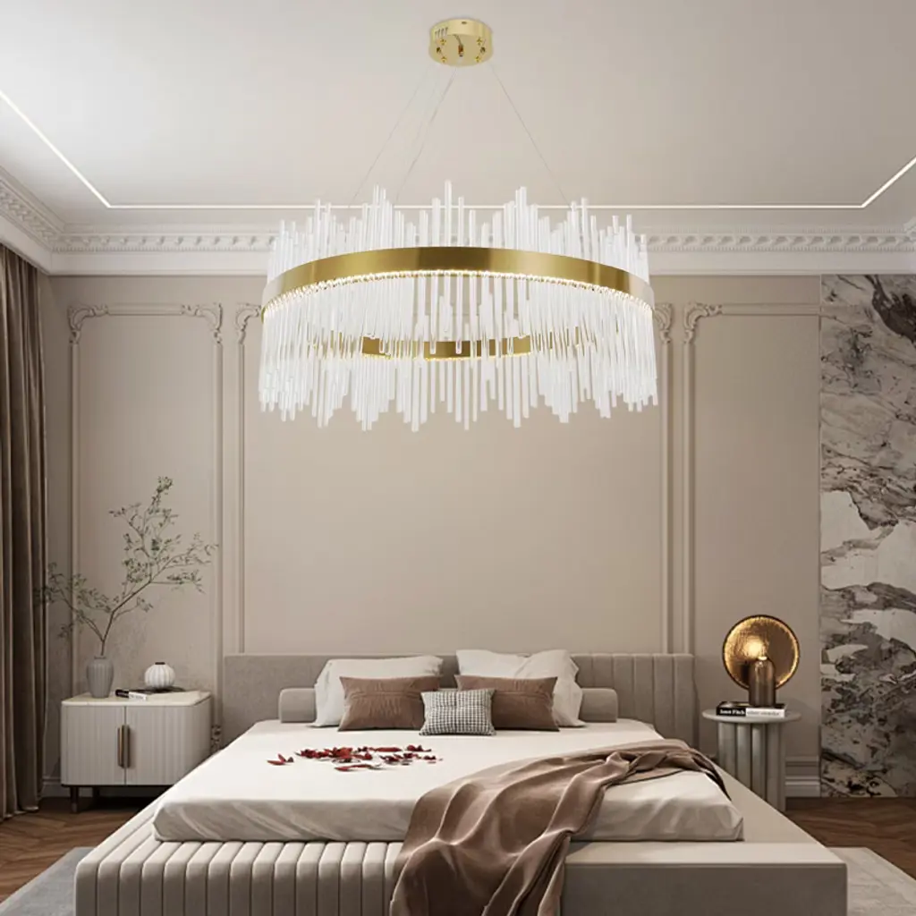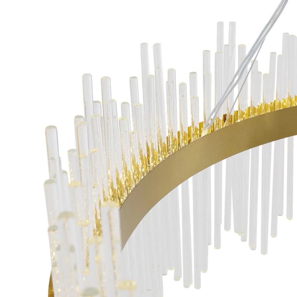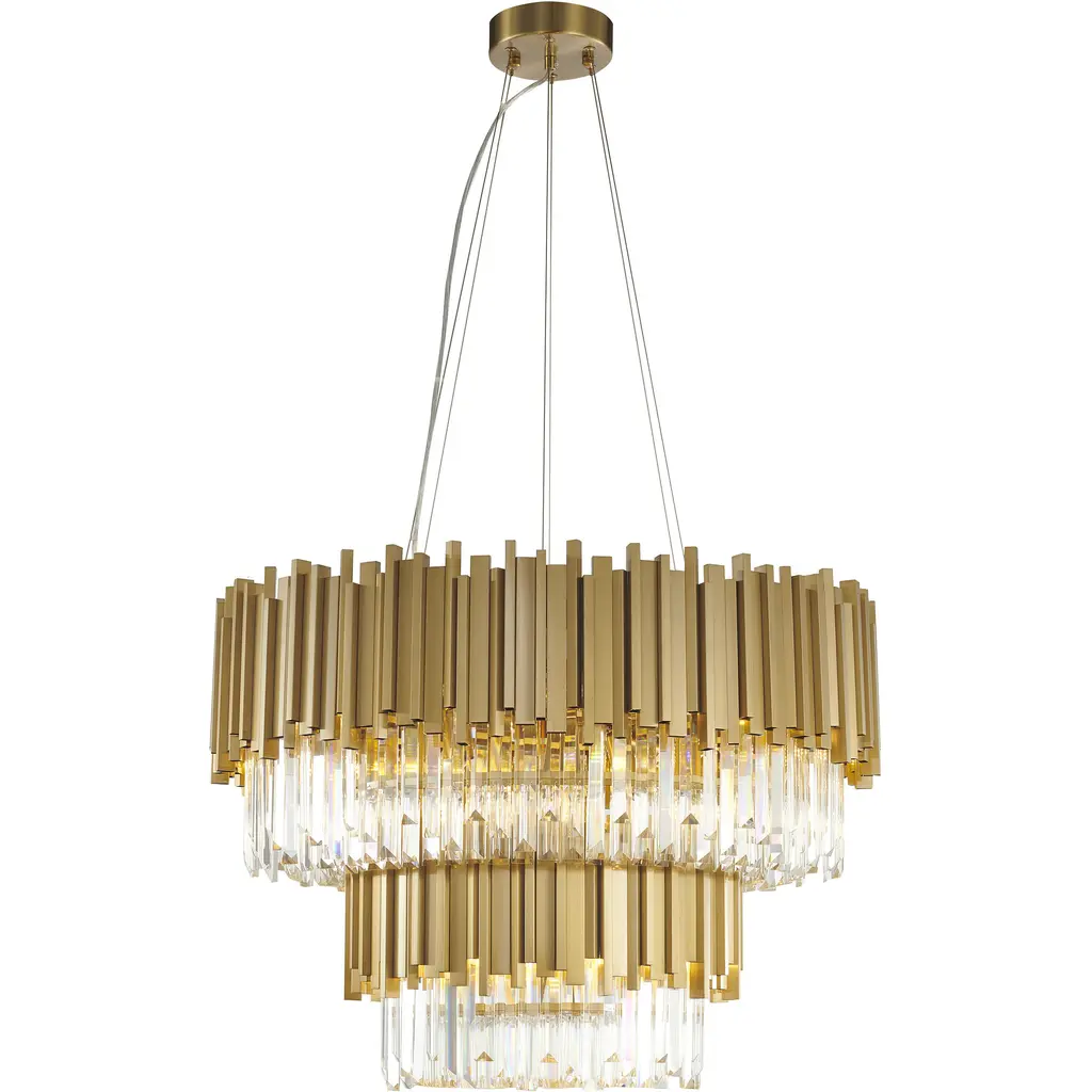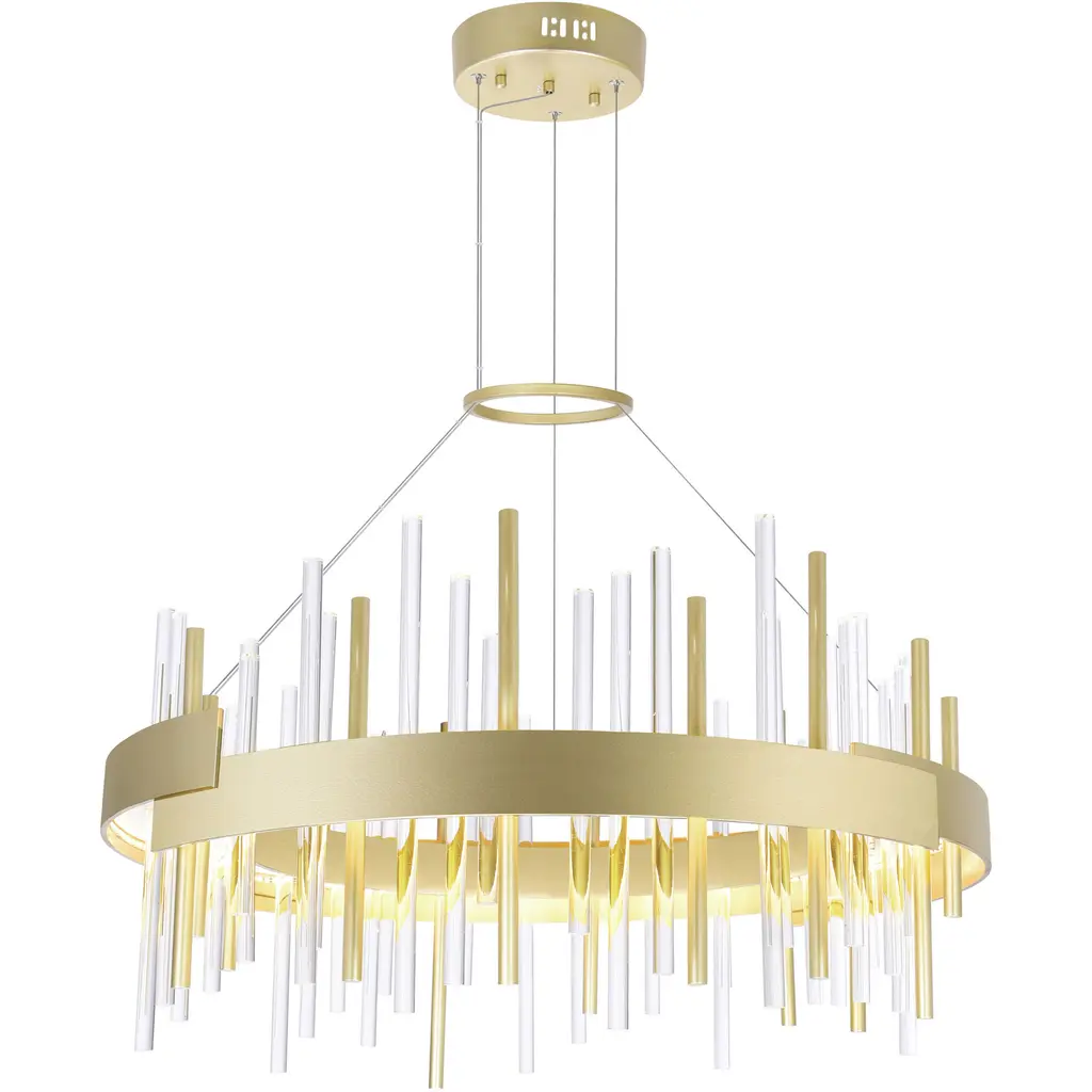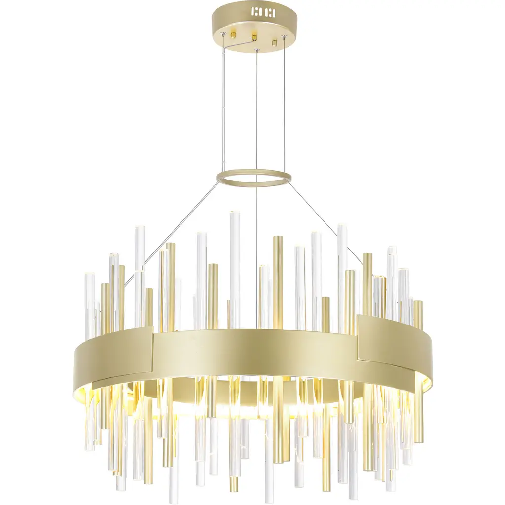 This stunning gold crystal chandelier is a true statement piece, blending luxury with brilliant illumination. Each meticulously crafted crystal catches the light, creating a dazzling, star-like effect that adds a touch of glamour and romance to any room. Constructed from premium electroplated metal and glass, it is built for lasting durability and features a powerful 48W LED that provides bright, adjustable lighting for spaces up to 215 square feet. You can easily switch between cool, neutral, and warm light colors using a standard wall switch to set the perfect mood. The chandelier's elegant design is complemented by practical features, including an adjustable chain for customizable height and a sturdy base for secure ceiling mounting. Easy to assemble, clean, and maintain, this exquisite fixture is an ideal choice for elevating the decor of living rooms, dining rooms, bedrooms, and more. Specification Material: Metal and Glass Color: Gold, Clear Style: Modern Mount Type: Ceiling Mount Assembly Required: Yes Voltage: 85-265V Efficiency: E Process: Electroplating Light Color: Cold, Neutral, Warm Light Source: LED Light Ring Switch Type: Wall Switch ( Not Included ) Power: 48W Color Temperature: 3000-6000K Irradiation Area: 10-20m²/107.64 -215.28ft² Base Diameter: 15cm/5.9in Chain Length: 150cm/59in Crystal Strip Length: 26cm/10.23in Chandelier Diameter: 80cm/31.5in