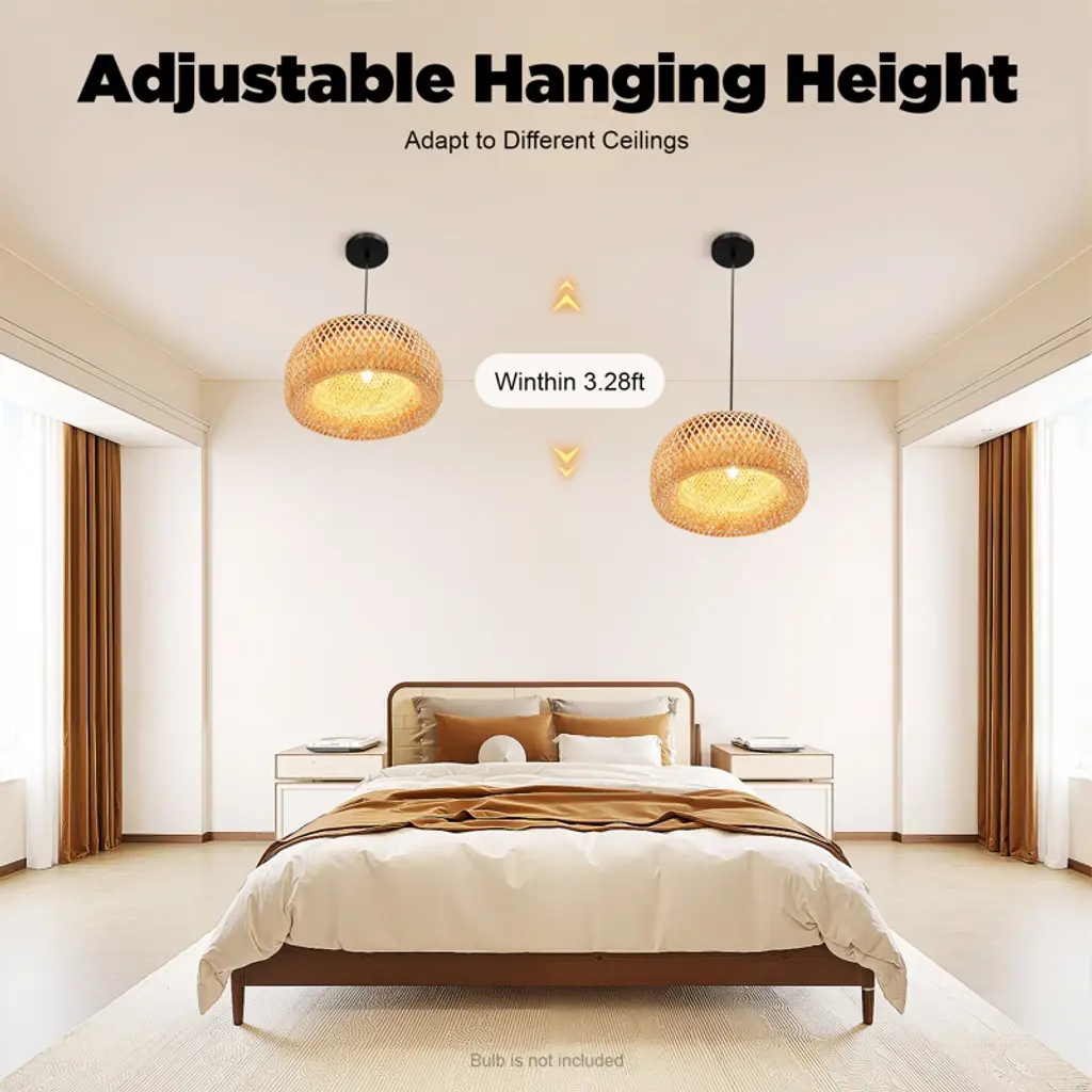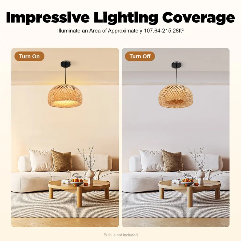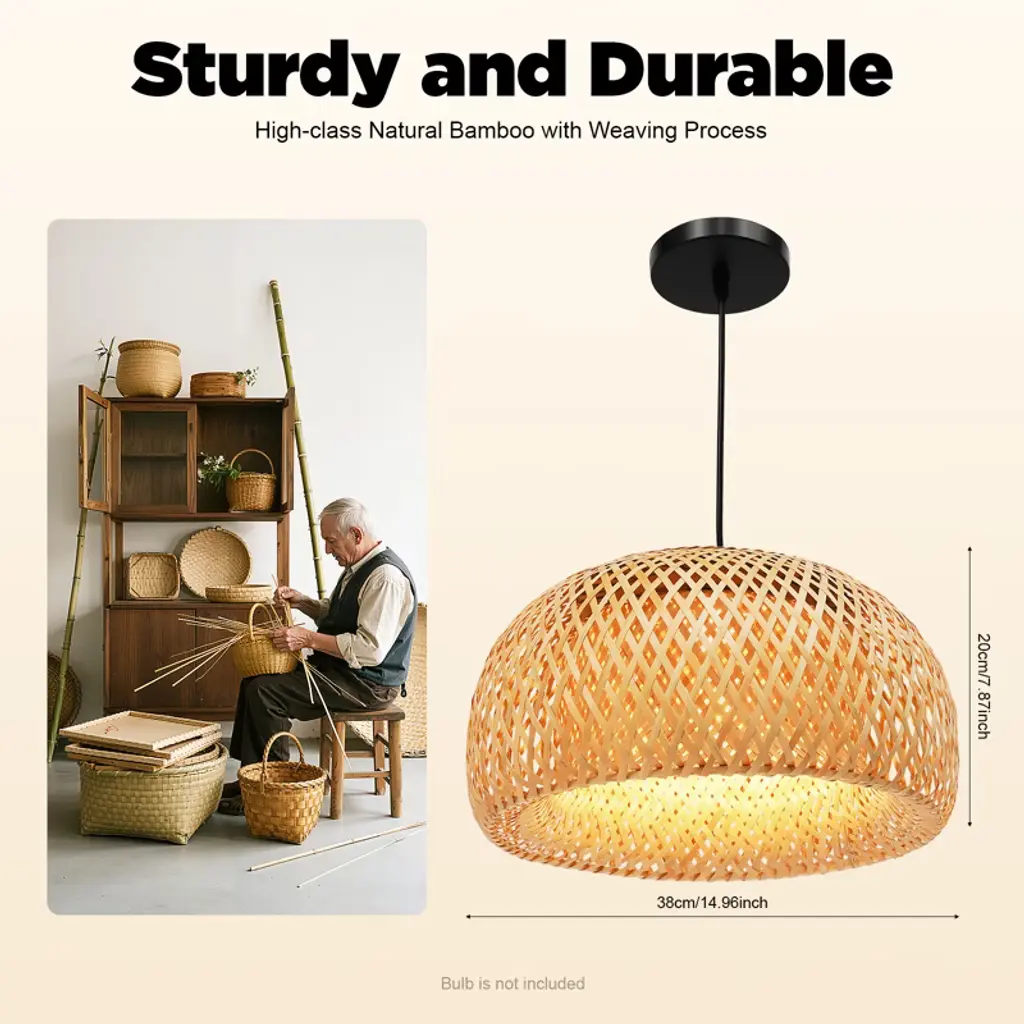 This pendant light is crafted from high-end natural bamboo using a weaving technique, ensuring sturdiness and durability. It emits bright illumination to light up your daily life while complementing your home decor. Its unique woven design and rustic aesthetic make it versatile enough to pair with various furniture styles, serving as an elegant decorative accent. The chain is freely adjustable, allowing it to adapt to different ceiling heights. Bring this charming piece home today! Specifications Material: Natural Bamboo Surface Treatment: Weaving Color: Wood Color Shape: Circular Style: Rustic Light Fixture Form: Chandelier Control Mode: Wall Switch (Not Included) Indoor/Outdoor Usage: Indoor Efficiency: E Assembly Required: Yes Mounting Type: Ceiling Mount Light Source Type: 1*E26 Bulb(Not Included) Voltage: 110V Recommended Max. Bulb Power: 40W Adjustable Height: Winthin 1m/3.28ft Hanging Rope Length: 1.1m/3.61ft Lighting Range: About 10-20m²/107.64-215.28ft² Suitable Room Height: 2.8-3.5m/9.1-11.48ft Gross Weight: 1.5kg/3.31lbs Net Weight: 1.43kg/3.15lbs Product Body Size(D*H): 38*20cm/14.96*7.87in