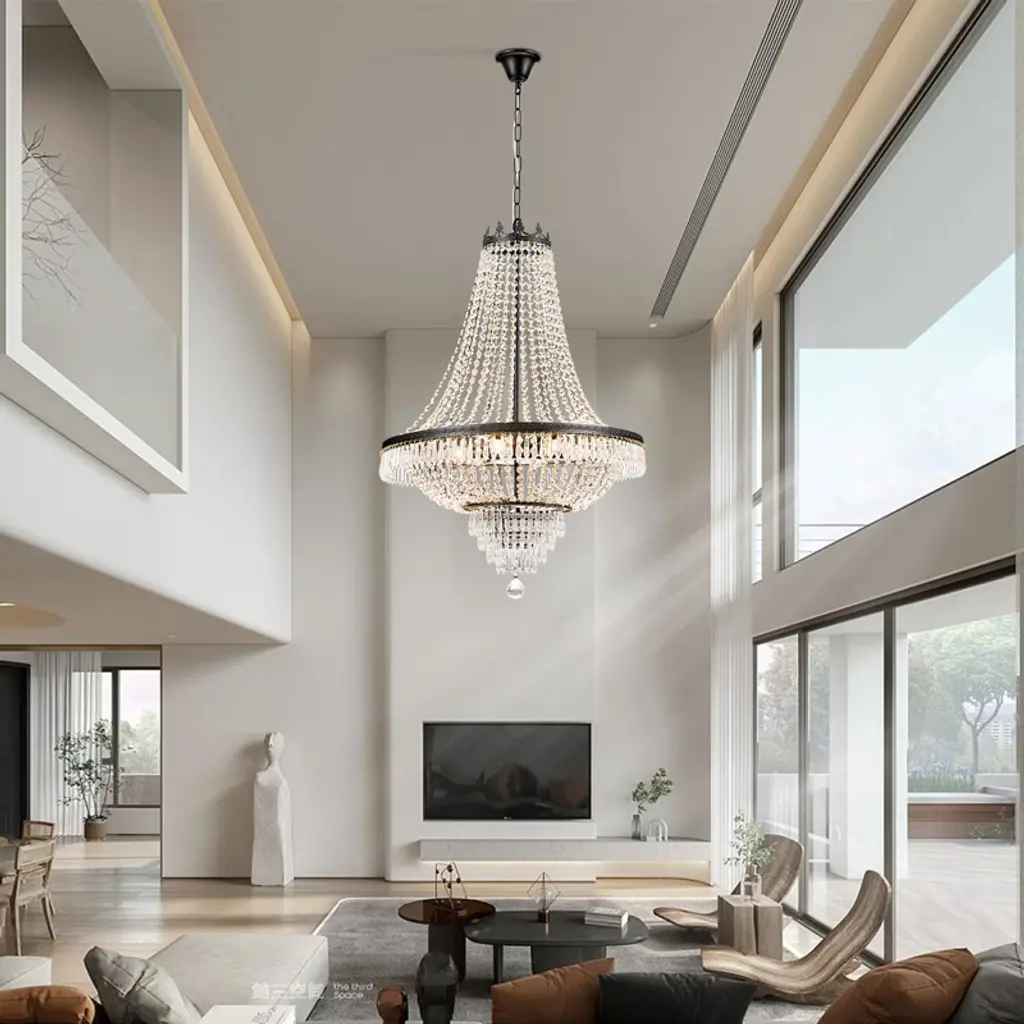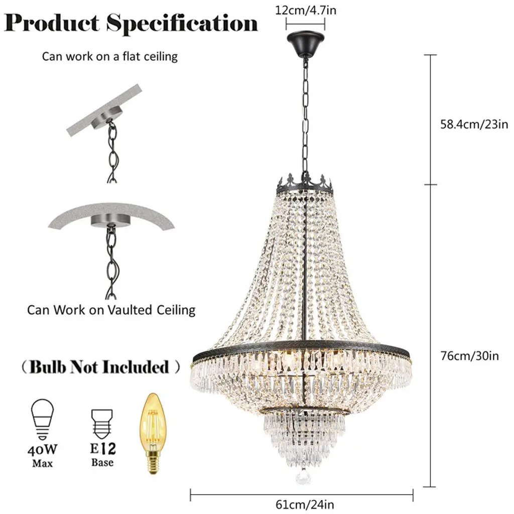 Of course. Here is a concise and elegant product summary based on the detailed description you provided. Product Summary This modern and luxurious crystal chandelier elevates any interior with its stunning blend of premium metal and high-clarity crystal pendants, creating a romantic and high-end ambiance. Designed to be both a beautiful centerpiece and a practical light source, it accommodates up to nine E12 bulbs (not included) to brightly illuminate spaces from 161 to 323 square feet. The chandelier features an adjustable hanging chain (up to 23 inches), allowing you to customize its height to perfectly suit your room's layout. Its versatile design complements a wide range of decor styles, from modern to classic, making it an ideal choice for living rooms, bedrooms, dining areas, and more. Simple to install with all necessary accessories included, this durable fixture is a sophisticated and lasting addition to your home.
