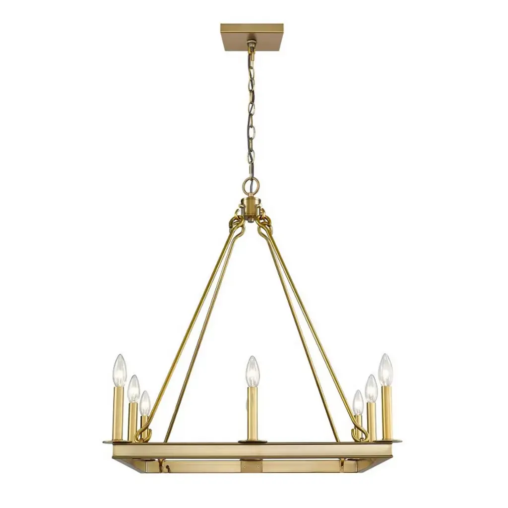 Enjoy the stylish design and tones of this eight-light chandelier for your home. It's fashioned in a lustrous olde brass finish with the candle-inspired lights in a large bold square design. It'll instantly energize the ambiance in your dining room, foyer, or kitchen. Dining Room/Foyer/Great Room/Hallway/Kitchen Cord Length: 110.00 Dimmable: Yes