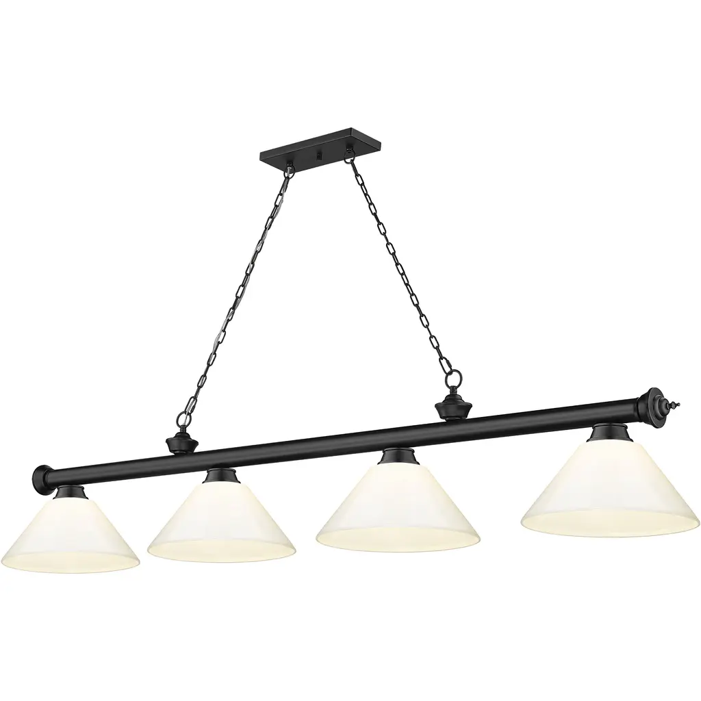 The elegant sheen of the finish and the delicate beauty of its glass shades make this three-light steel billiard light a glamorous addition to any modern home. Suspend this fashionable fixture over a kitchen island, dining table, or pool table to add a balanced aesthetic to interior decor. Room Recommendation: Game Room/Dining Room/Kitchen/Kitchenette Cord Length: 110.00 Chain Length: 72.00 Dimmable: Yes Shade Included: Yes