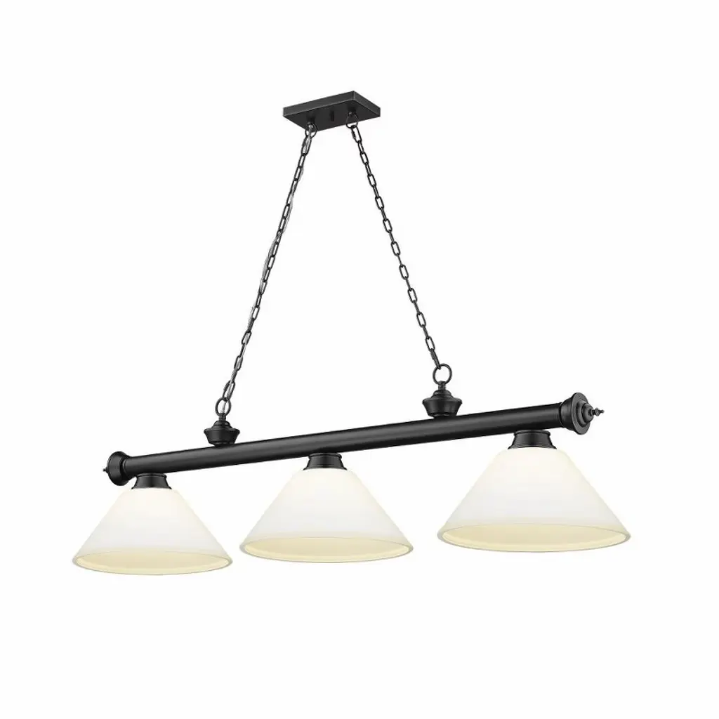 The elegant sheen of the finish and the delicate beauty of its glass shades make this three-light steel billiard light a glamorous addition to any modern home. Suspend this fashionable fixture over a kitchen island, dining table, or pool table to add a balanced aesthetic to interior decor. Room Recommendation: Game Room/Dining Room/Kitchen/Kitchenette Cord Length: 110.00 Chain Length: 72.00 Dimmable: Yes Shade Included: Yes