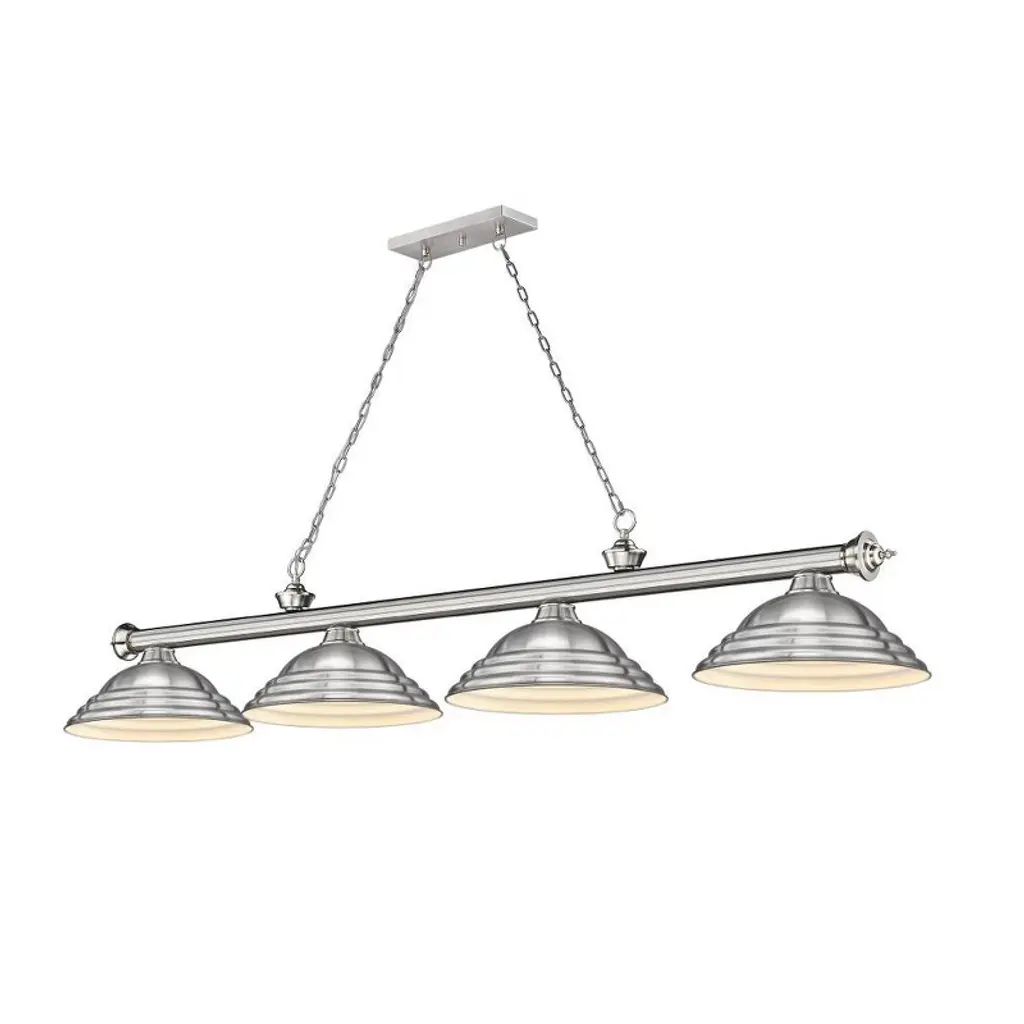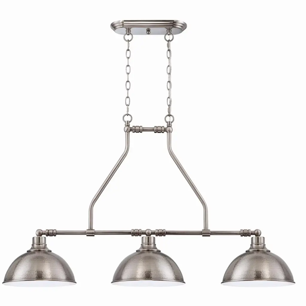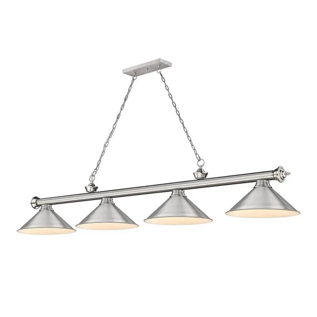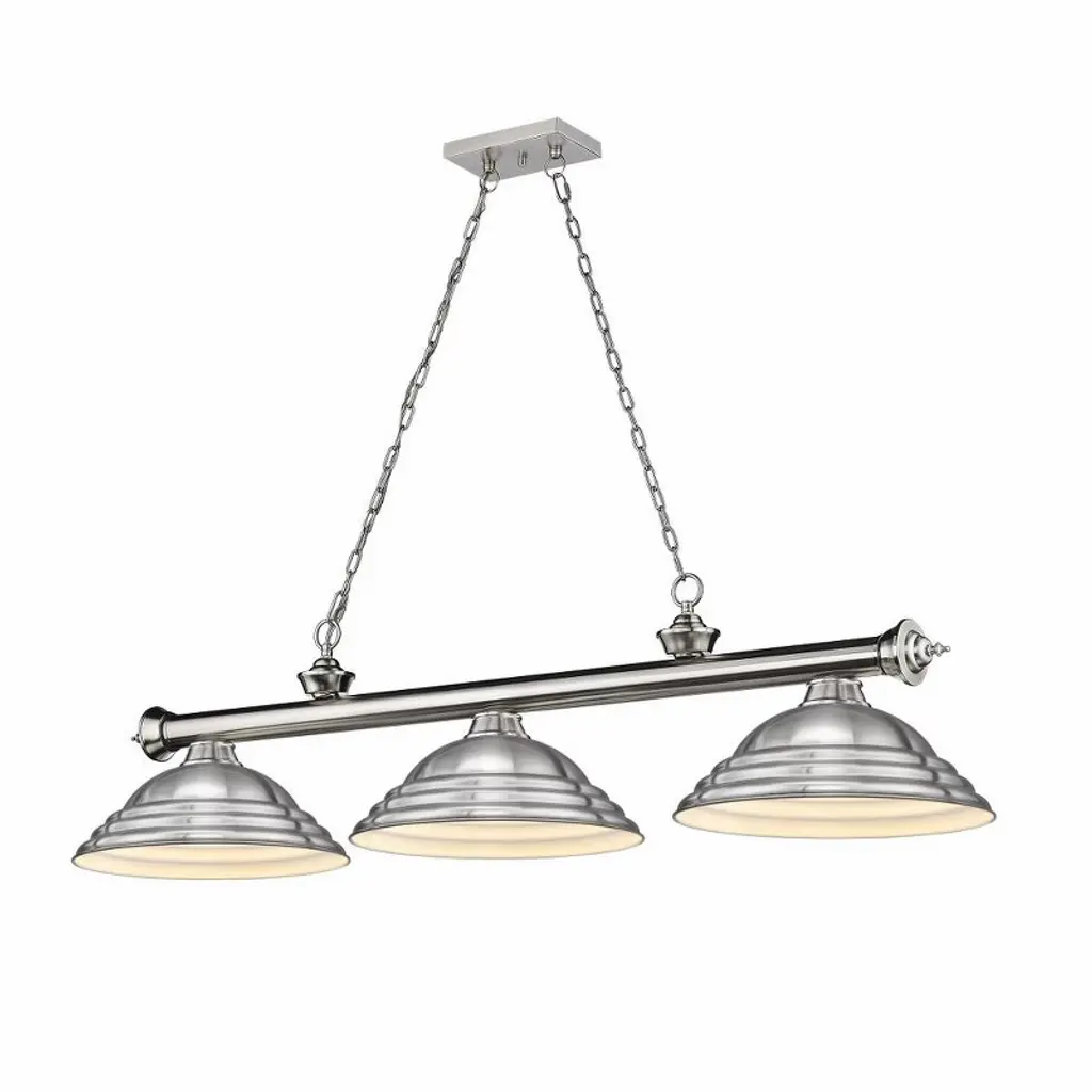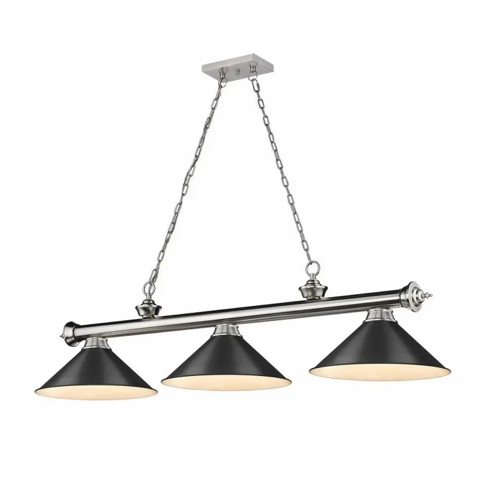 The elegant sheen of the finish and the delicate beauty of its glass shades make this three-light steel billiard light a glamorous addition to any modern home. Suspend this fashionable fixture over a kitchen island, dining table, or pool table to add a balanced aesthetic to interior decor. Room Recommendation: Game Room/Dining Room/Kitchen/Kitchenette Cord Length: 110.00 Chain Length: 72.00 Dimmable: Yes Shade Included: Yes