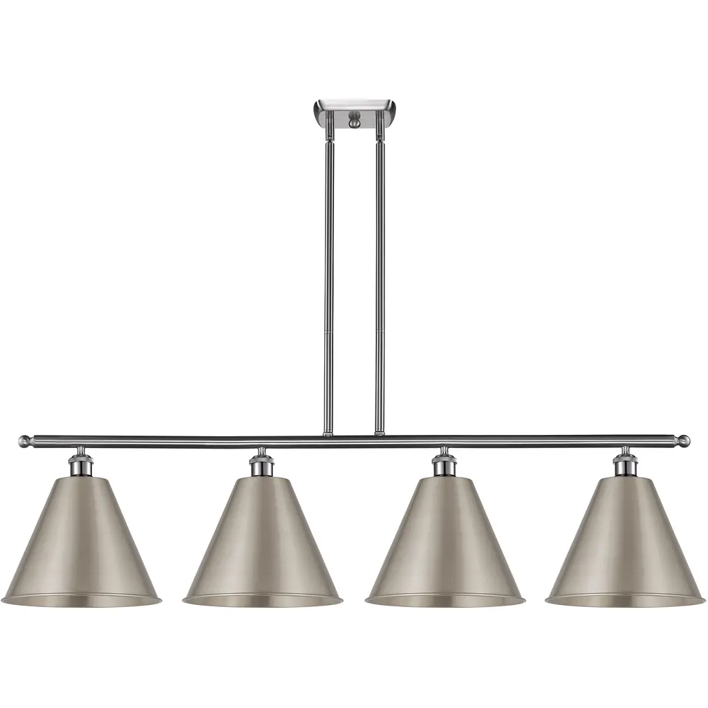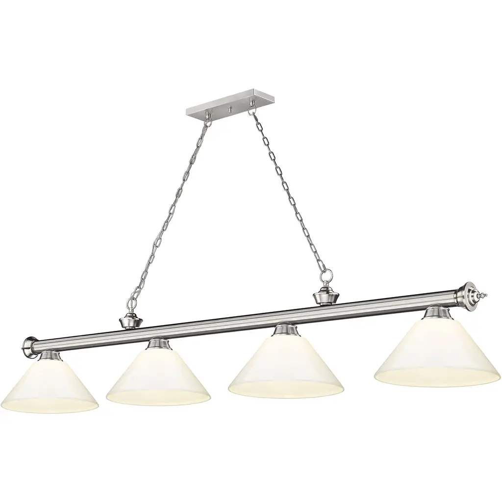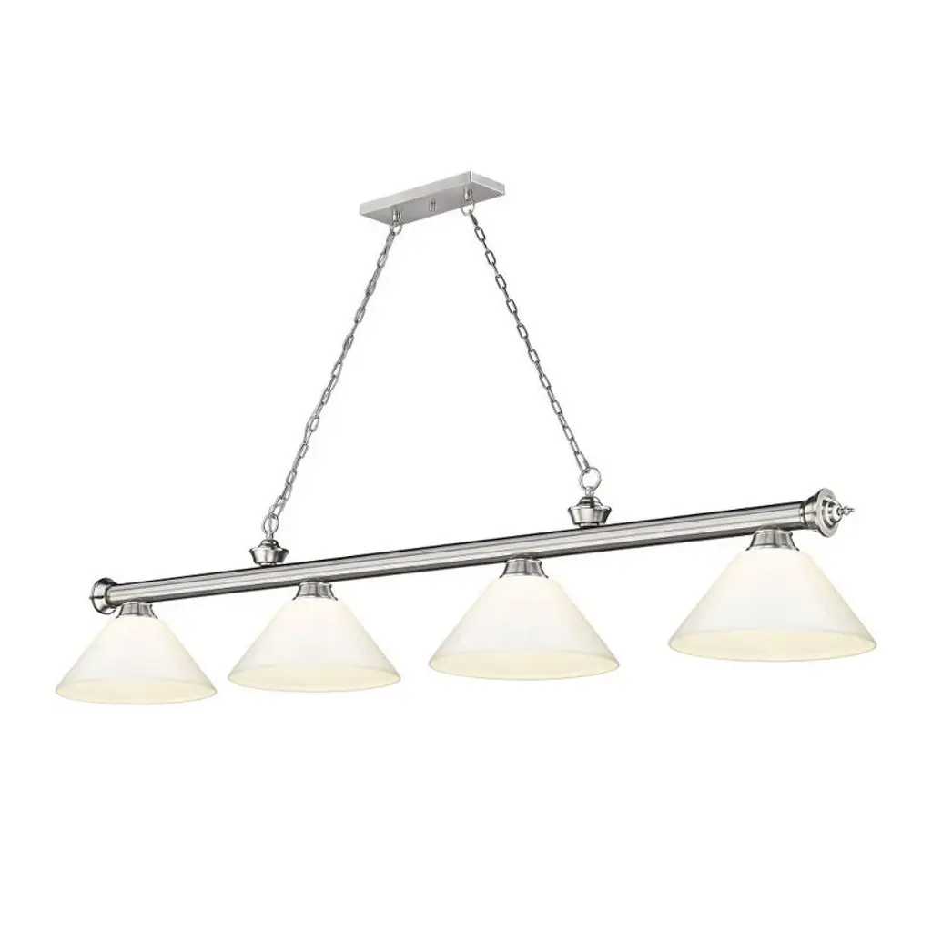 The elegant sheen of the finish and the delicate beauty of its glass shades make this three-light steel billiard light a glamorous addition to any modern home. Suspend this fashionable fixture over a kitchen island, dining table, or pool table to add a balanced aesthetic to interior decor. Room Recommendation: Game Room/Dining Room/Kitchen/Kitchenette Cord Length: 110.00 Chain Length: 72.00 Dimmable: Yes Shade Included: Yes