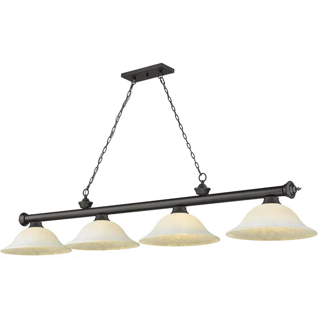 The alluring gleam of the finish and the delicate beauty of its glass shades makes this traditional, four-light metal billiard light an attractive addition to any home. Perfect for kitchens, game rooms, and dining rooms, this effortlessly stylish fixture breathes new life into everyday home decor. Room Recommendation: Game Room/Dining Room/Kitchen/Kitchenette Cord Length: 110.00 Chain Length: 72.00 Dimmable: Yes Shade Included: Yes