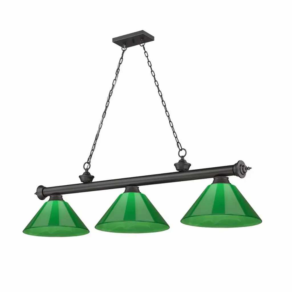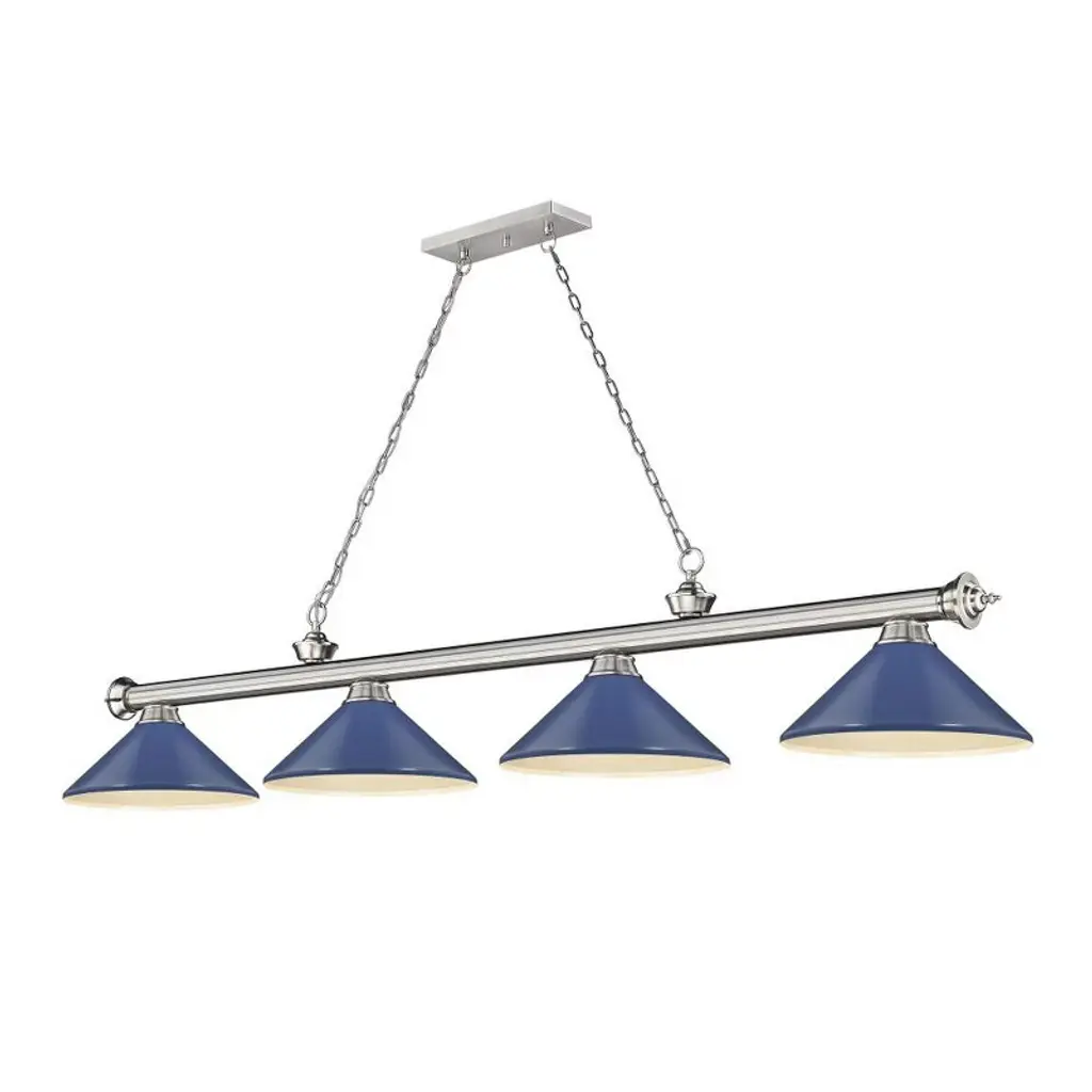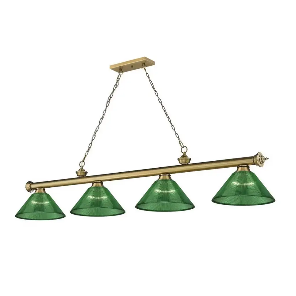 The alluring gleam of the finish and the delicate beauty of its glass shades makes this traditional, four-light metal billiard light an attractive addition to any home. Perfect for kitchens, game rooms, and dining rooms, this effortlessly stylish fixture breathes new life into everyday home decor. Room Recommendation: Game Room/Dining Room/Kitchen/Kitchenette Cord Length: 110.00 Chain Length: 72.00 Dimmable: Yes Shade Included: Yes