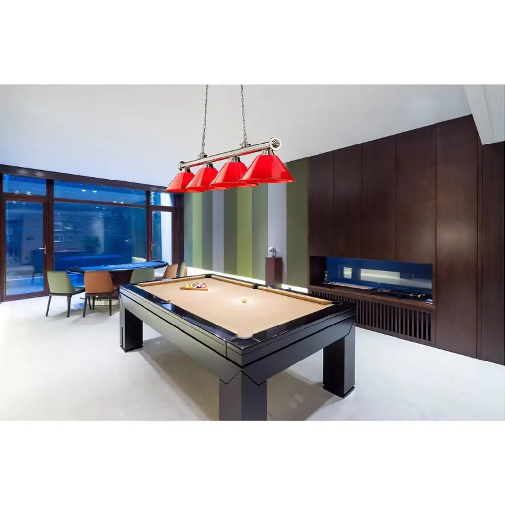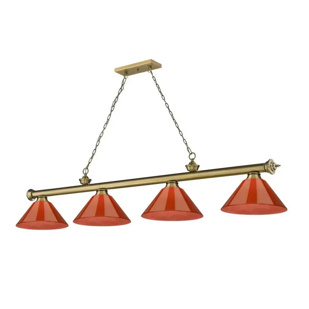 The alluring gleam of the finish and the delicate beauty of its glass shades makes this traditional, four-light metal billiard light an attractive addition to any home. Perfect for kitchens, game rooms, and dining rooms, this effortlessly stylish fixture breathes new life into everyday home decor. Room Recommendation: Game Room/Dining Room/Kitchen/Kitchenette Cord Length: 110.00 Chain Length: 72.00 Dimmable: Yes Shade Included: Yes
