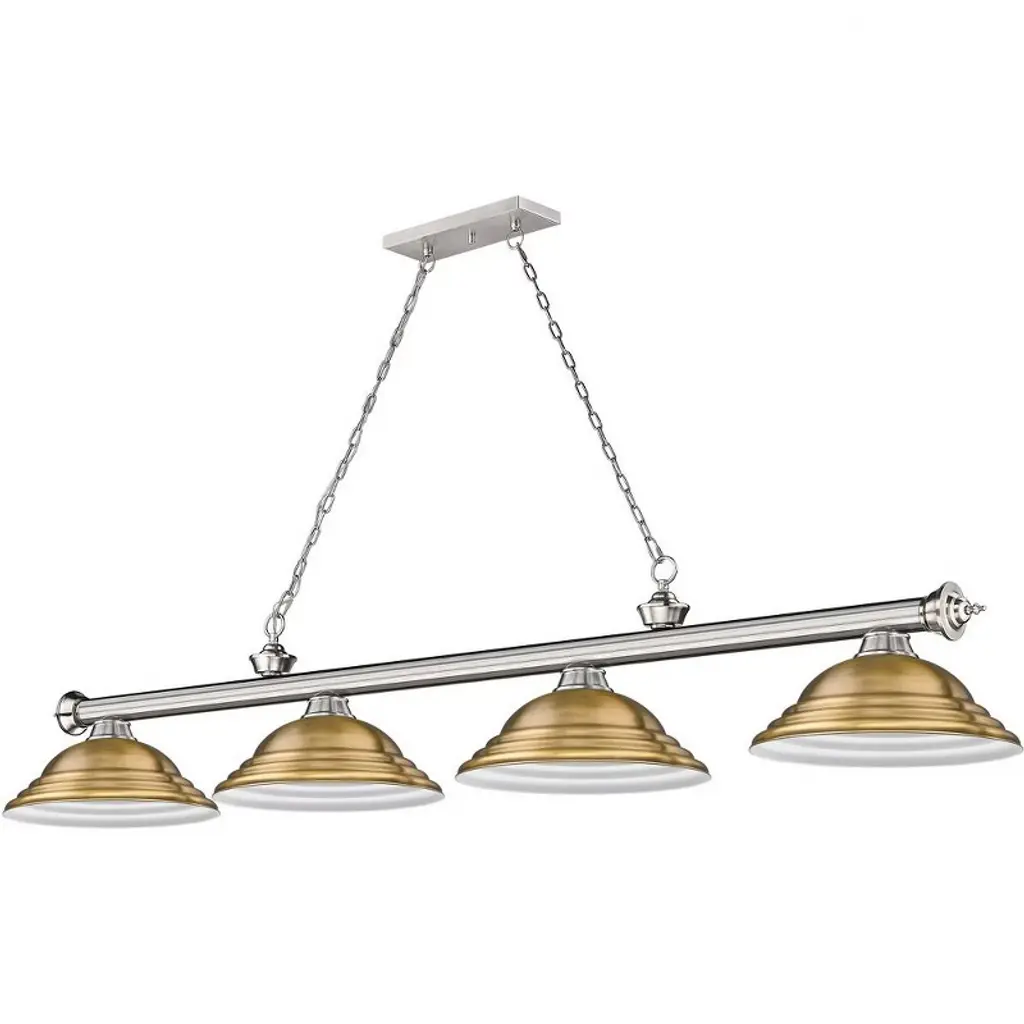 The alluring gleam of the finish and the delicate beauty of its glass shades makes this traditional, four-light metal billiard light an attractive addition to any home. Perfect for kitchens, game rooms, and dining rooms, this effortlessly stylish fixture breathes new life into everyday home decor. Room Recommendation: Game Room/Dining Room/Kitchen/Kitchenette Cord Length: 110.00 Chain Length: 72.00 Dimmable: Yes Shade Included: Yes