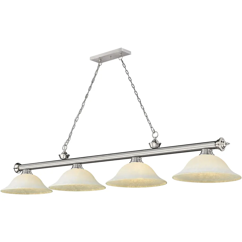 The alluring gleam of the finish and the delicate beauty of its glass shades makes this traditional, four-light metal billiard light an attractive addition to any home. Perfect for kitchens, game rooms, and dining rooms, this effortlessly stylish fixture breathes new life into everyday home decor. Room Recommendation: Game Room/Dining Room/Kitchen/Kitchenette Cord Length: 110.00 Chain Length: 72.00 Dimmable: Yes Shade Included: Yes