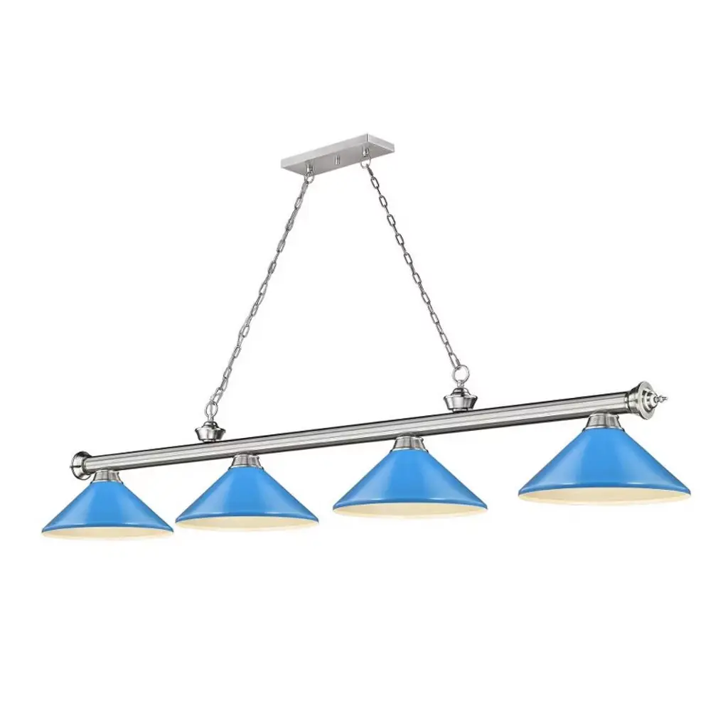 The alluring gleam of the finish and the delicate beauty of its glass shades makes this traditional, four-light metal billiard light an attractive addition to any home. Perfect for kitchens, game rooms, and dining rooms, this effortlessly stylish fixture breathes new life into everyday home decor. Room Recommendation: Game Room/Dining Room/Kitchen/Kitchenette Cord Length: 110.00 Chain Length: 72.00 Dimmable: Yes Shade Included: Yes
