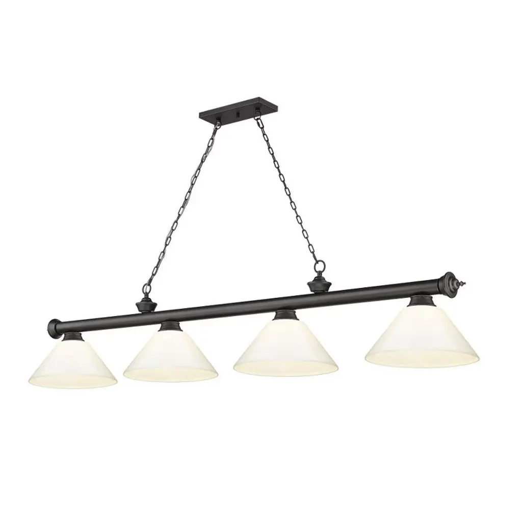 The alluring gleam of the finish and the delicate beauty of its glass shades makes this traditional, four-light metal billiard light an attractive addition to any home. Perfect for kitchens, game rooms, and dining rooms, this effortlessly stylish fixture breathes new life into everyday home decor. Room Recommendation: Game Room/Dining Room/Kitchen/Kitchenette Cord Length: 110.00 Chain Length: 72.00 Dimmable: Yes Shade Included: Yes