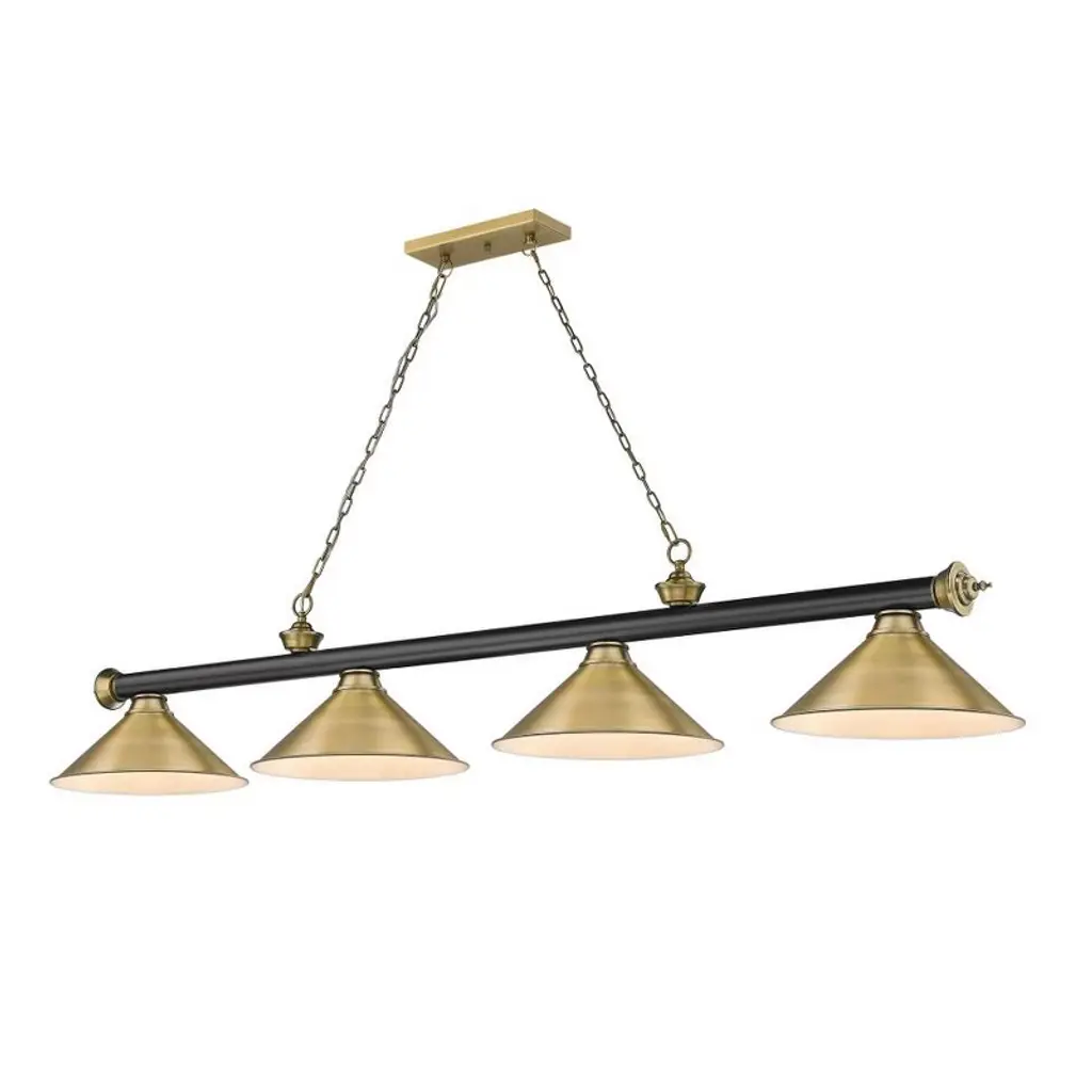 The alluring gleam of the finish and the delicate beauty of its glass shades makes this traditional, four-light metal billiard light an attractive addition to any home. Perfect for kitchens, game rooms, and dining rooms, this effortlessly stylish fixture breathes new life into everyday home decor. Room Recommendation: Game Room/Dining Room/Kitchen/Kitchenette Cord Length: 110.00 Chain Length: 72.00 Dimmable: Yes Shade Included: Yes