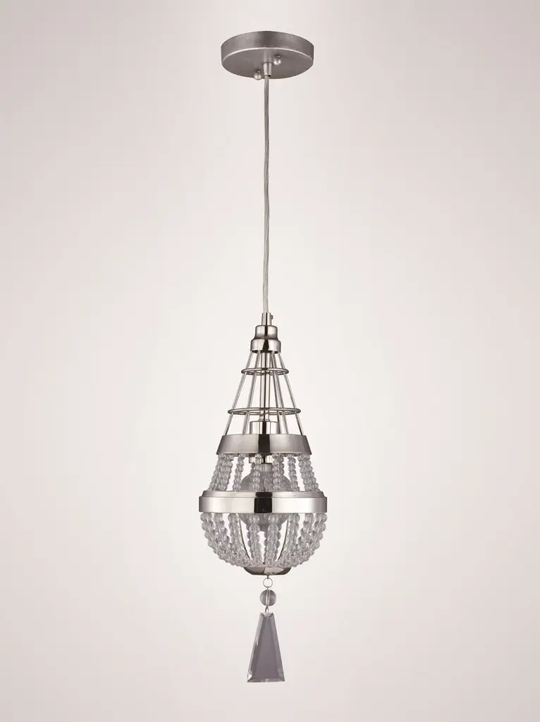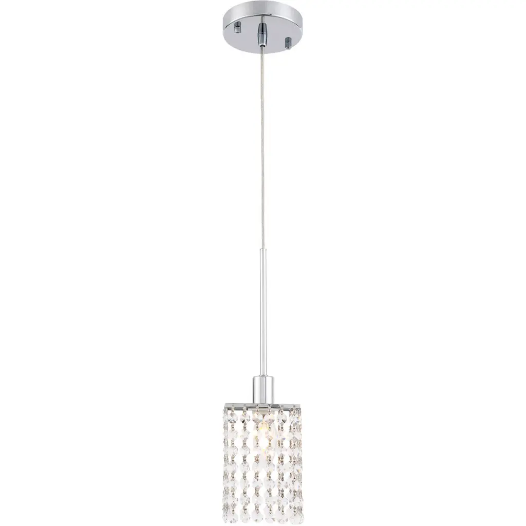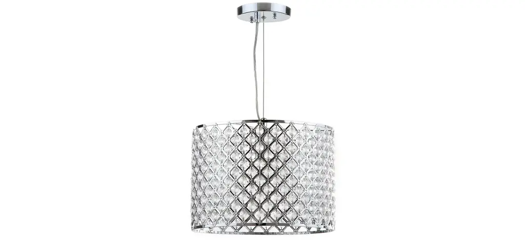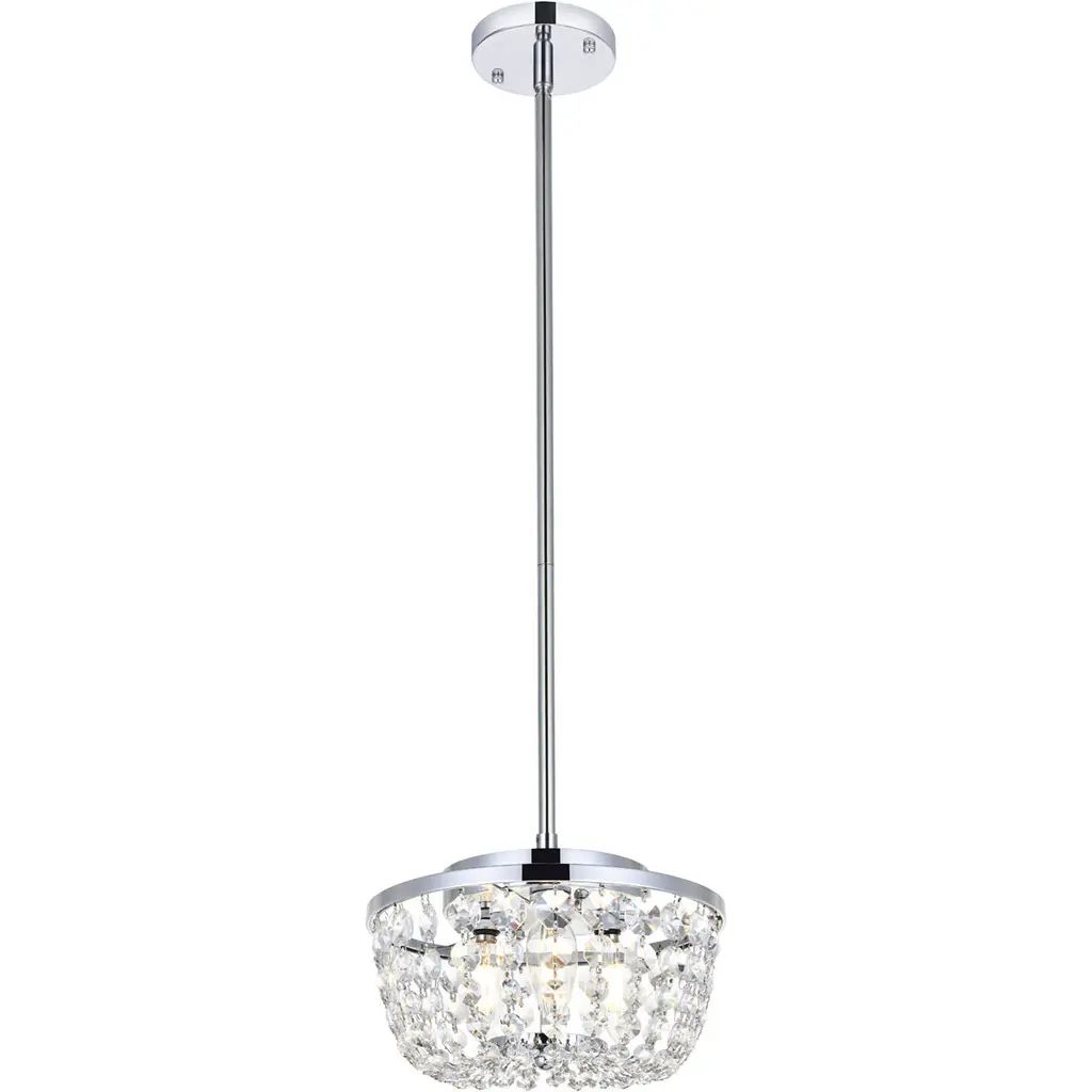 Crystal-inspired accents from the rounded shade on this hanging ceiling light create a multidimensional glow. Elongated lines are given a vintage-inspired feel with a heirloom brass finish. Dining Room/Foyer/Great Room/Hallway/Kitchen No. of Rods: 7 Shade Included: Yes Cord Length: 120.00 Rod Length(s): 12.00 Dimmable: Yes Material: Crystal, Finish Color: Chrome, Width: 12", Height: 9", Length: 12", Lamping Type: Incandescent, Number Of Bulbs: 3, Wattage: 60 Watts, Dimmable: Yes, Moisture Rating: Dry Rated