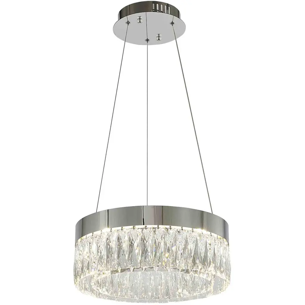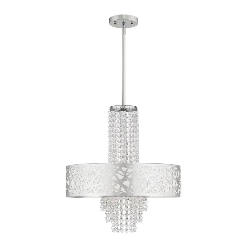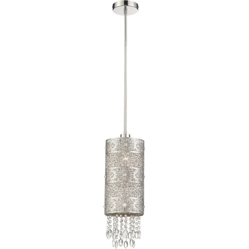 Crystal-inspired accents from the rounded shade on this hanging ceiling light create a multidimensional glow. Elongated lines are given a vintage-inspired feel with a heirloom brass finish. Dining Room/Foyer/Great Room/Hallway/Kitchen No. of Rods: 7 Shade Included: Yes Cord Length: 120.00 Rod Length(s): 12.00 Dimmable: Yes Material: Crystal, Finish Color: Chrome, Width: 12", Height: 9", Length: 12", Lamping Type: Incandescent, Number Of Bulbs: 3, Wattage: 60 Watts, Dimmable: Yes, Moisture Rating: Dry Rated