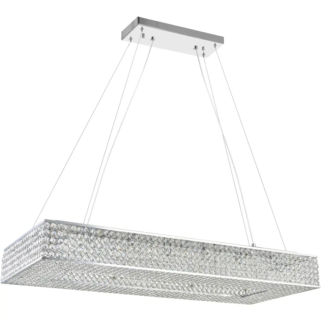 Complete a vintage-inspired living area with the elongated style of this hanging ceiling light. The open rectangular shade boasts a radiant heritage brass finish that encases reflective crystal accents. Dining Room/Foyer/Great Room/Hallway/Kitchen No. of Rods: 16 Shade Included: Yes Cord Length: 110.00 Rod Length(s): 24.00 Dimmable: Yes Material: Crystal, Finish Color: Chrome, Width: 9.25", Height: 9", Length: 43.5", Lamping Type: Incandescent, Number Of Bulbs: 7, Wattage: 60 Watts, Dimmable: Yes, Moisture Rating: Dry Rated