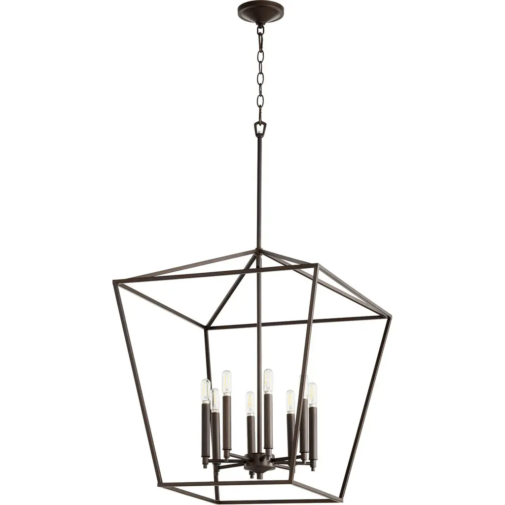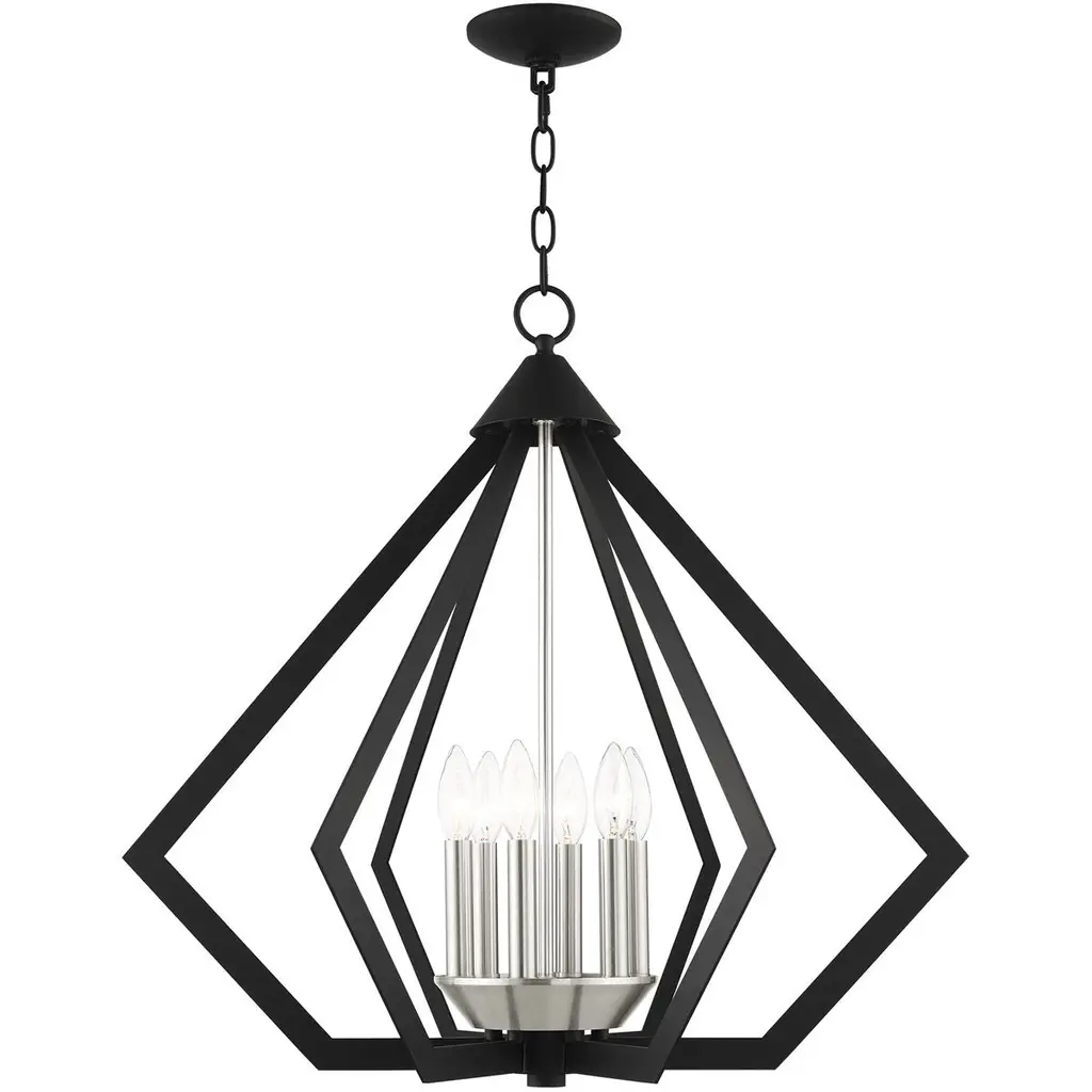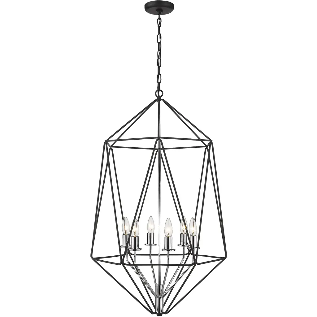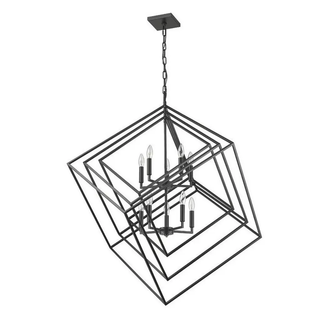 Bold geometric shapes nested within themselves inspire the modern design of the Euclid collection. Uniquely layered parallelograms and cubes, encapsulate the inner candelabra. This popular Collection is now available in all Matte Black Finish. Room Recommendation: Dining Room/Foyer/Great Room/Hallway/Kitchen Chain Length: 72.00 Dimmable: Yes Material: Steel, Finish Color: Matte Black, Width: 41.5", Height: 44.5", Length: 41.5", Chain Length: 72", Lamping Type: Incandescent, Number Of Bulbs: 10, Wattage: 60 Watts, Dimmable: Yes, Moisture Rating: Dry Rated