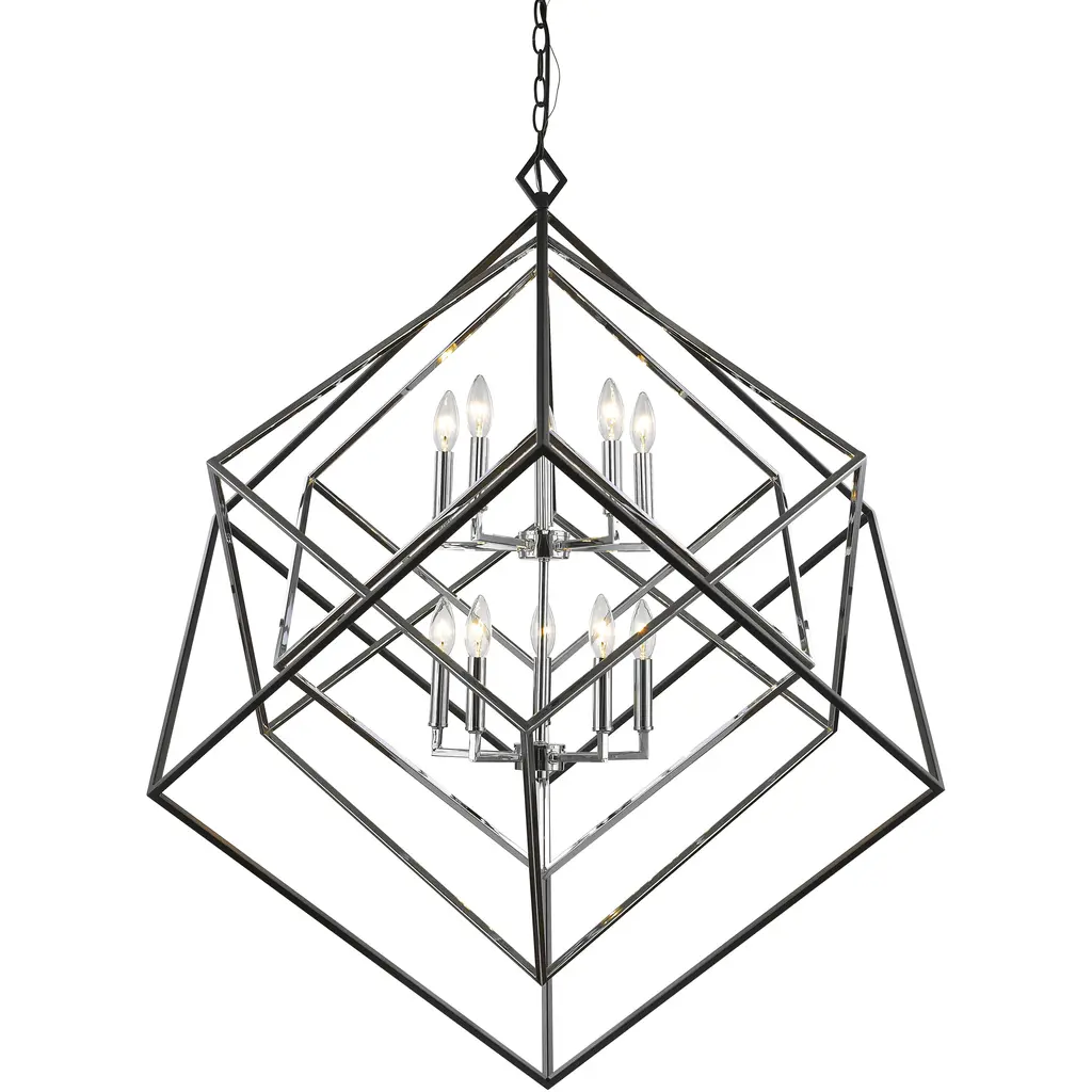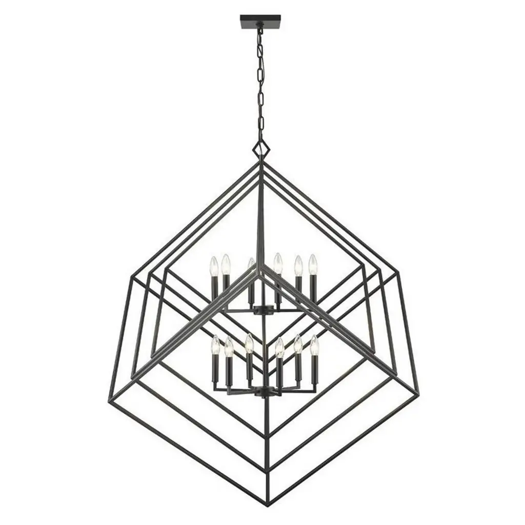 Bold geometric shapes nested within themselves inspire the modern design of the Euclid collection. Uniquely layered parallelograms and cubes, encapsulate the inner candelabra. This popular Collection is now available in all Matte Black Finish. Room Recommendation: Dining Room/Foyer/Great Room/Hallway/Kitchen Chain Length: 72.00 Dimmable: Yes Material: Steel, Finish Color: Matte Black, Width: 47.5", Height: 50.5", Length: 47.5", Chain Length: 72", Lamping Type: Incandescent, Number Of Bulbs: 12, Wattage: 60 Watts, Dimmable: Yes, Moisture Rating: Dry Rated