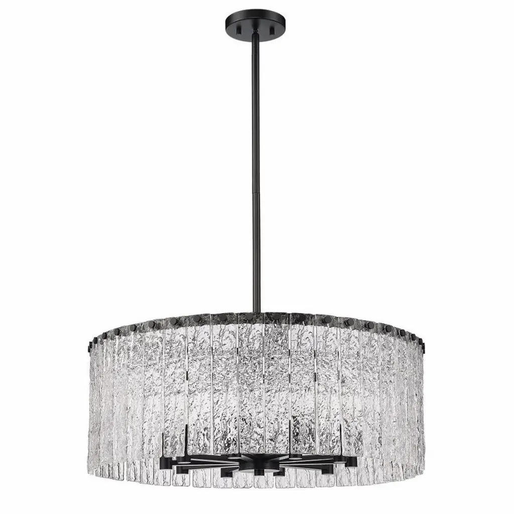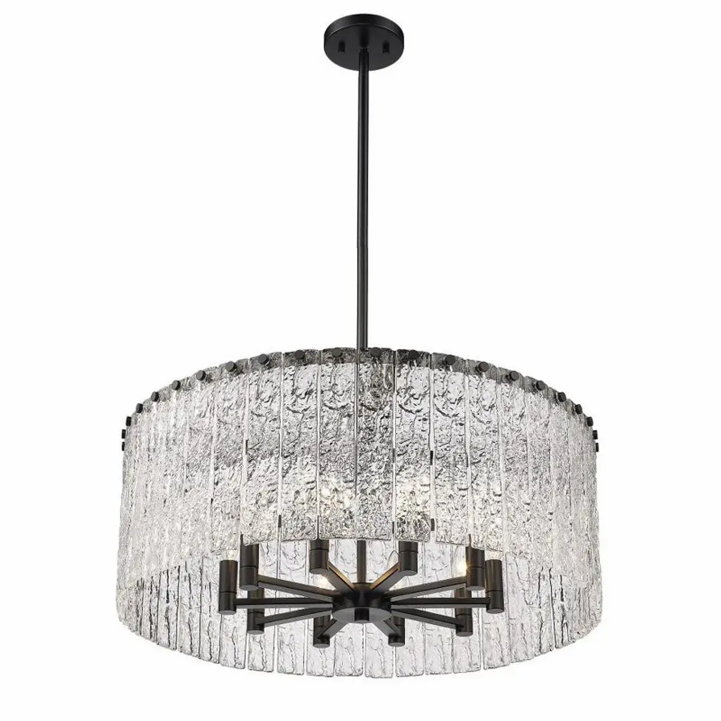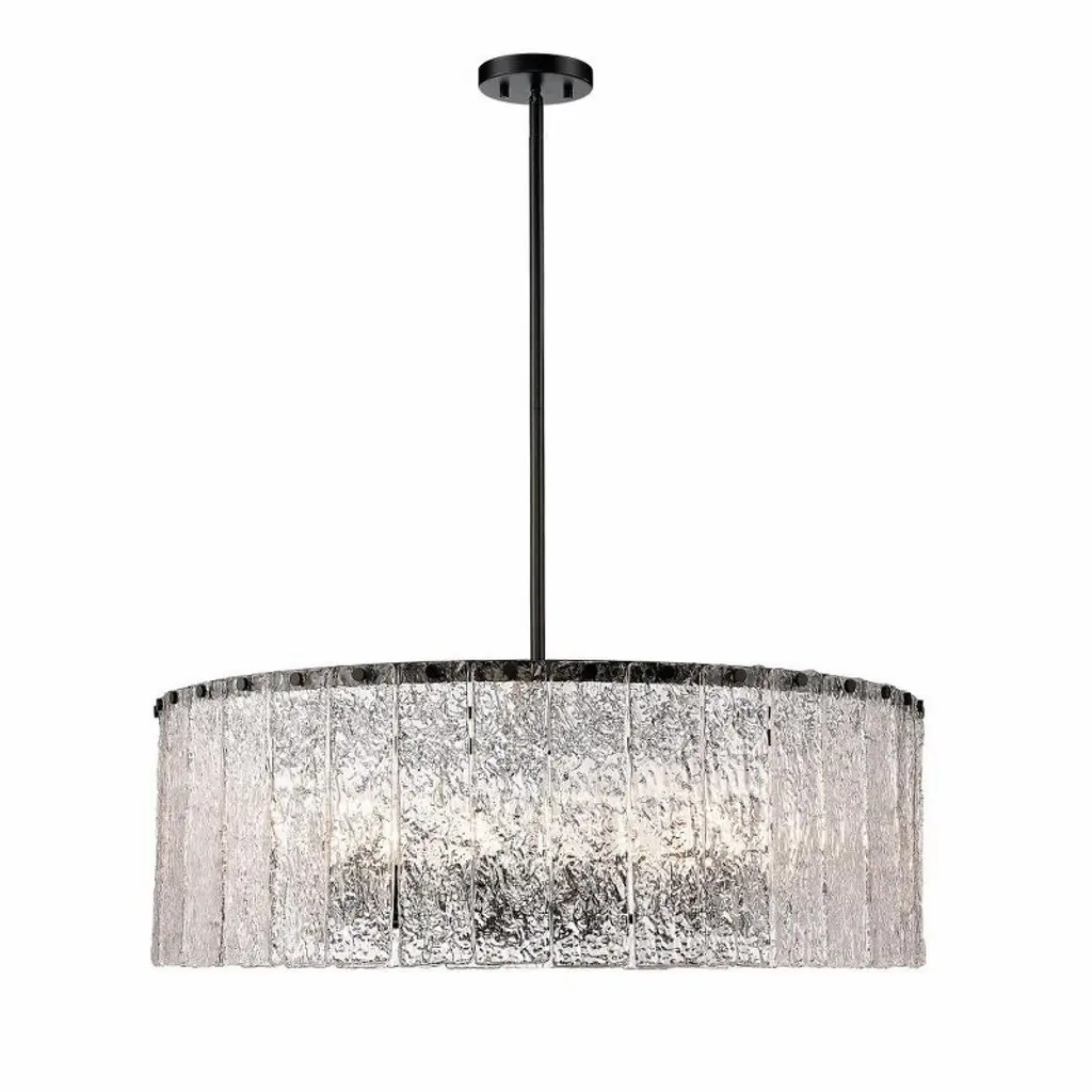 An enticing option for both modern and transitional spaces, this decadent fixture becomes a focal point in design and lighting. The Glacier round ten-light pendant delivers a gallery aesthetic with individual clear textured glass panels that emulate melting ice, a chic design with dramatic impact. Matte black finish steel is placed as a crown frame, providing tantalizing contrast and enhancing the gallery feel of a foyer, dining room, or main living area.