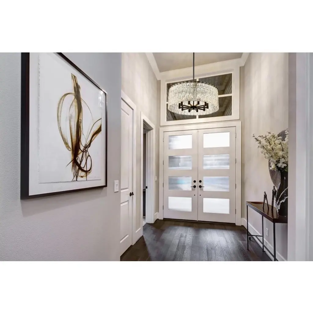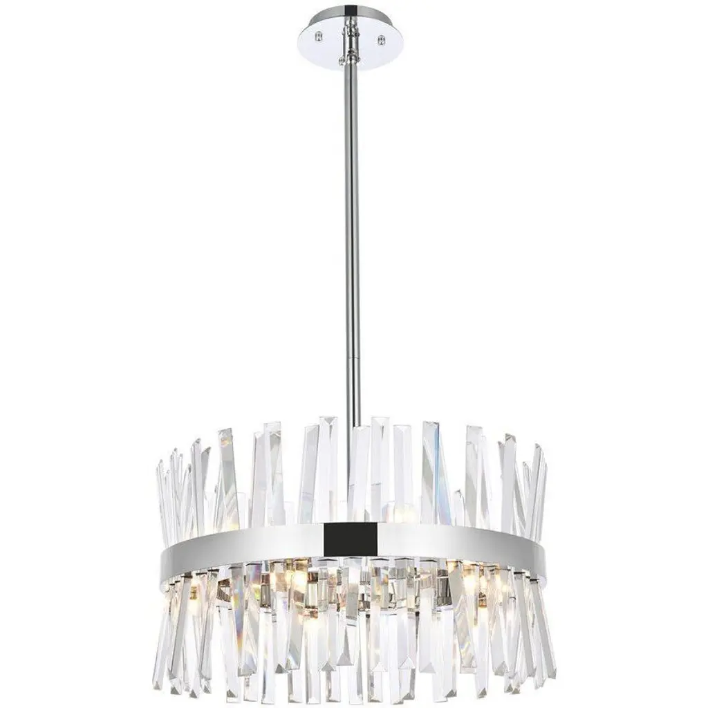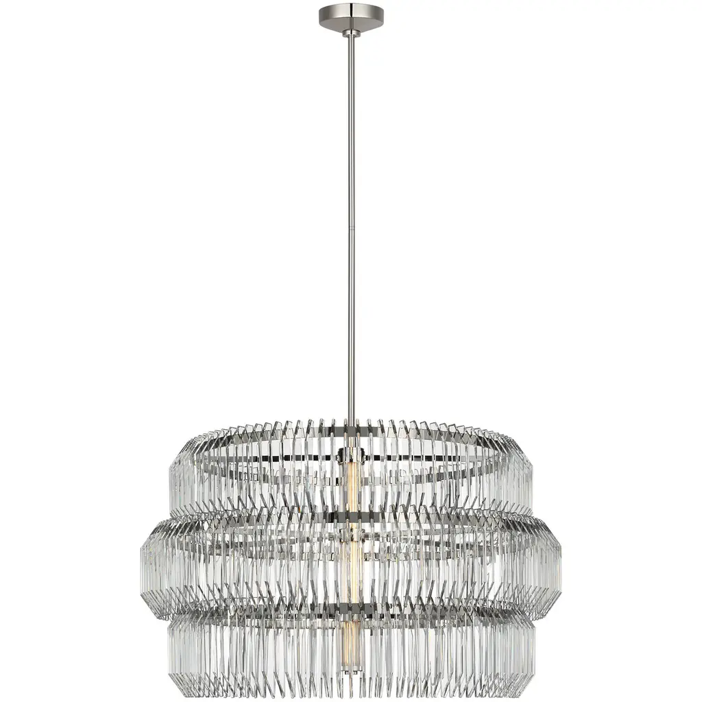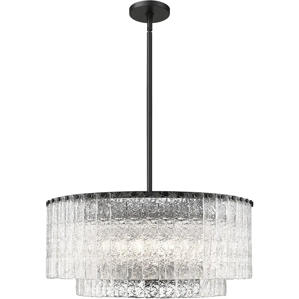 An enticing option for both modern and transitional spaces, this decadent fixture becomes a focal point in design and lighting. The Glacier round ten-light pendant delivers a gallery aesthetic with individual clear textured glass panels that emulate melting ice, a chic design with dramatic impact. Matte black finish steel is placed as a crown frame, providing tantalizing contrast and enhancing the gallery feel of a foyer, dining room, or main living area.