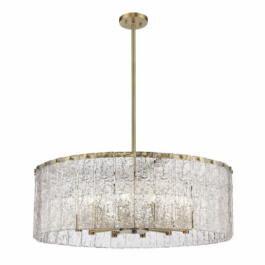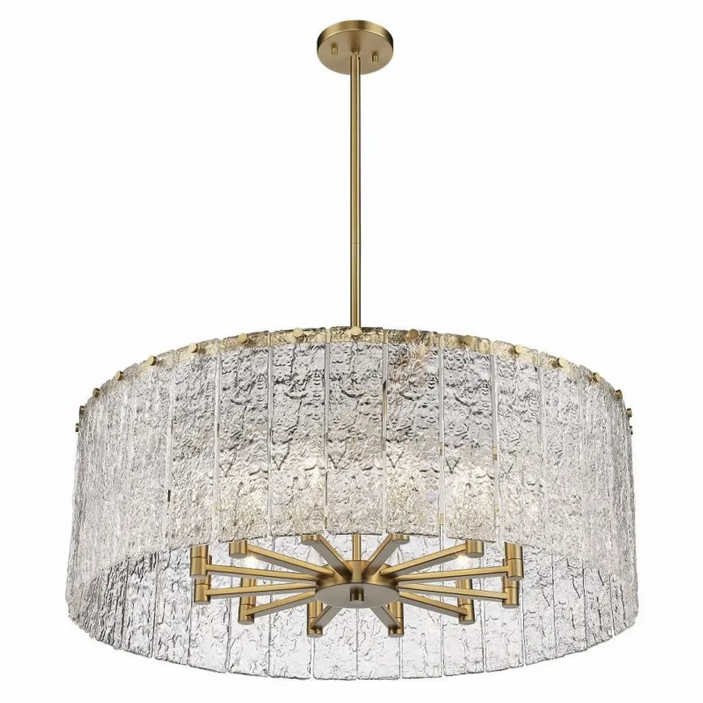 With a grand size and compelling design, this striking light fixture reflects a perfect mix of industrial and gallery design elements. The Glacier round twelve-light pendant offers a decadent look of individual clear textured glass panels that emulate melting ice, an extraordinary effect with dramatic impact in a foyer, kitchen, or main living area. Matte black finish steel is placed as a crown frame, adding a contrast in both style and finish and embellishing the optical delight accomplished when the fixture is illuminated.