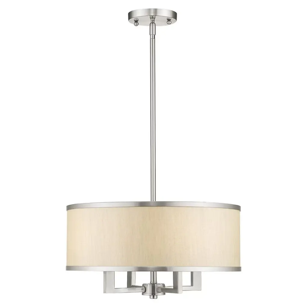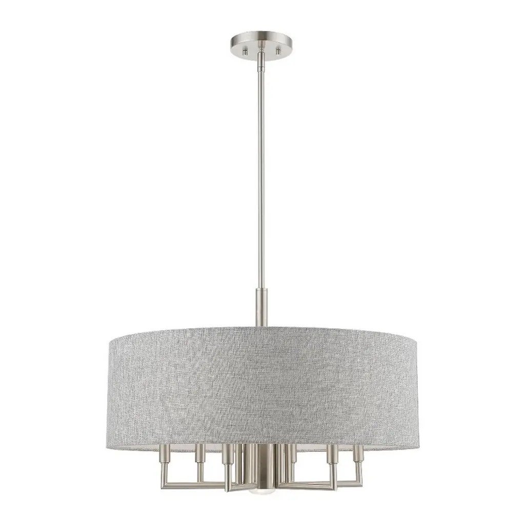 Illuminate your living space with the alluring glow of this elegant, eight-light pendant. With a versatile design that works well in almost any room, this sophisticated fixture blends a brushed nickel frame with a soft, white shade for beautiful ambiance. Bedroom/Dining Room/Dinette/Foyer/Hallway/Kids Room/Kitchen/Kitchenette/Living Room/Office Shade Included: Yes Cord Length: 110.00 Dimmable: Yes