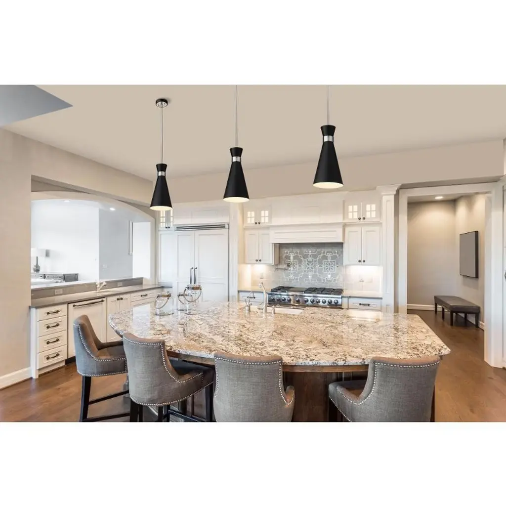 A decorative, slender silhouette shapes industrial influence that adds casual elegance to this matte black finish metal pendant light. Dress up a main living space or entryway with this tasteful fixture trimmed with heritage brass finish steel. This sleek pendant captures the heart of romantic industrial charm. Bedroom/Dining Room/Dinette/Foyer/Hallway/Kids Room/Kitchen/Kitchenette/Living Room/Office No. of Rods: 8 Shade Included: Yes Cord Length: 110.00 Rod Length(s): 12.00 Dimmable: Yes