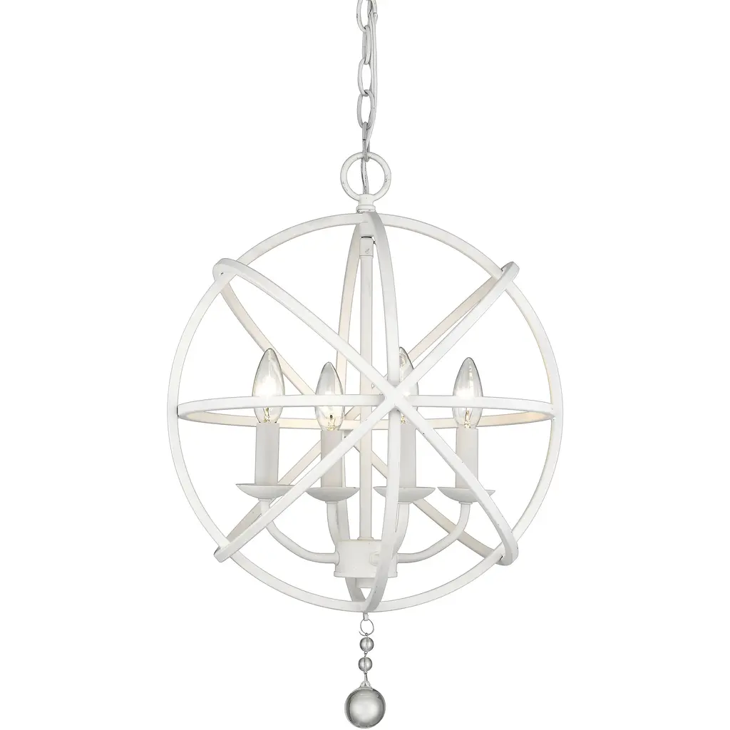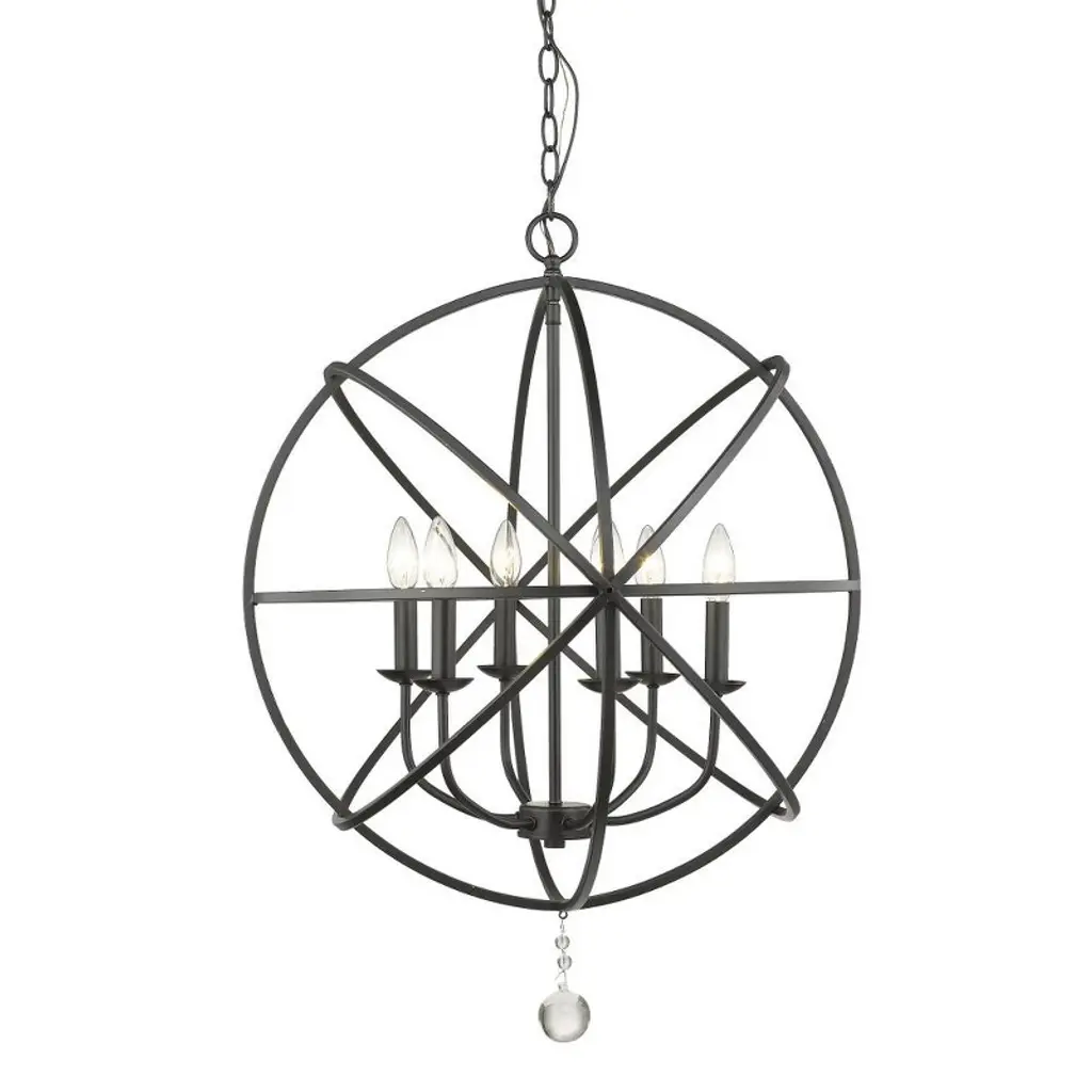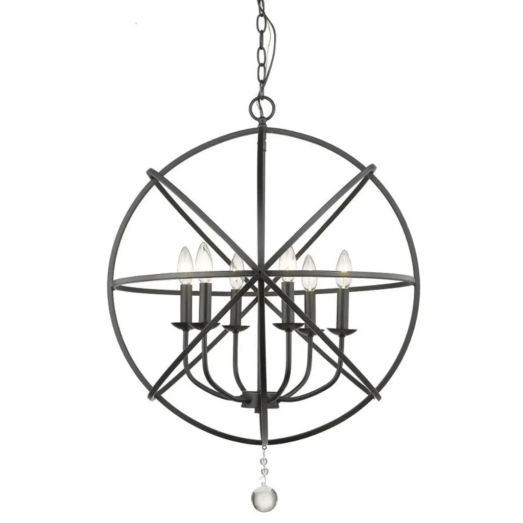 Make this transitional six-light chandelier the center of a custom designed space, and enjoy its atomic-inspired silhouette that adds an upbeat ambiance. A matte black steel frame becomes personalized as you choose finishes for its frame interior, finials, and candelabra bulb bases. Room Recommendation: Dining Room/Foyer/Great Room/Hallway/Kitchen Chain Length: 72.00 Dimmable: Yes