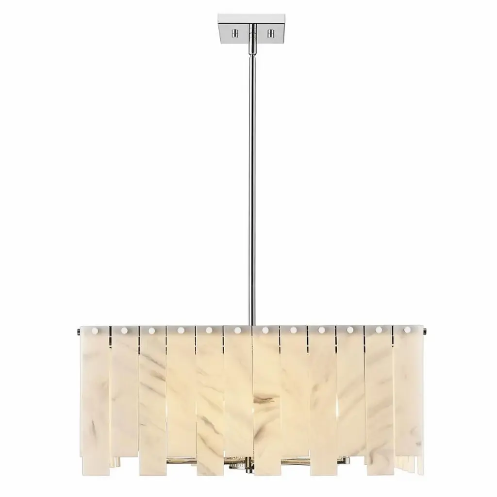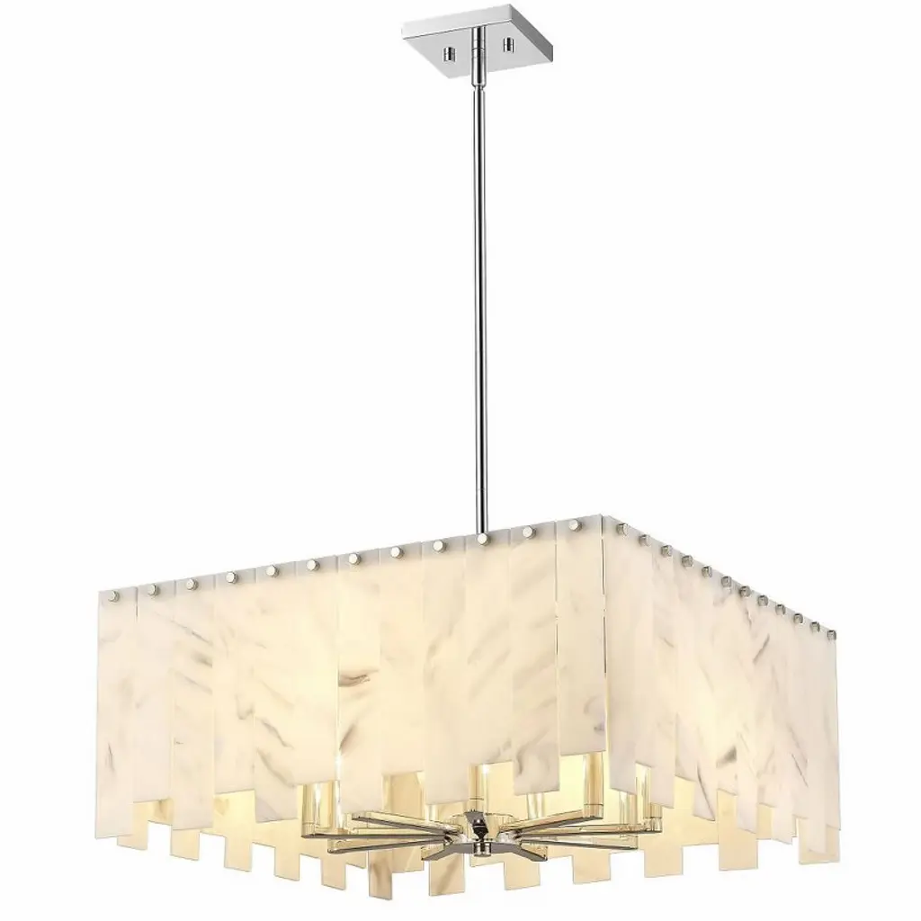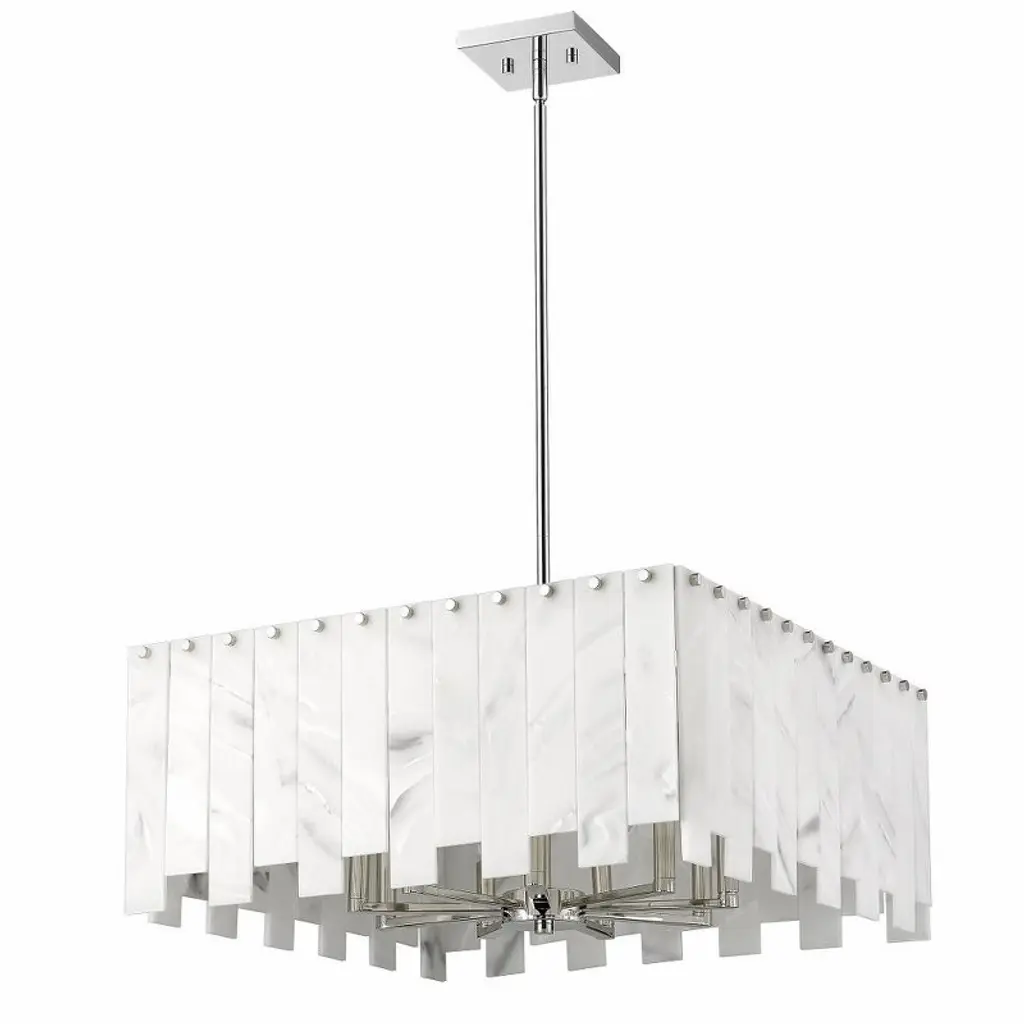 Fashion a compelling décor boost in the form of an Art Deco influenced fixture with gallery inspiration. Choose this decadent eight-light pendant from the Viviana collection to offer both easy palette elements and a chic look with alabaster-like strips alternating in length and arranged around a rectangular polished nickel finish steel frame. Whimsical rivot detailing adds an industrial feel to this pendant that goes with the flow as it complements a gritty rendition of toned-down glam in a kitchen or entryway.