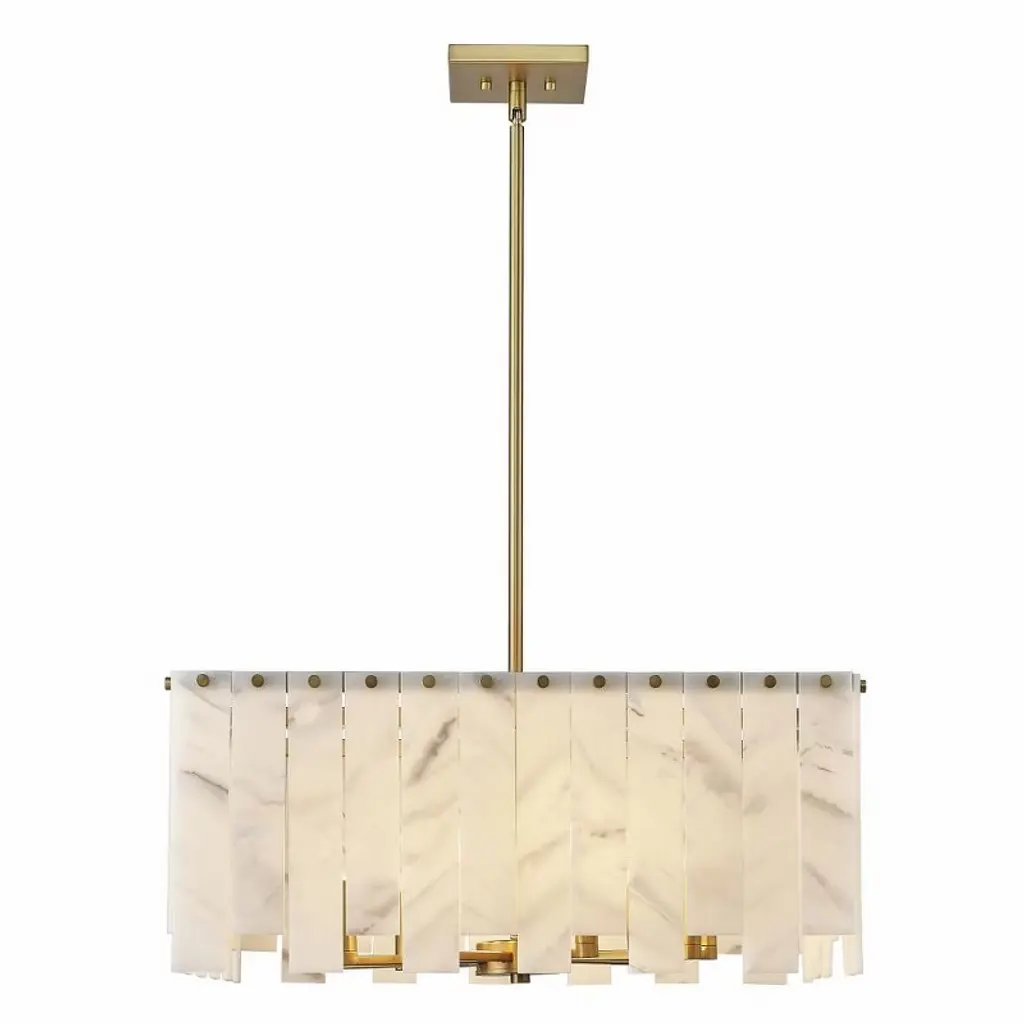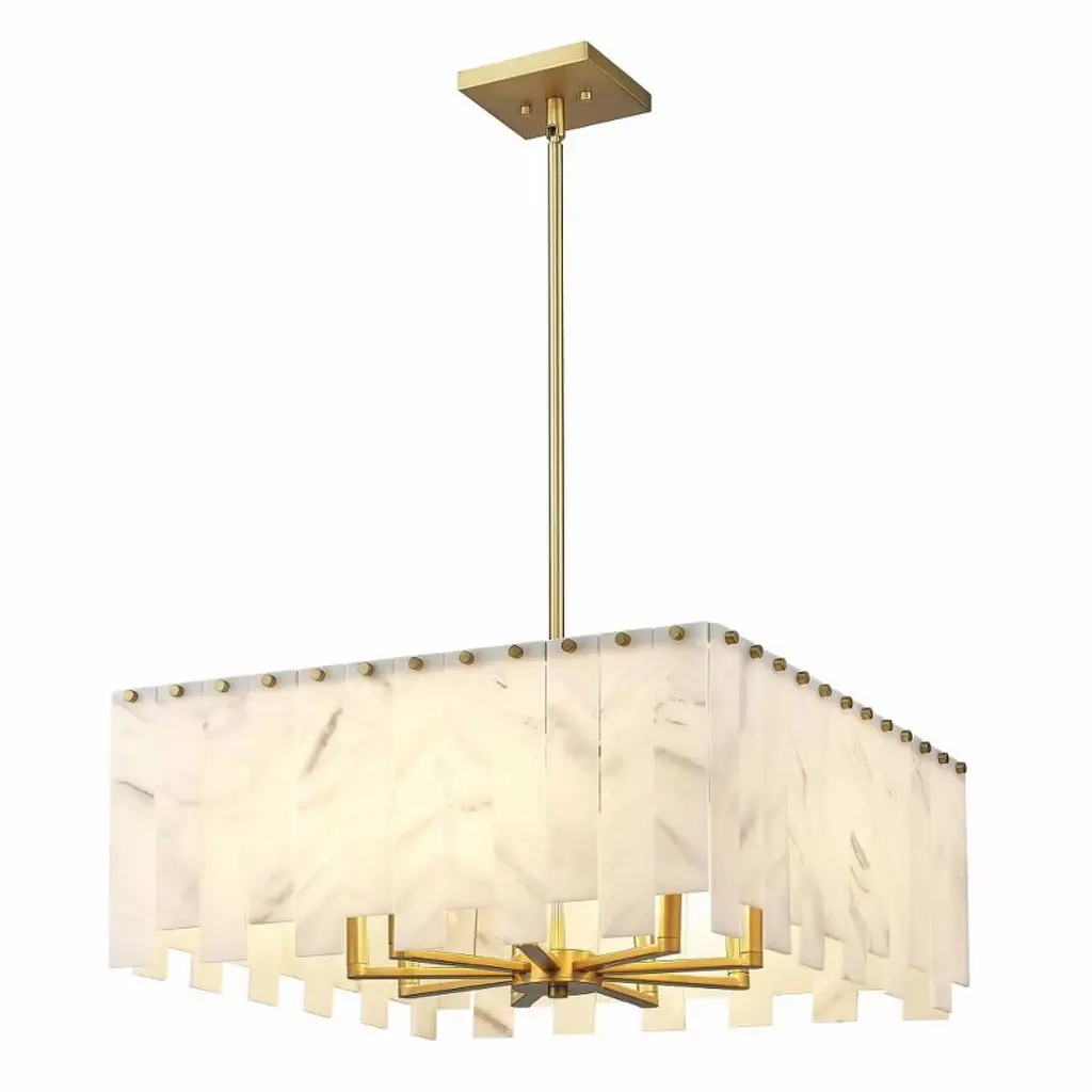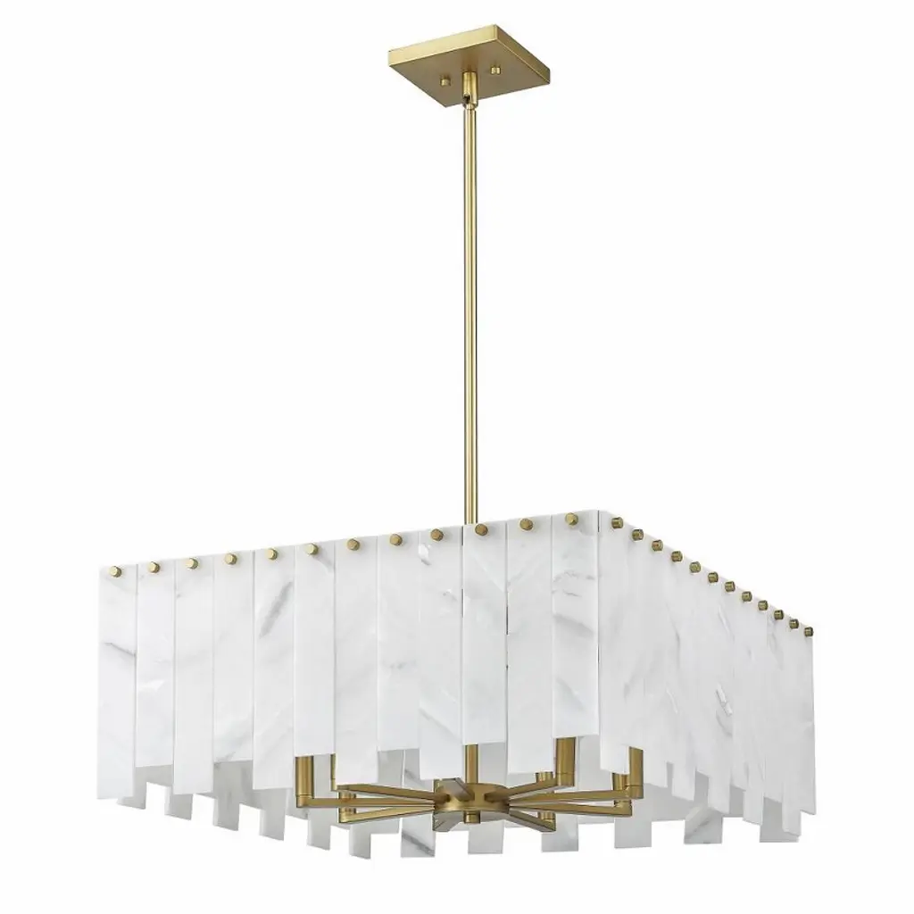 Fashion a compelling décor boost in the form of an Art Deco influenced fixture with gallery inspiration. Choose this decadent eight-light pendant from the Viviana collection to offer both easy palette elements and a chic look with alabaster-like strips alternating in length and arranged around a rectangular polished nickel finish steel frame. Whimsical rivot detailing adds an industrial feel to this pendant that goes with the flow as it complements a gritty rendition of toned-down glam in a kitchen or entryway.