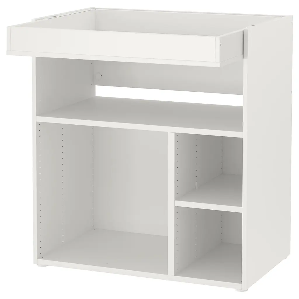 SMÅSTAD Changing table - white with frame/with 3 drawers 35 3/8x31 1/2x39 3/8 ". Comfortable height for changing the baby. Practical storage space within close reach. You can always keep a hand on your baby. The fixed shelf below the changing table can be attached to the right or to the left.