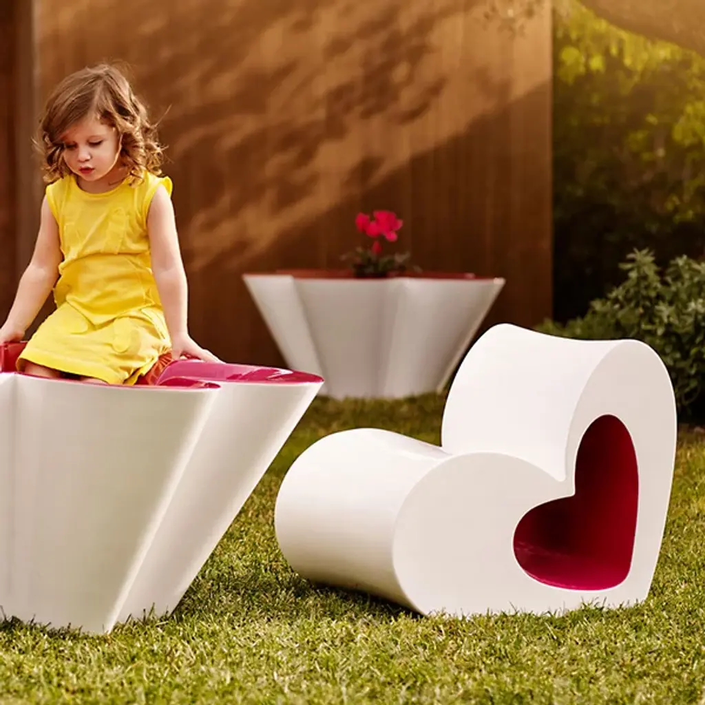Freshness, innocence and spontaneity bring Agatha, Vondom's first kid's collection, to life. Agatha Kids Chair takes on the shape of a heart and uses a cut-out in the center to add to its playfulness. Agatha Kids Collection consists of three basic elements; a pot, table and chairs all taking on optimistic and creative shapes in hearts and flowers, creating a dream garden for children. The highly resistant polyethylene body is lightweight, impact-resistant, and protected against environmental damage.