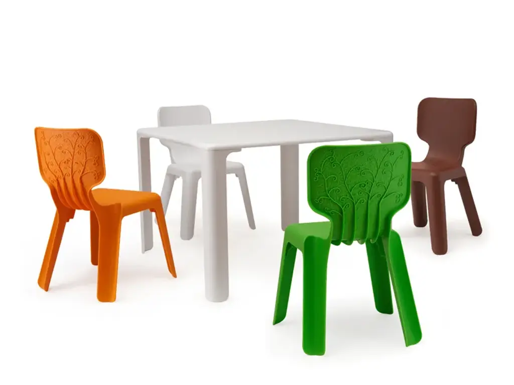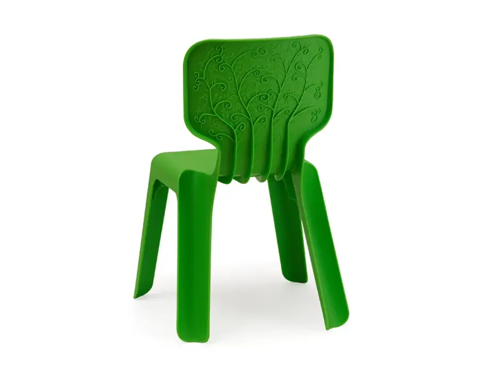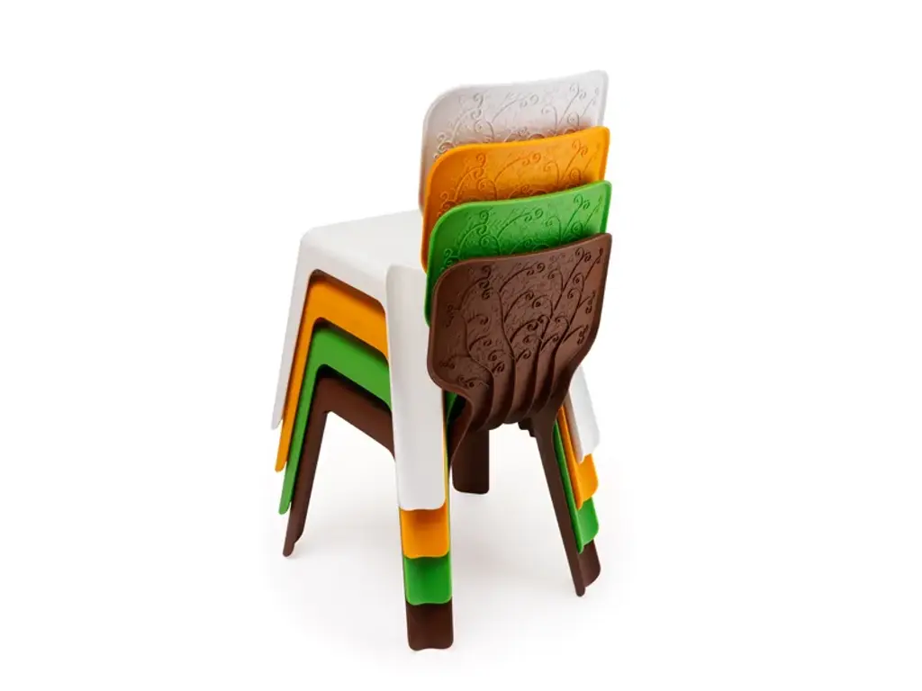 Stacking children’s chair. Material: polypropylene with glass fibre added. Standard injectionmoulded. Suitable for outdoor use.