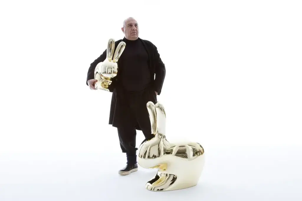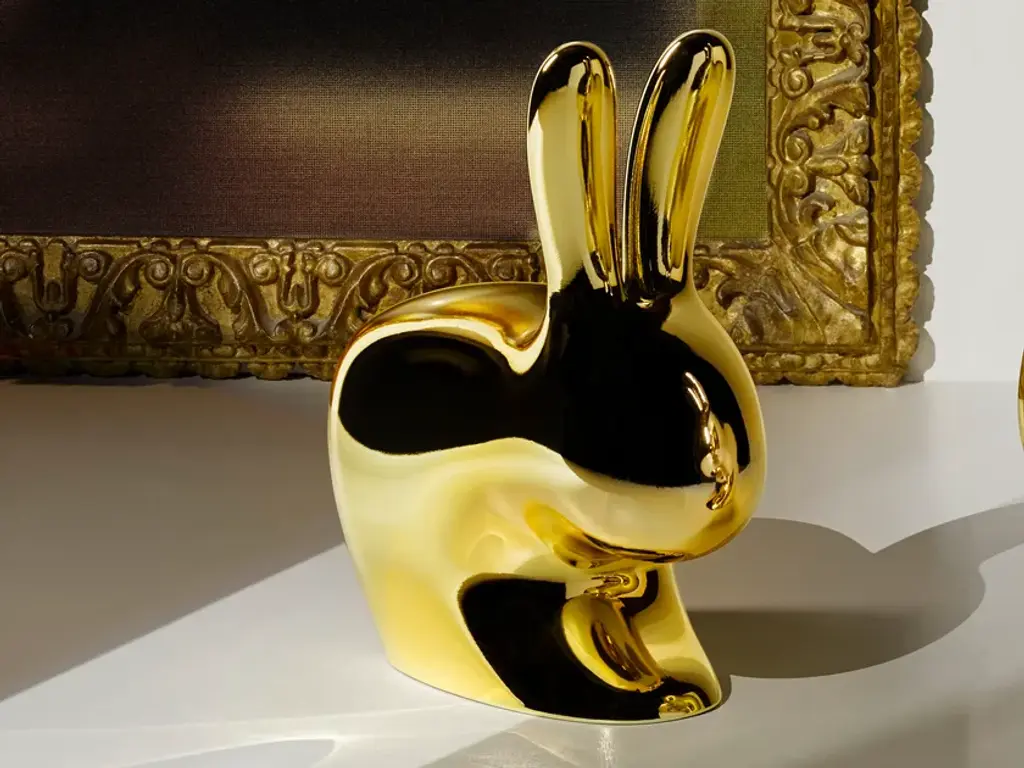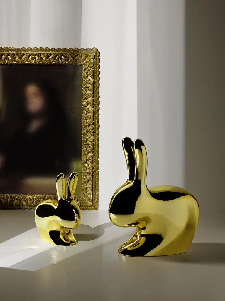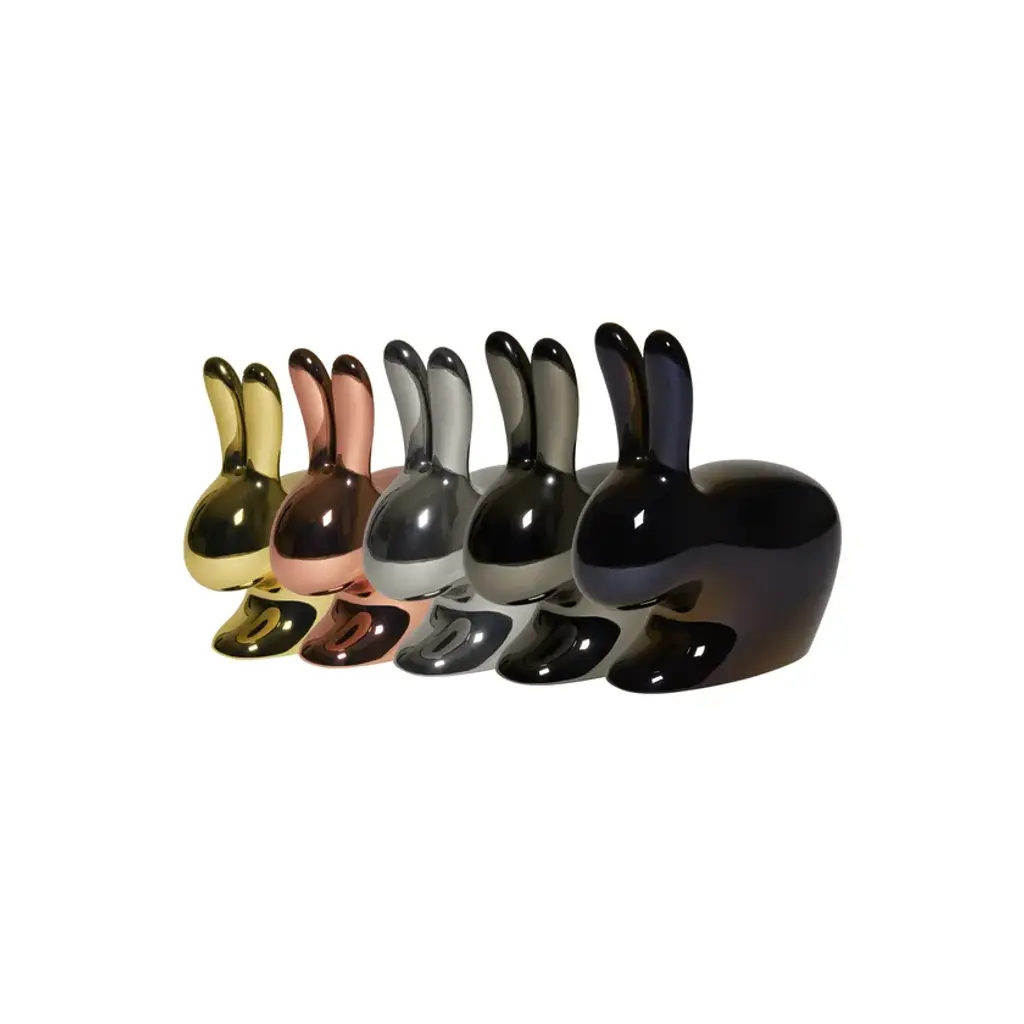 RABBIT METAL BABYMaterial: Polyethylene metallizedColors: gold, steel, titanium, black pearl, copperGold Illuminated version availableAvailable for indoor and outdoor.Rabbit is one of Stefano Giovannoni’s hat tricks, which immediately became a pop icon, a symbol of love and fertility, which brings good luck and good wishes.The idea of the rabbit, a gentle, lovable and shy animal, comes from the association of its silhouette with the one of a seat, where the rabbit’s ears become the backrest of the chair.Designed originally in two versions, for adults and children, the Rabbit chair can be used to sit leaning against the ears or on the opposite side, riding it and resting the forearms on its ears. The two rabbits are also available in the LED light version suitable for both indoor and outdoor use.Most recently the family has seen the introduction of an XS size as well (22.5cm high) sold in three different versions: LED lamp, doorstopper and velvet finished bookend.