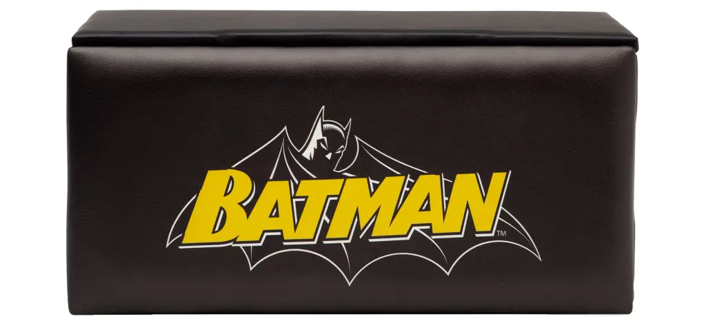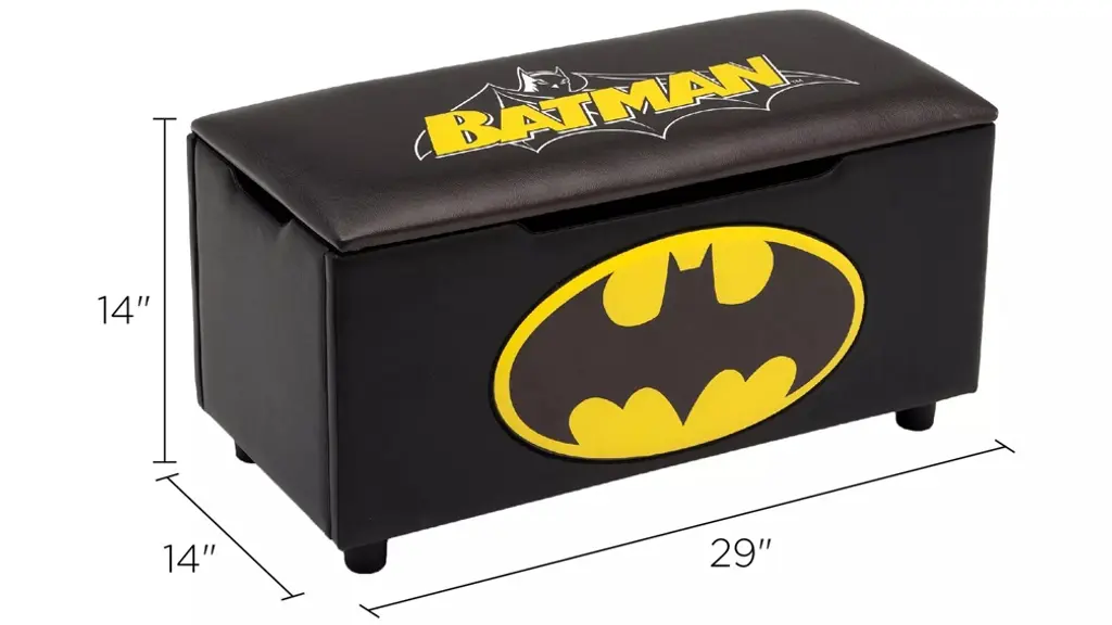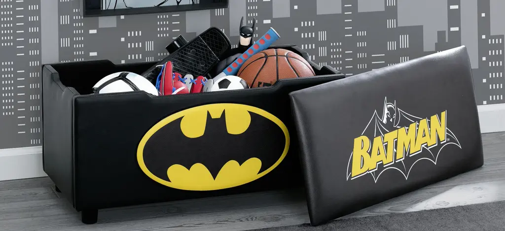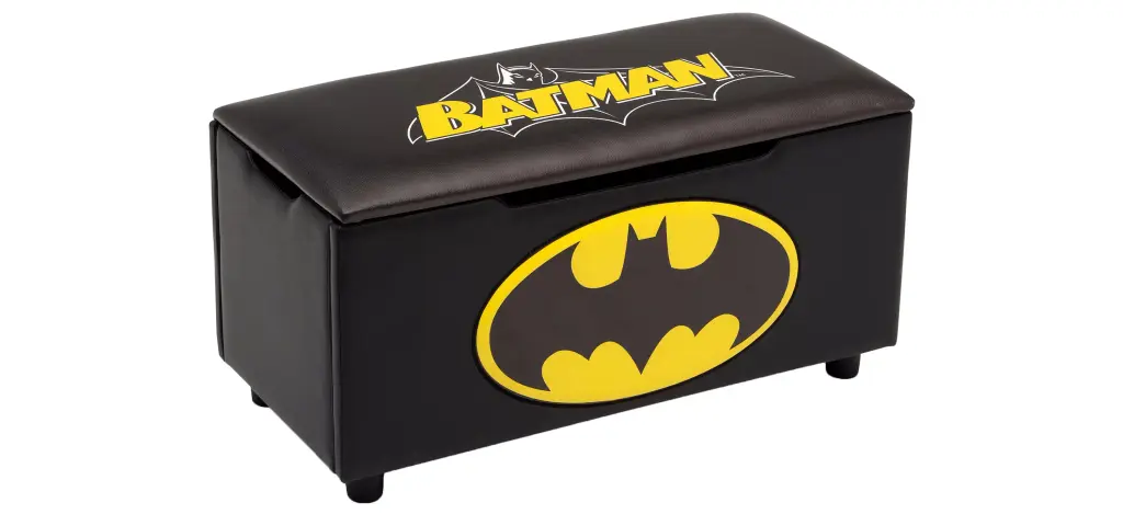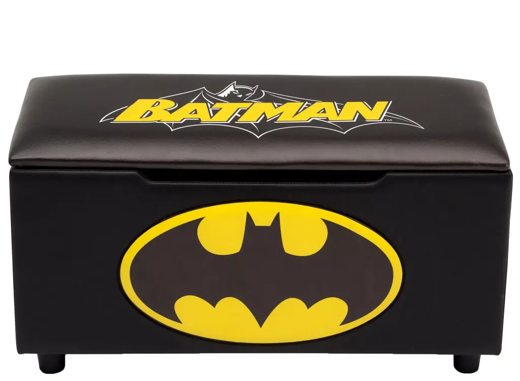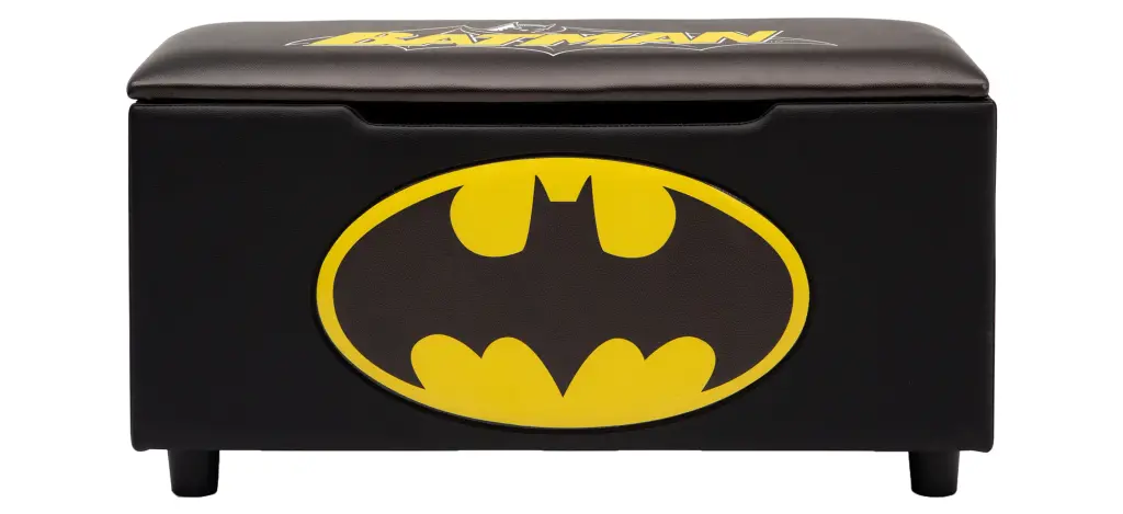 The Caped Crusader will be on the scene in the playroom, bedroom or living room with this DC Comics Batman Upholstered Storage Bench by Delta Children. The bold, 3D appliqued Bat Signal will light the way to comfy, practical seat while the durable, wood frame and fully upholstered construction ensures it's built to last. Use it at the foot of your child's bed, in the playroom or the living roomno matter how you use it, this fully upholstered bench has you covered. For added functionality, the plush padded top of this bench opens to reveal tons of storage for toys, blankets or games. More than just the protector of Gotham City, Batman is now ready to provide a versatile seating option where you can put on shoes or just kick back and relax.