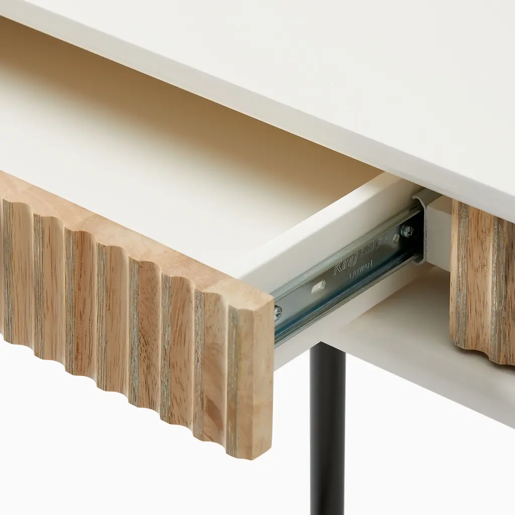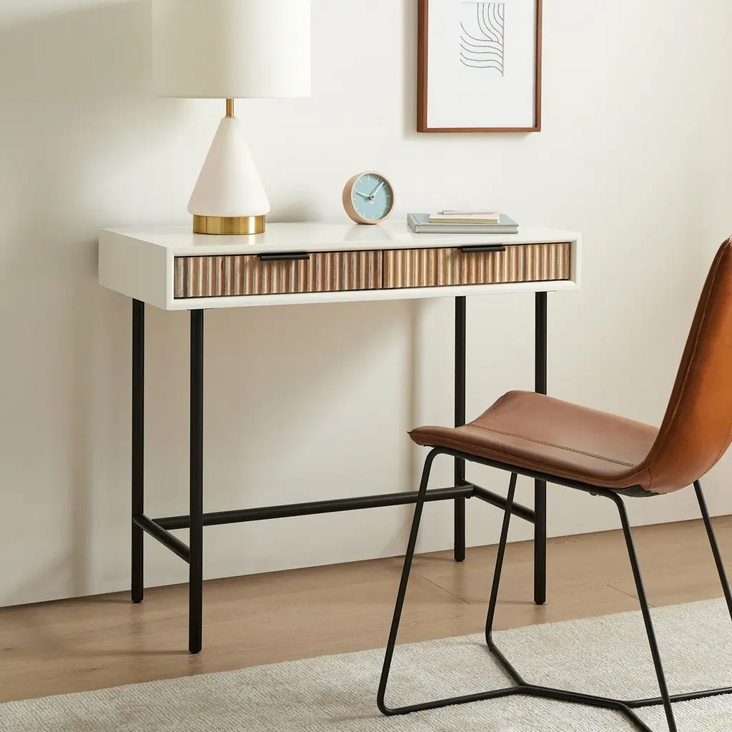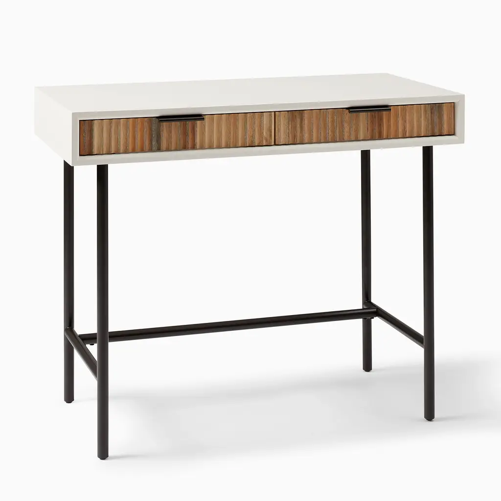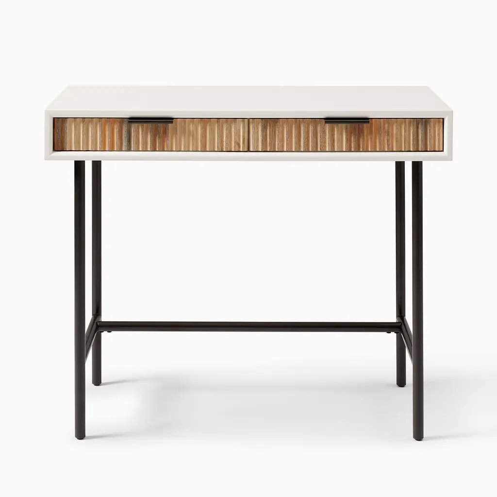 Bright and glamorous, our Quinn Mini Desk stands out with textured drawers and lofty metal legs. Made from extra strong kiln-dried wood and covered in a water-based finish, this desk's small scale fits nearly anywhere.
