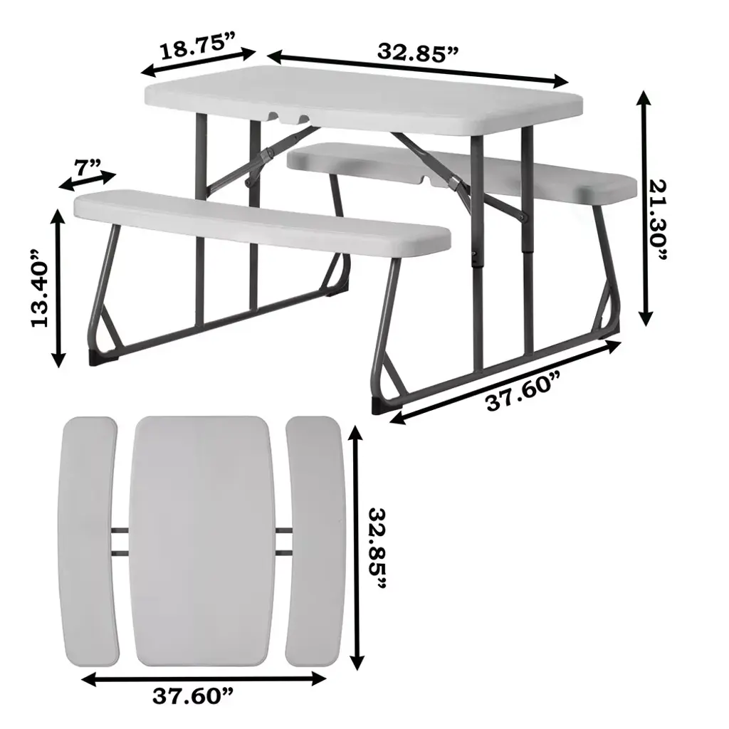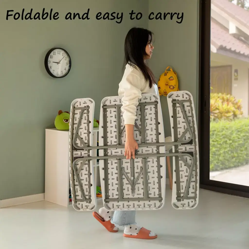 This foldable white children's picnic table is the perfect outdoor solution for your kids' crafting, dining, and playtime needs! It's made with a durable plastic tabletop and seats, and a sturdy metal frame, with a weight capacity of 330 lbs and seating for 4 kids. The plastic material is easy to clean and maintain, making it a practical choice for outdoor activities that involve spills, stains, and messes. The foldable design allows for easy storage and transport, making it a convenient option for families who love to spend time outdoors. Whether you're planning a picnic, a backyard BBQ, or a day at the park, this foldable white children's picnic table is the perfect addition to your outdoor gear. This picnic table is designed to provide a comfortable and safe space for your children to enjoy various outdoor activities, from snacking and crafting to playing games and socializing with friends. The sleek white finish adds a touch of style and sophistication to any outdoor setting, making it a perfect fit for your backyard, patio, or garden. Overall, this picnic table is a practical, functional, and durable outdoor furniture piece that encourages your children to stay active and creative.