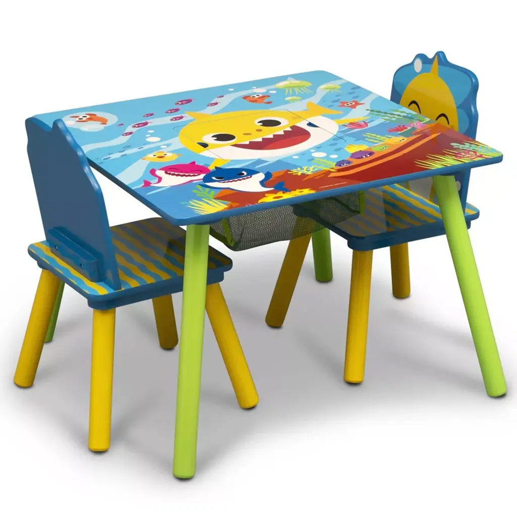 You've heard the Baby Shark song... now you can bring the Baby Shark family into your home this Baby Shark Kids Table and Chair Set with Storage by Delta Children. Featuring character graphics of Baby Shark, Mommy Shark, Daddy Shark, Grandma Shark and Grandpa Shark, this table and chair set is totally jaw dropping. Making any activity extra-special, this kids table and chair set features a table and two chairs, designed at the perfect kid-sized height, making it ideal for snack time, playtime or homework. Plus, a built-in storage compartment at the center of the table provides the perfect space to keep art supplies. About Baby Shark: Baby Shark and his best friend William take fun-filled comedic adventures in their community of Carnivore Cove, meeting new friends and singing catchy tunes along the way. Baby Shark, Doo, Doo, Doo, Doo, Doo, Doo.