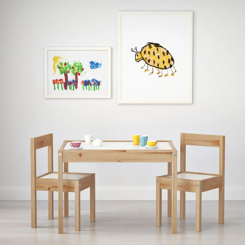 LÄTT Children's table and 2 chairs - white/pine. Its small dimensions make it especially suitable for small rooms or spaces. Product is possible to recycle or use for energy recovery, if available in your community.