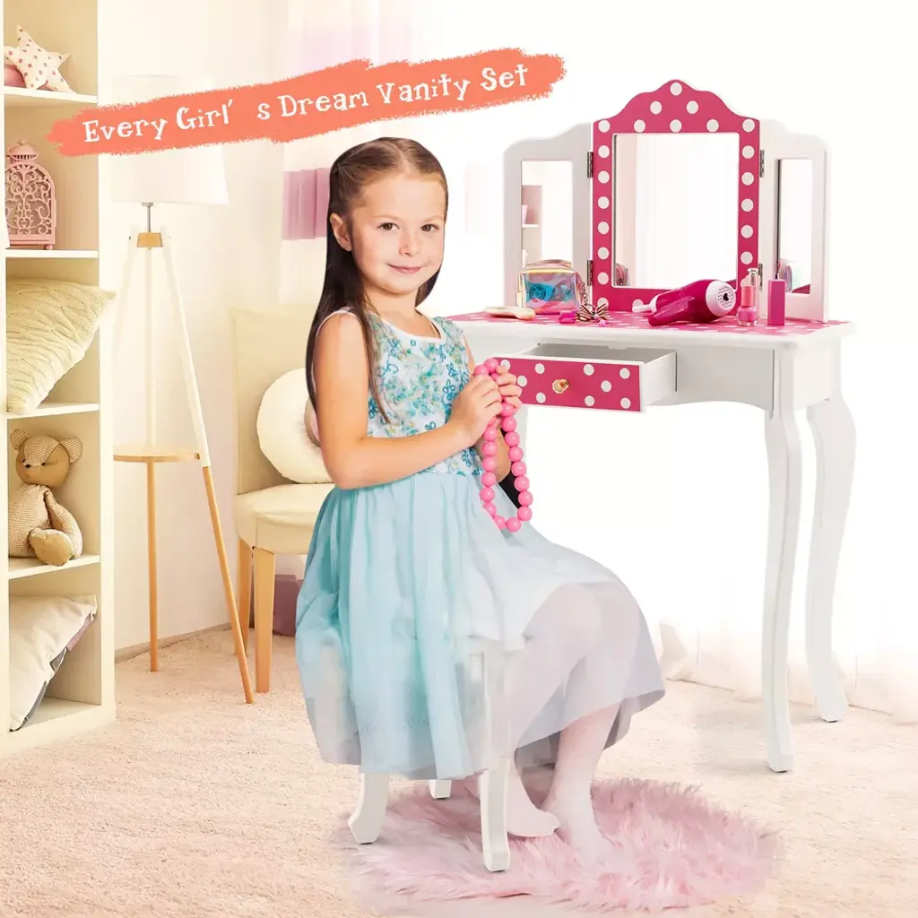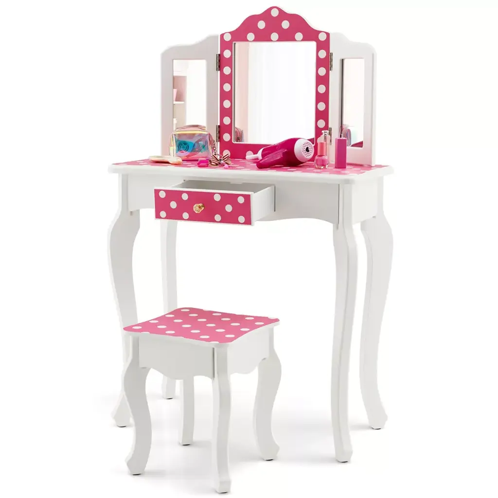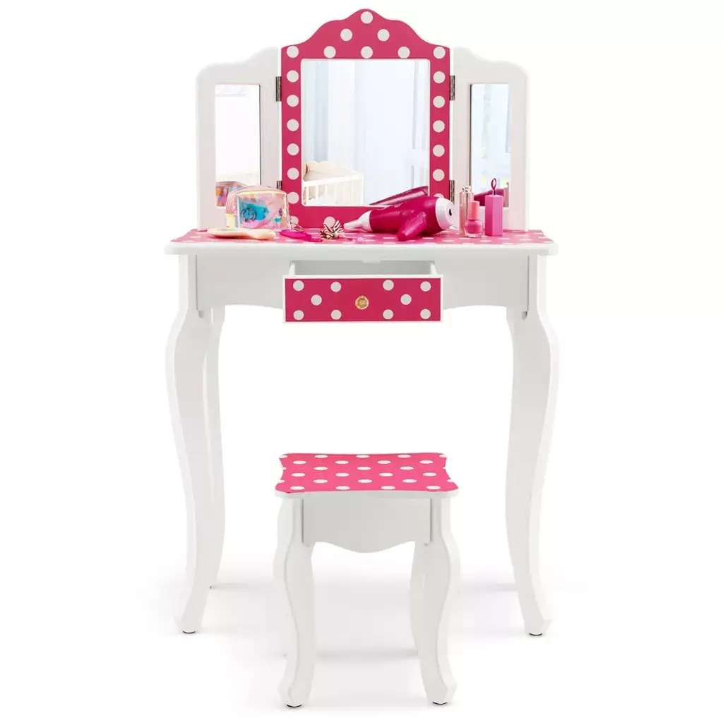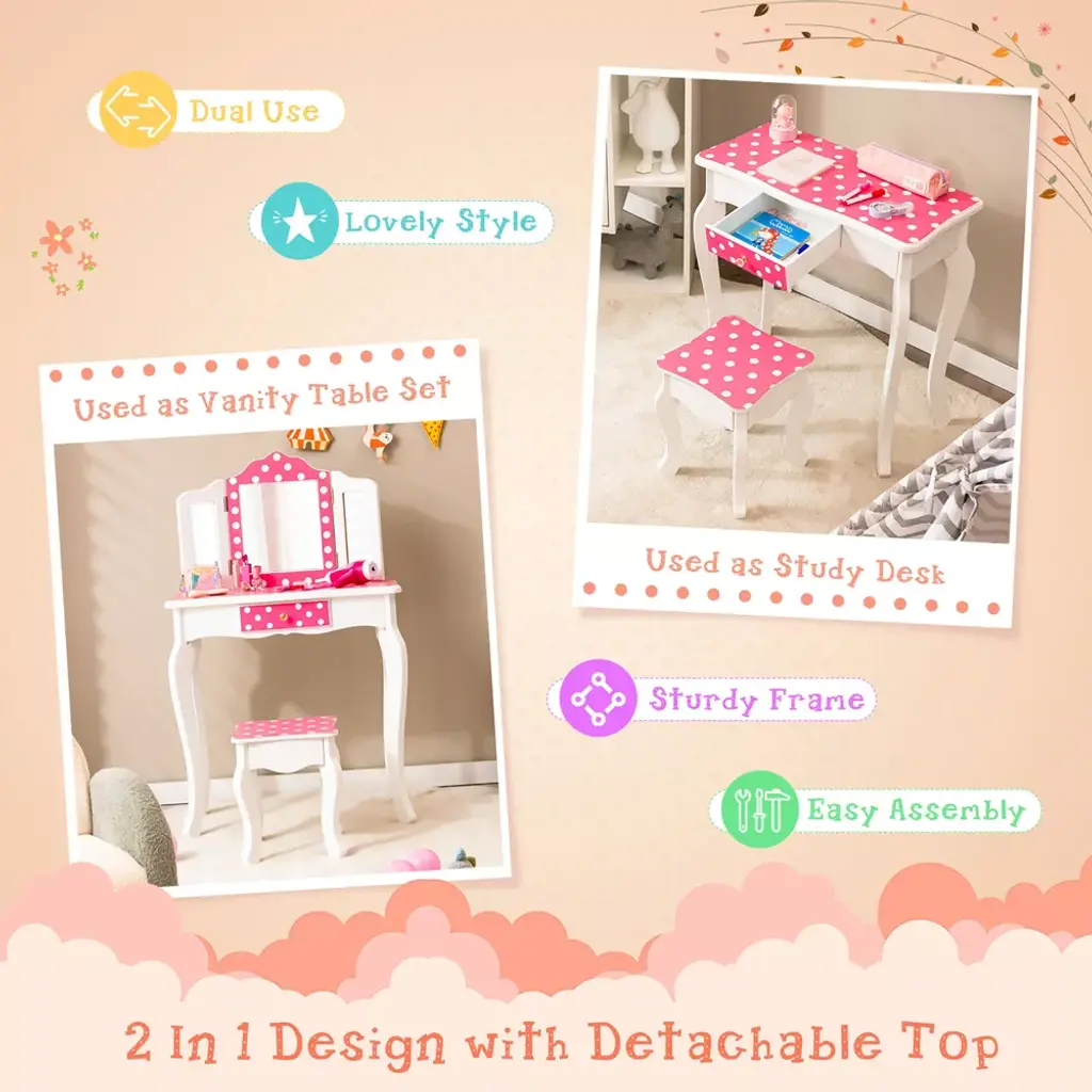 Let kids enjoy happy makeup time with our special vanity table set! The kids dressing table set with high-definition tri-fold mirror will enable kids to do delicate makeup easily. Remove the top, and the vanity table turns into a study desk, which allows kids to write or read. Besides, large-capacity drawer provides extra space for your little one's makeup, toys, books and personal items. Decorated with polka dot details, this charming dressing table will be the perfect addition for kids' bedroom.FeaturesCharming design with pink finish and polka dot details Remove the top to turn the vanity table into study desk Tri-folding real mirror reflects kids' faces from all angles Made of premium MDF board for firmness & durability Heavy-duty curved legs for higher load-bearing capacity Large drawer for storing hair ties, combs, and trinkets Anti-tipping design and non-slip foot pads for stability Ideal addition to living room/kids' bedroom/playroom Smooth and waterproof surface is easy to wipe cleanPattern: Pink Polka Dot Pattern Material: P2 MDF, Paint, Glass Table Dimensions: 24'' x 11'' x 38.5'' (L x W x H) Stool Dimensions: 10'' x 10'' x 12'' (L x W x H) Drawer Dimensions: 9'' x 7'' x 3'' (L x W x H) Center Mirror Size: 9.5'' x 8'' (L x W) Side Mirror Size: 8'' x 3'' (L x W) Height of Tabletop: 24'' Net Weight: 18.5 lbs Weight Capacity of Table: 66 lbs Weight Capacity of Stool: 110 lbs Suitable Age: 3-7 Years Package Includes: 1 x Kids Vanity Table 1 x Stool 1 x User's Manual