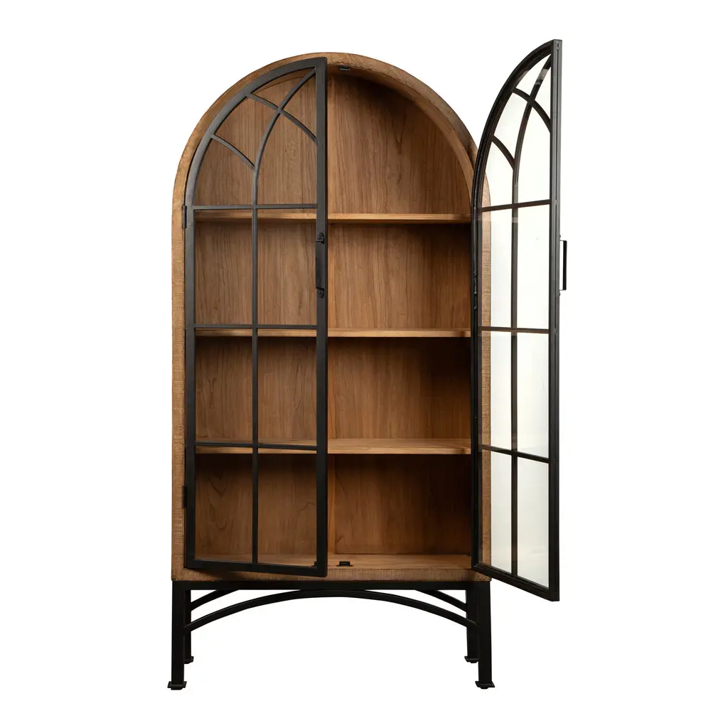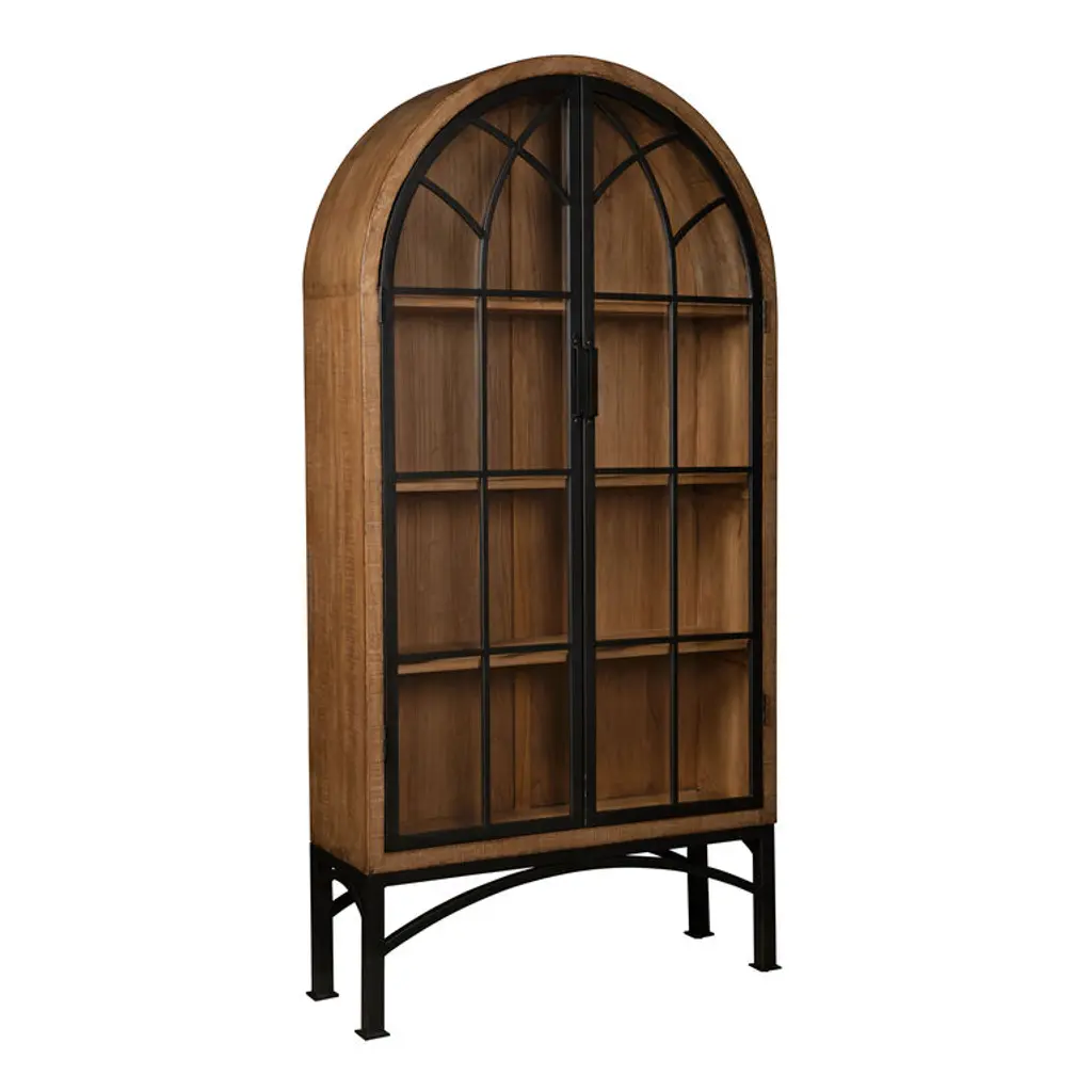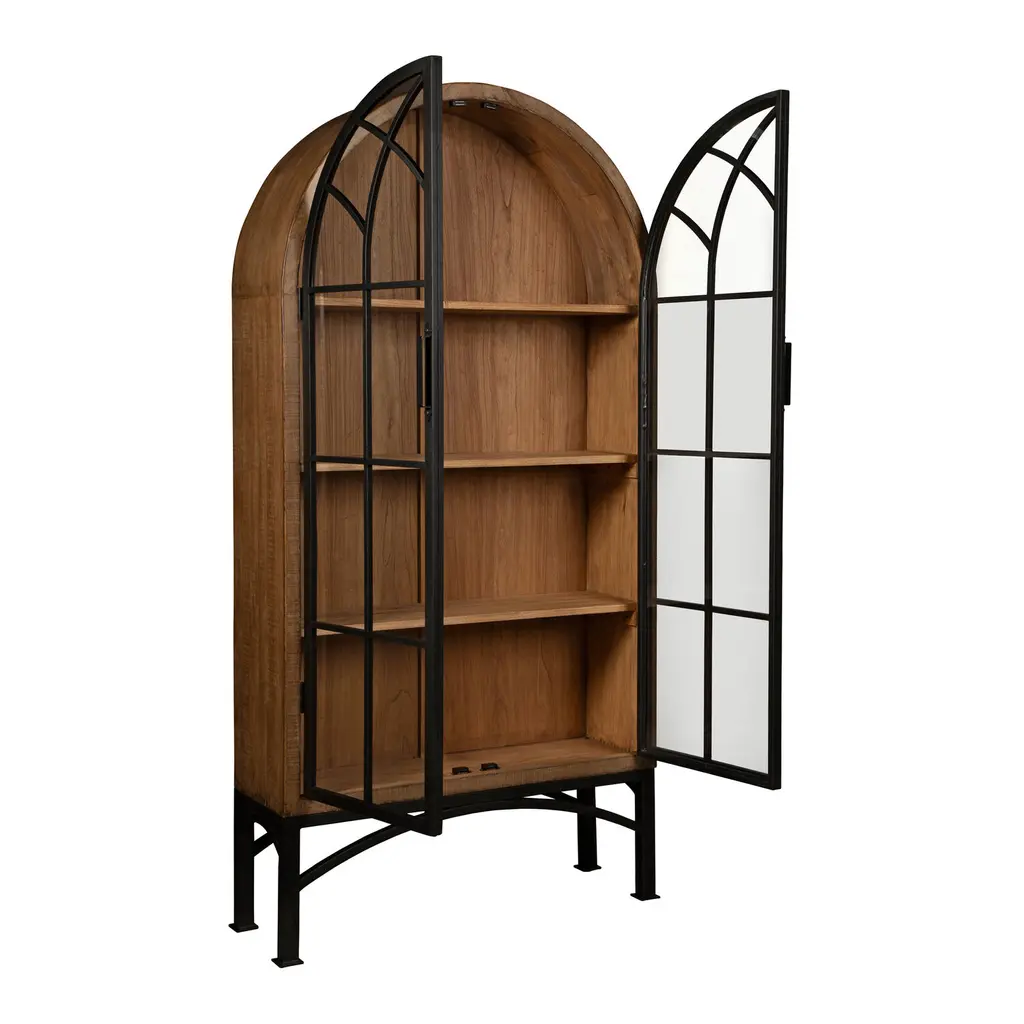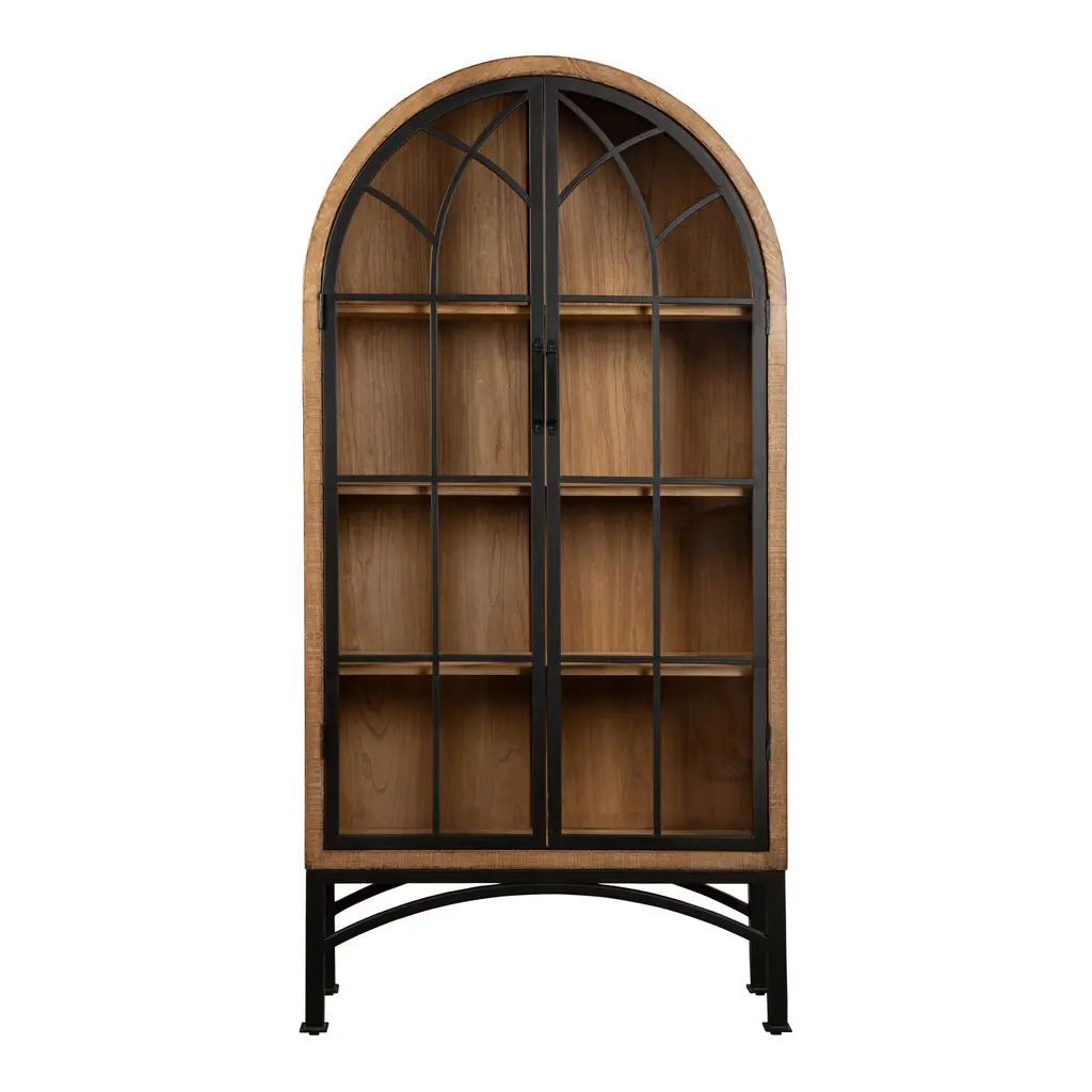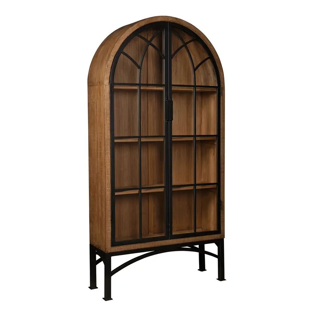 This robust, mixed-material storage cabinet displays books in an office, glassware in a kitchen or photos and decor in a living room. It's made of rustic reclaimed pine wood with removable shelves, a hand-forged iron base and cathedral windowpane framing on its glass doors. A one-of-a-kind work of natural art with unique variations in color and grain pattern, its reclaimed-wood construction guarantees that no two pieces are alike.