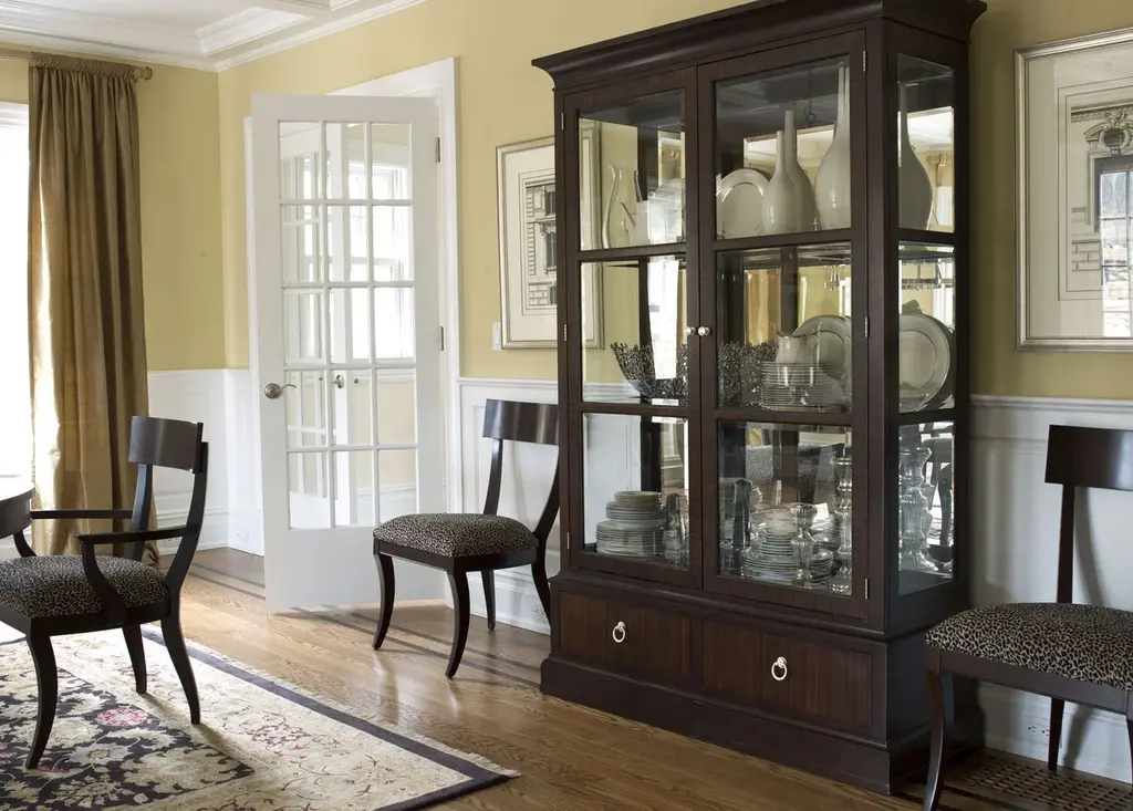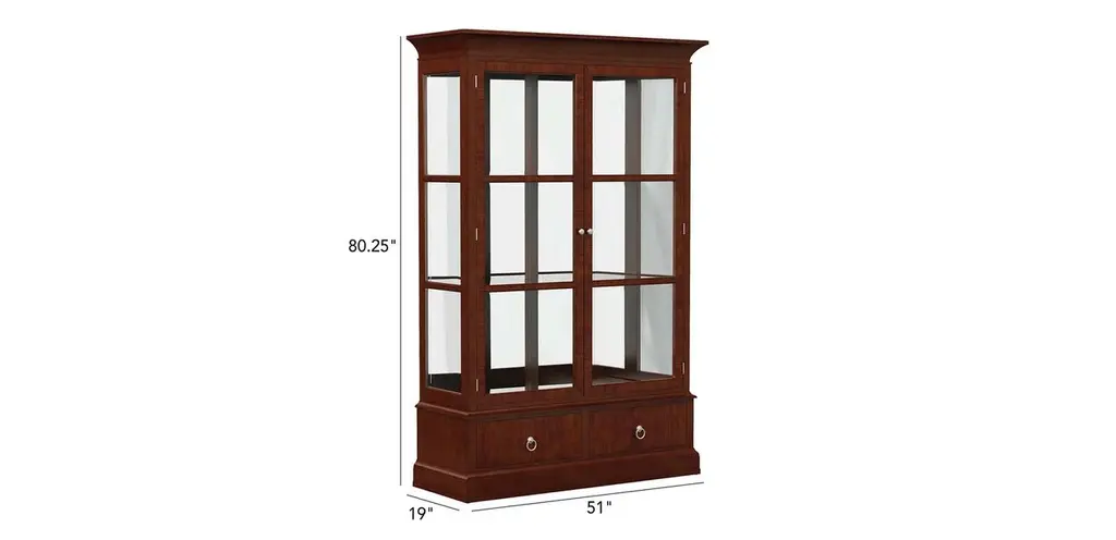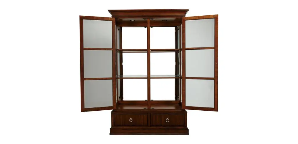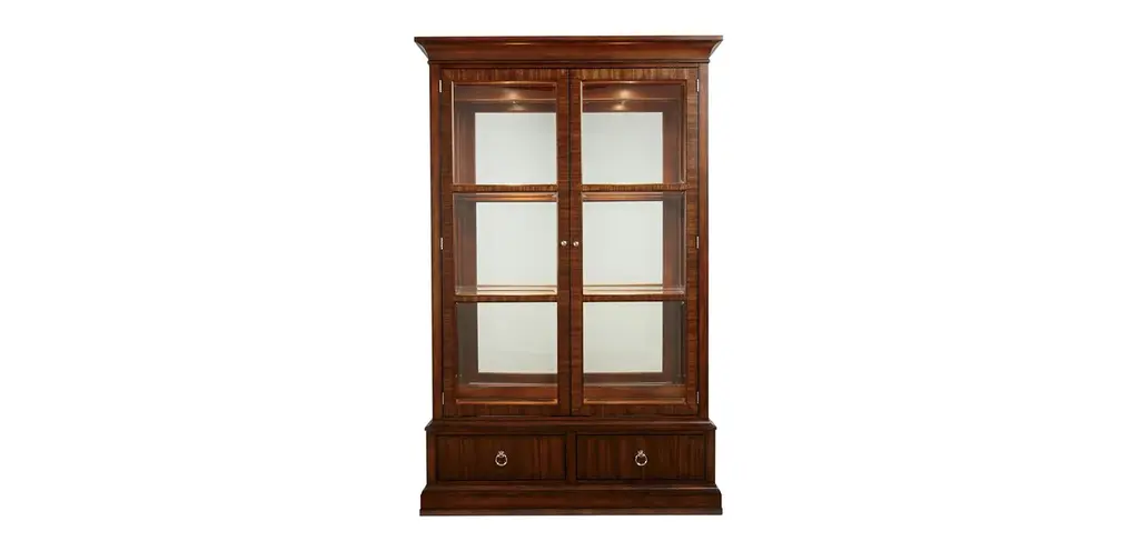 A star is born. Inspired by the refined glamour of days past with couture touches certain to survive the test of time. Beveled glass doors open to reveal two glass shelves set before a full mirror back panel. Beveled glass side panels and recessed rheostat lighting create a gallery display of what lies within. Two lower drawers offer hideaways for silverware and linens.