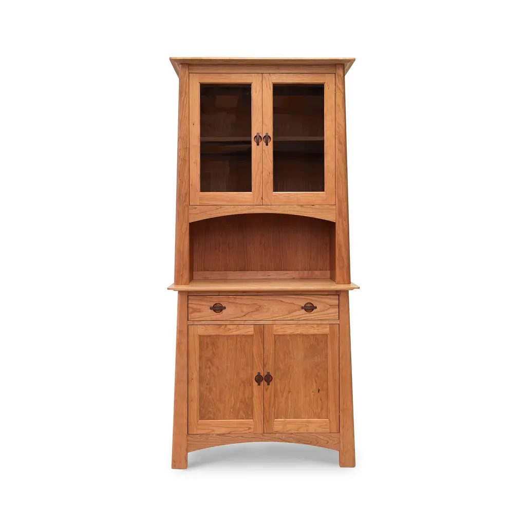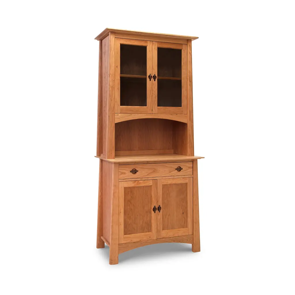 This small Cherry Moon China Cabinet and Sideboard is 38" in width and features just a touch of Asian style. Showcase your treasures in the top behind the two glass plated doors. This cabinet has one drawer and lots of underspace storage, making it a great addition to your luxury kitchen or dining room. We have carefully selected the finest natural hardwoods for your china cabinet to ensure the highest standards of quality!The bottom section of this buffet & hutch has 1 section with 1 adjustable shelf behind the set of doors. (1 adjustable shelf total).Base price represents buffet and hutch in natural cherry with natural walnut pullsShown in natural cherry with glass hutch doors and natural walnut pullsMatching furniture available in our Cherry Moon Furniture Collection