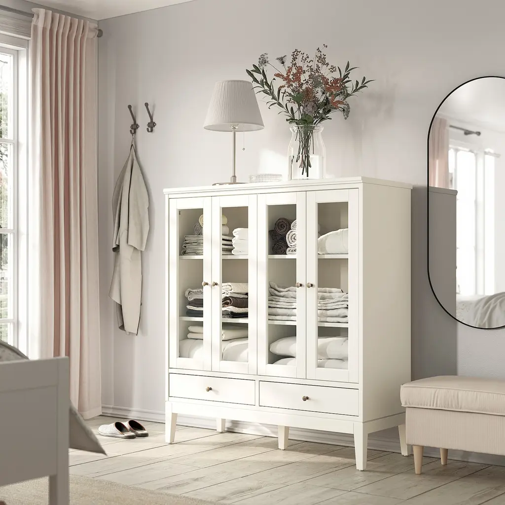 IDANÄS Cabinet with bi-fold glass doors - white 47 5/8x19 5/8x53 1/8 ". Create a coordinated home by combining this cabinet with other furniture from the IDANÄS series. Assembly is quick and easy, thanks to the wedge dowel that clicks into the pre-drilled holes.